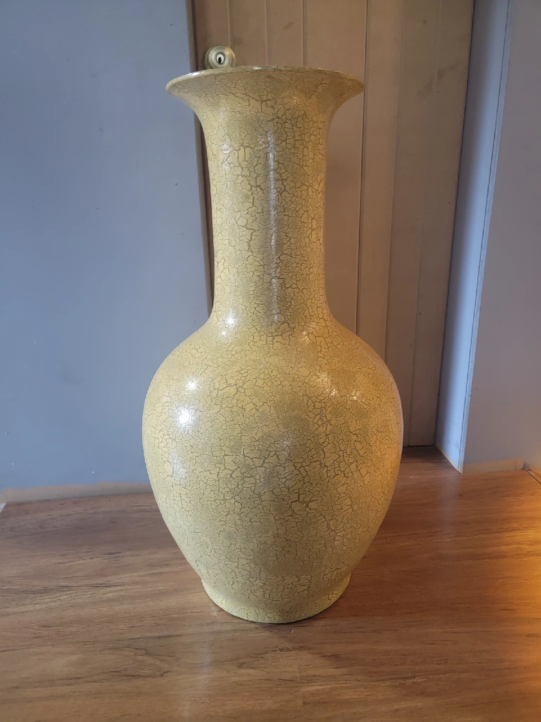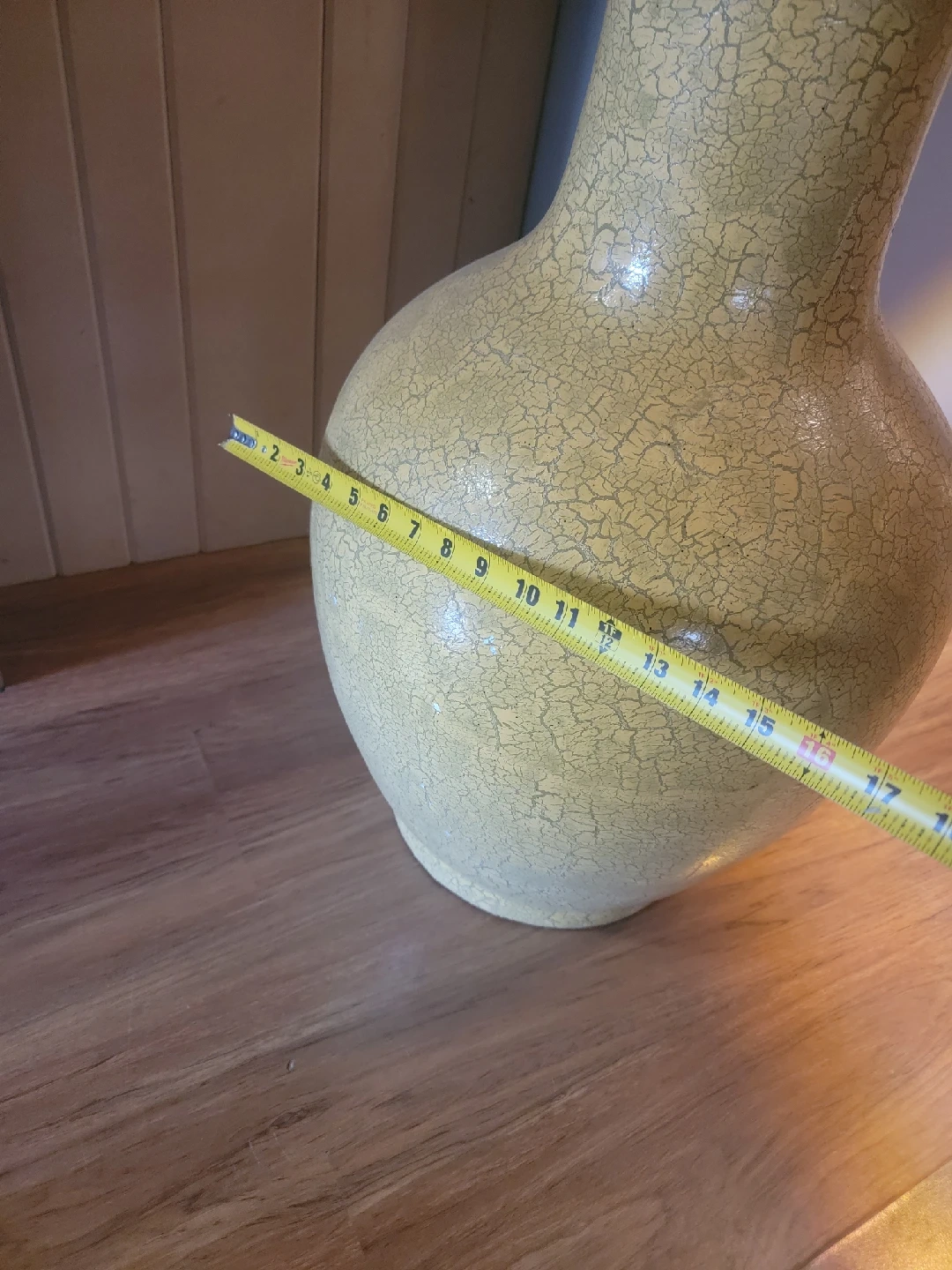 I'm selling a large decorative vase. It's about 39 inches tall and 17 inches wide. It has a unique cracked texture and would make a beautiful addition to any room