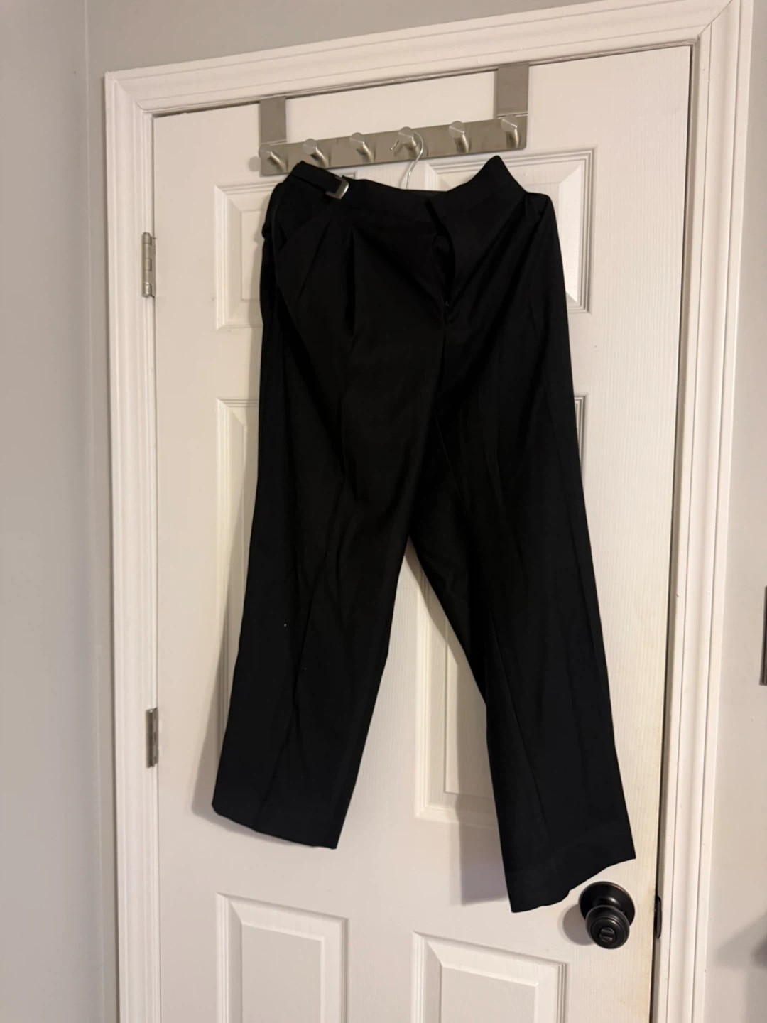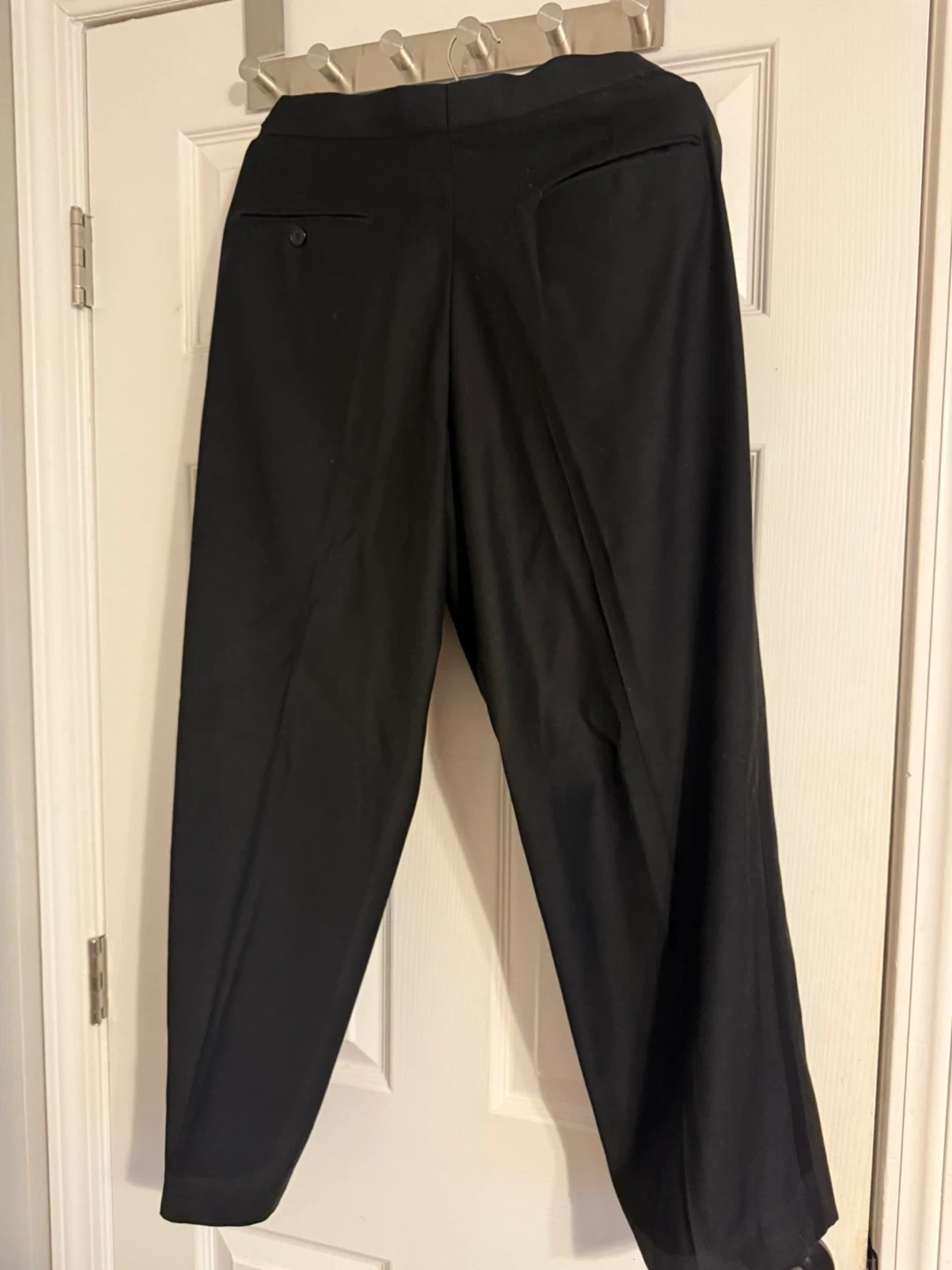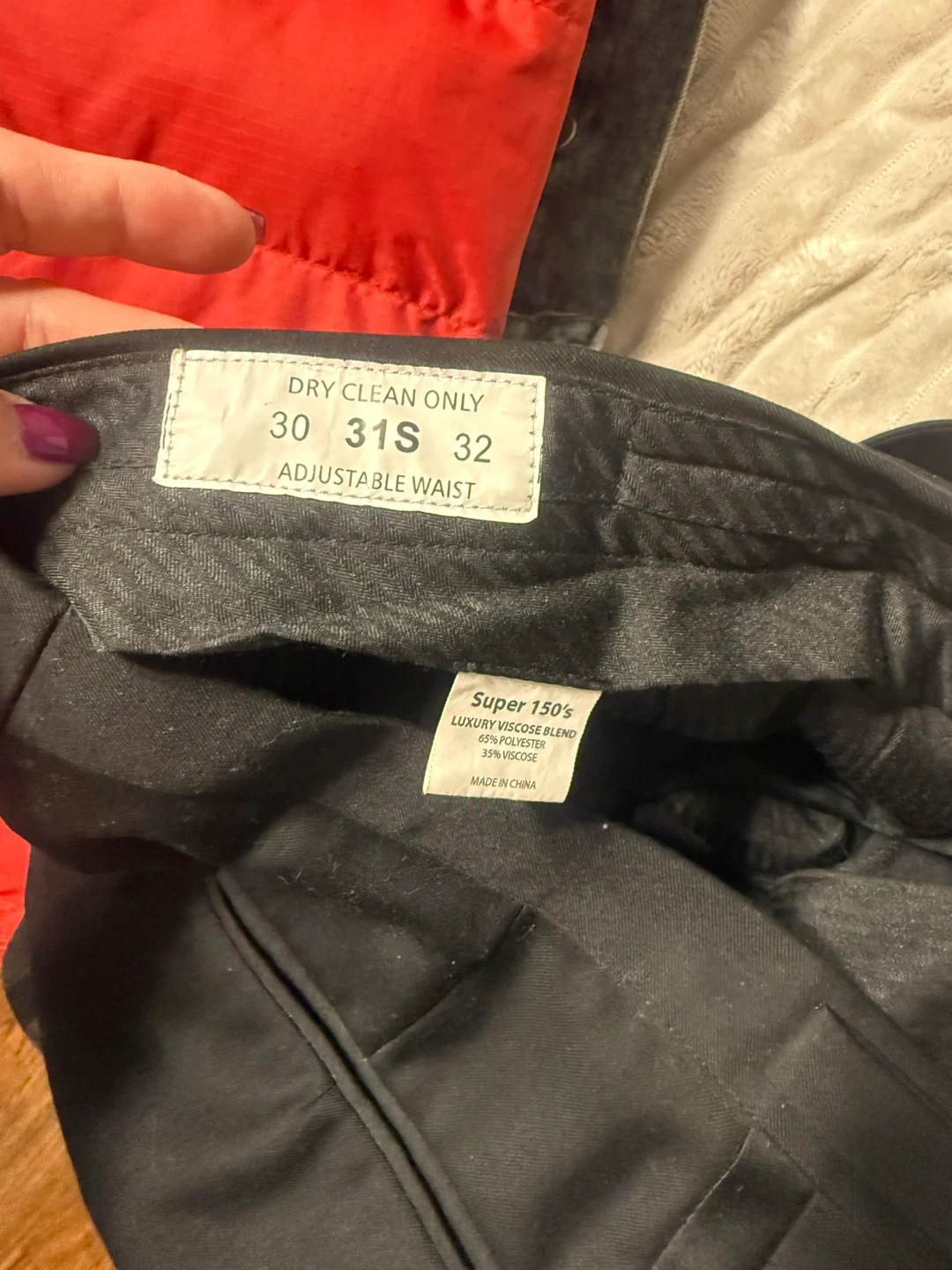 Selling a pair of black dress pants. They are size 30 or 31S with an adjustable waist. Made of a luxury viscose blend: 65% polyester and 35% viscose.