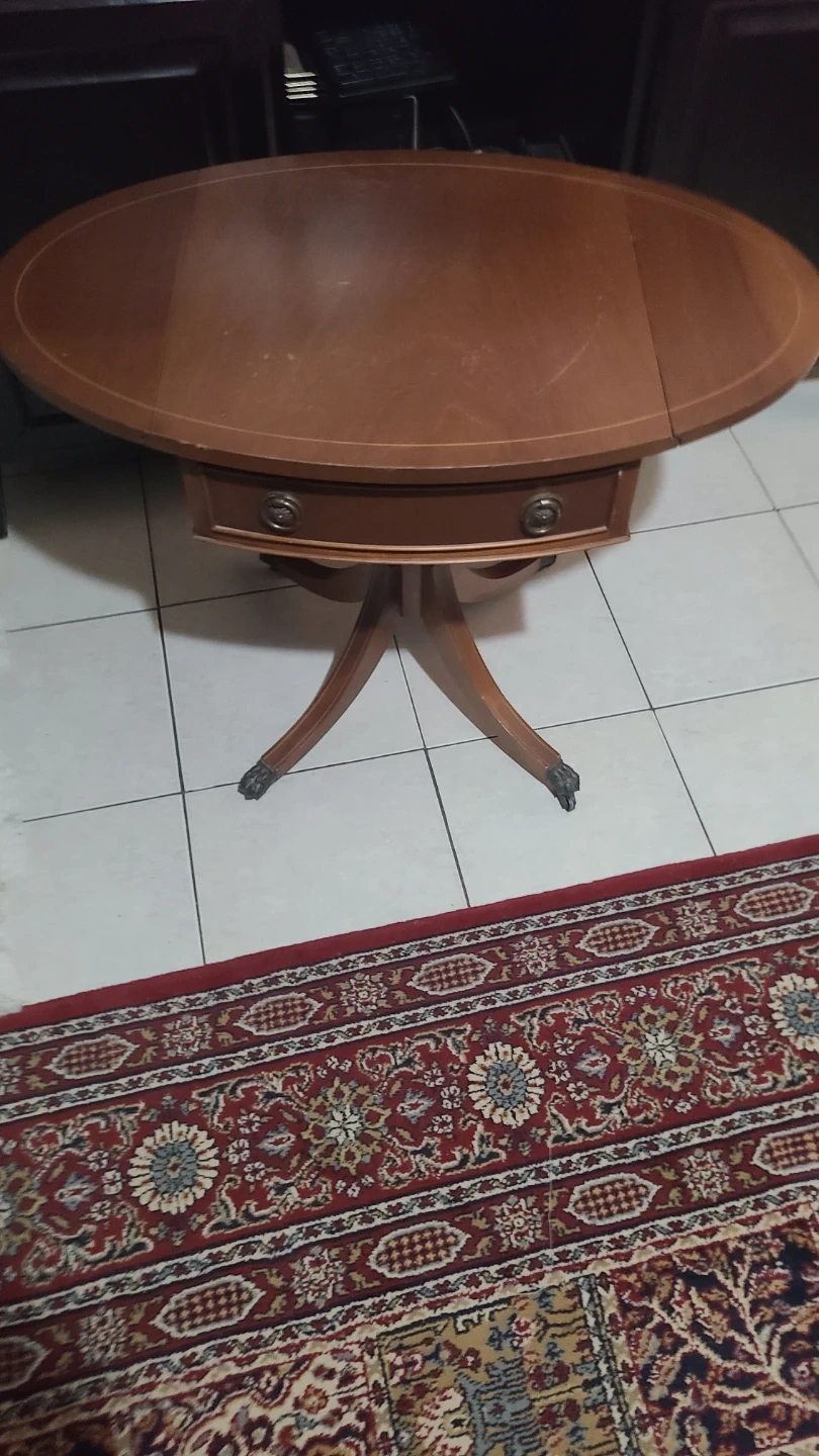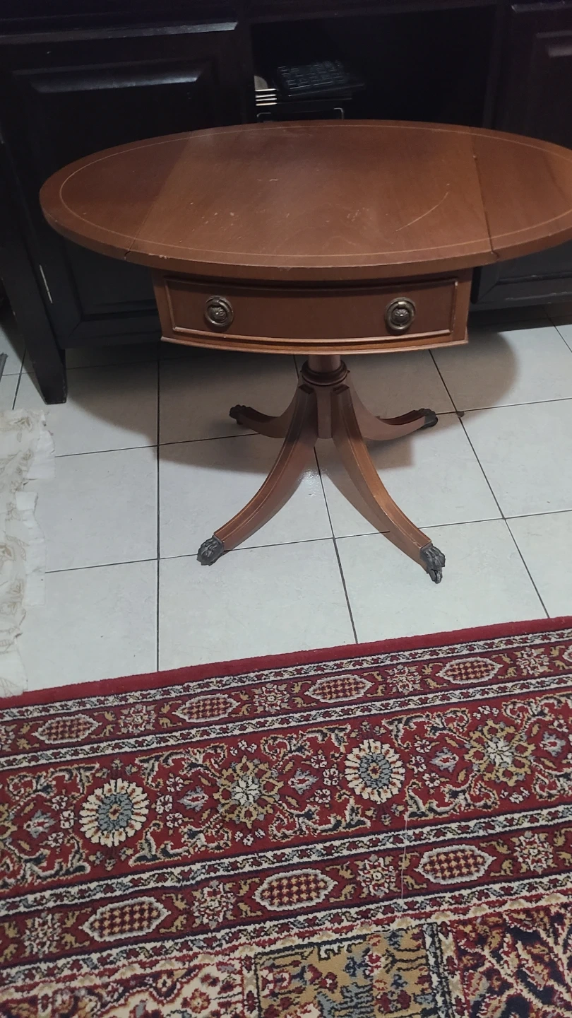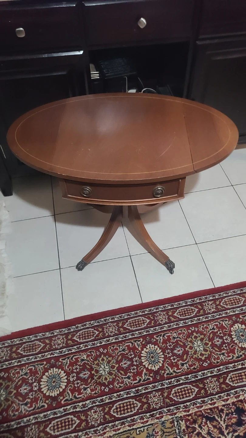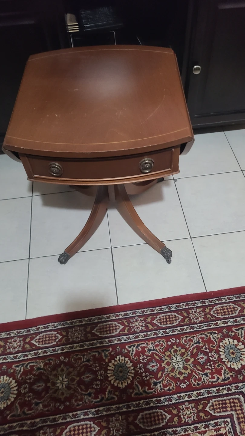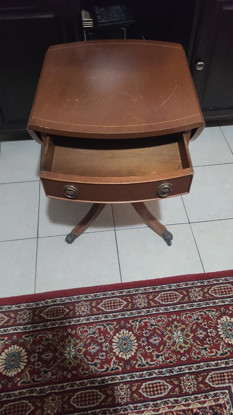 This is a lovely vintage wooden side table. It features a single drawer with a decorative pull. The table has a classic design with claw feet and a drop-leaf top, offering versatile use. Wood construction.