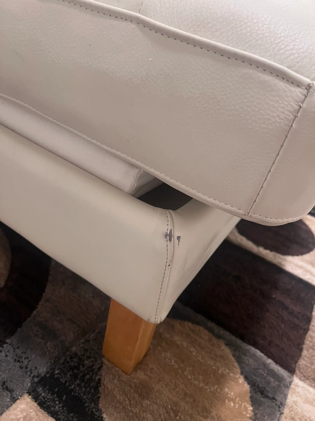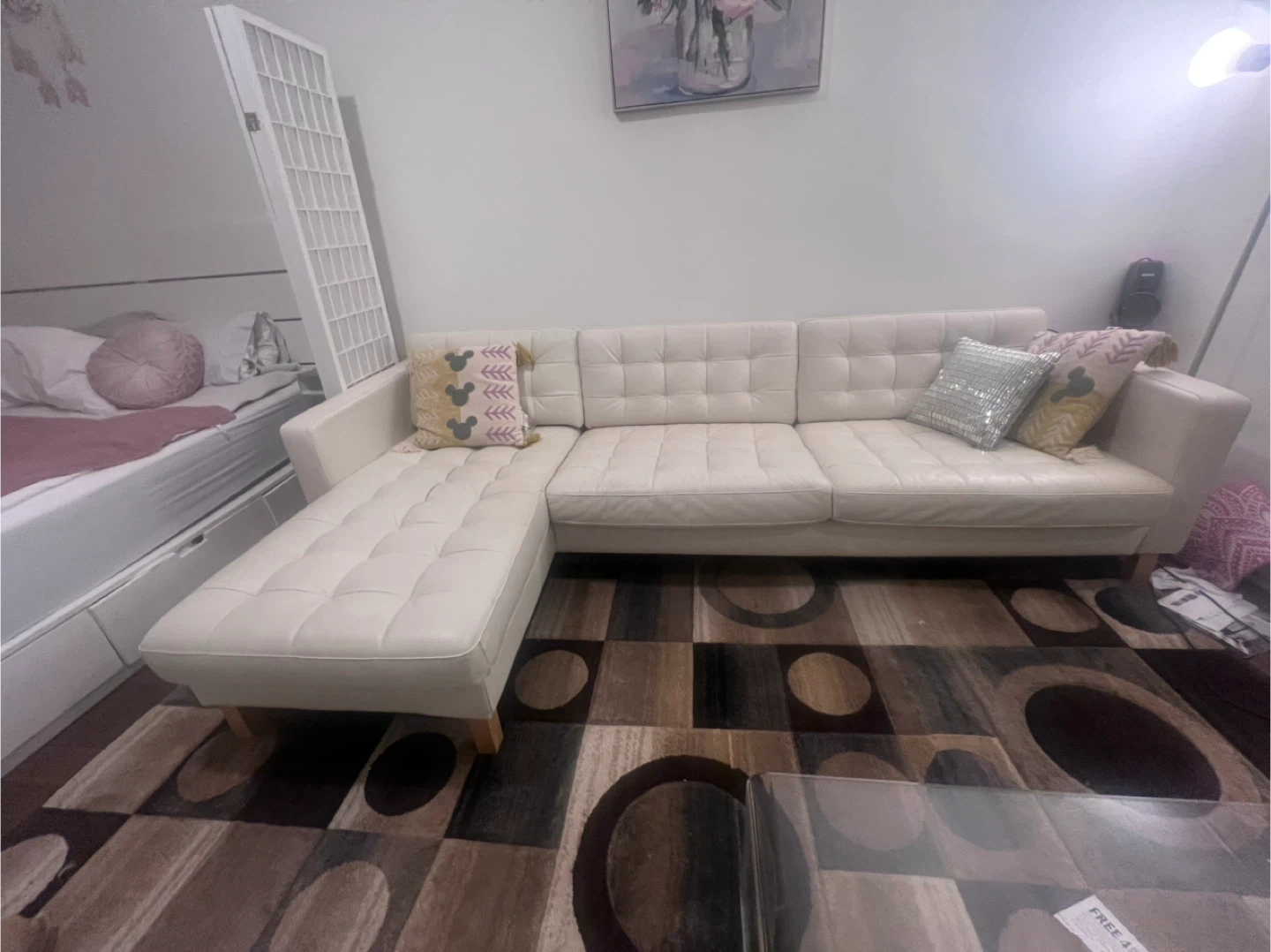 Selling a comfortable IKEA white leather sectional sofa! It features a chaise lounge for extra relaxation. As you can see from the pictures, there are some signs of wear and tear on the cushions, but it's still a great piece of furniture. The base can be lifted for storage!