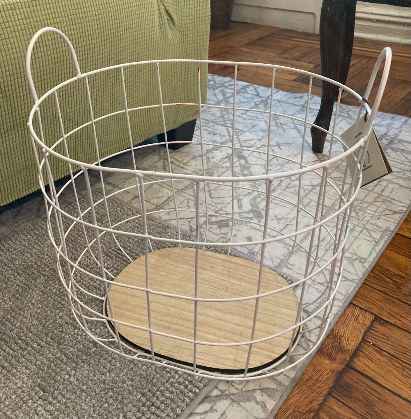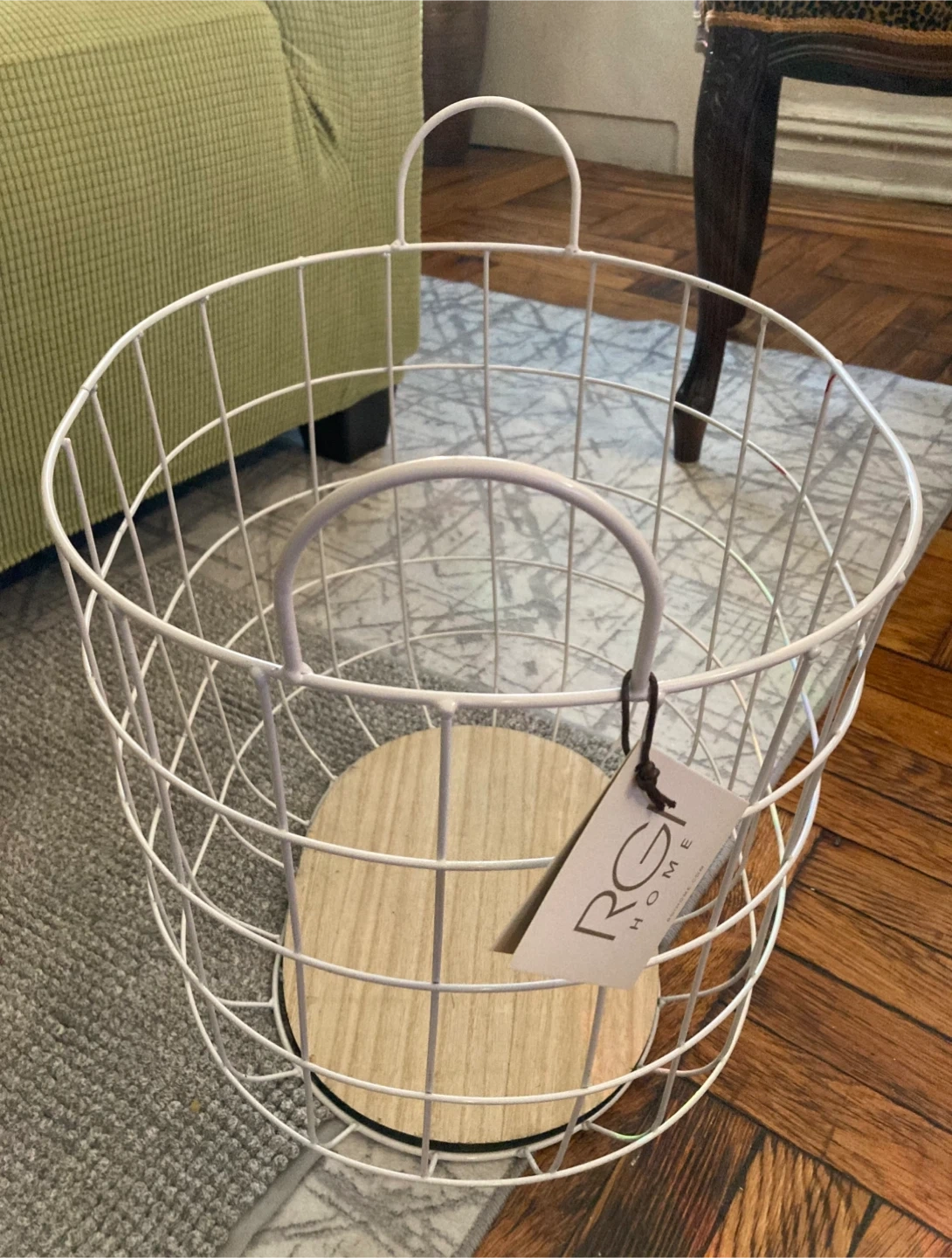 Selling a cute white wire basket from RGI Home! It's in great condition and perfect for organizing your space. The basket features a wooden base and sturdy handles for easy carrying