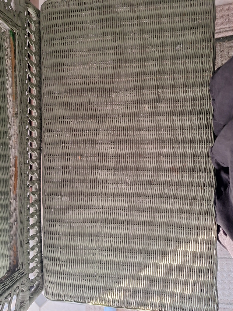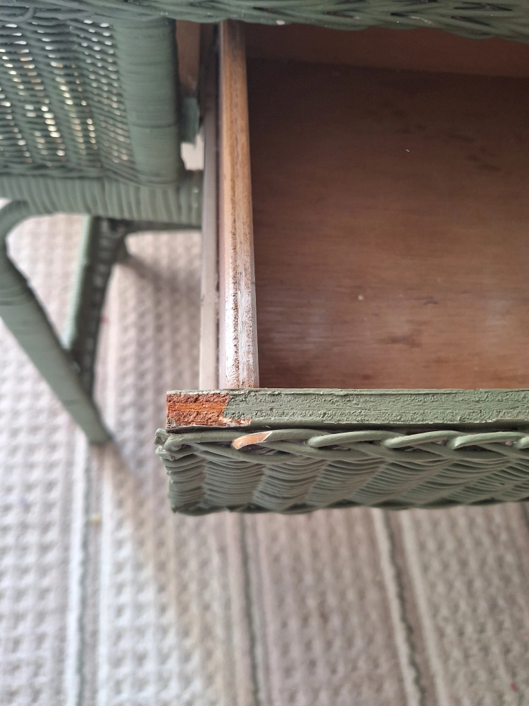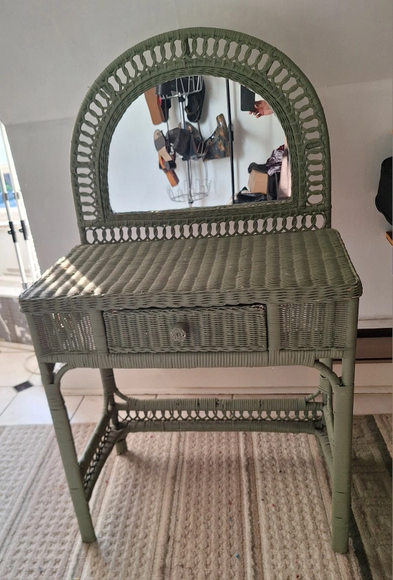 pick up only. A beautiful wicker vanity. Features a mirror and a drawer. It is painted green. This would be a lovely item to create a peaceful getting-ready station. It has some bumps and scratches as shown.