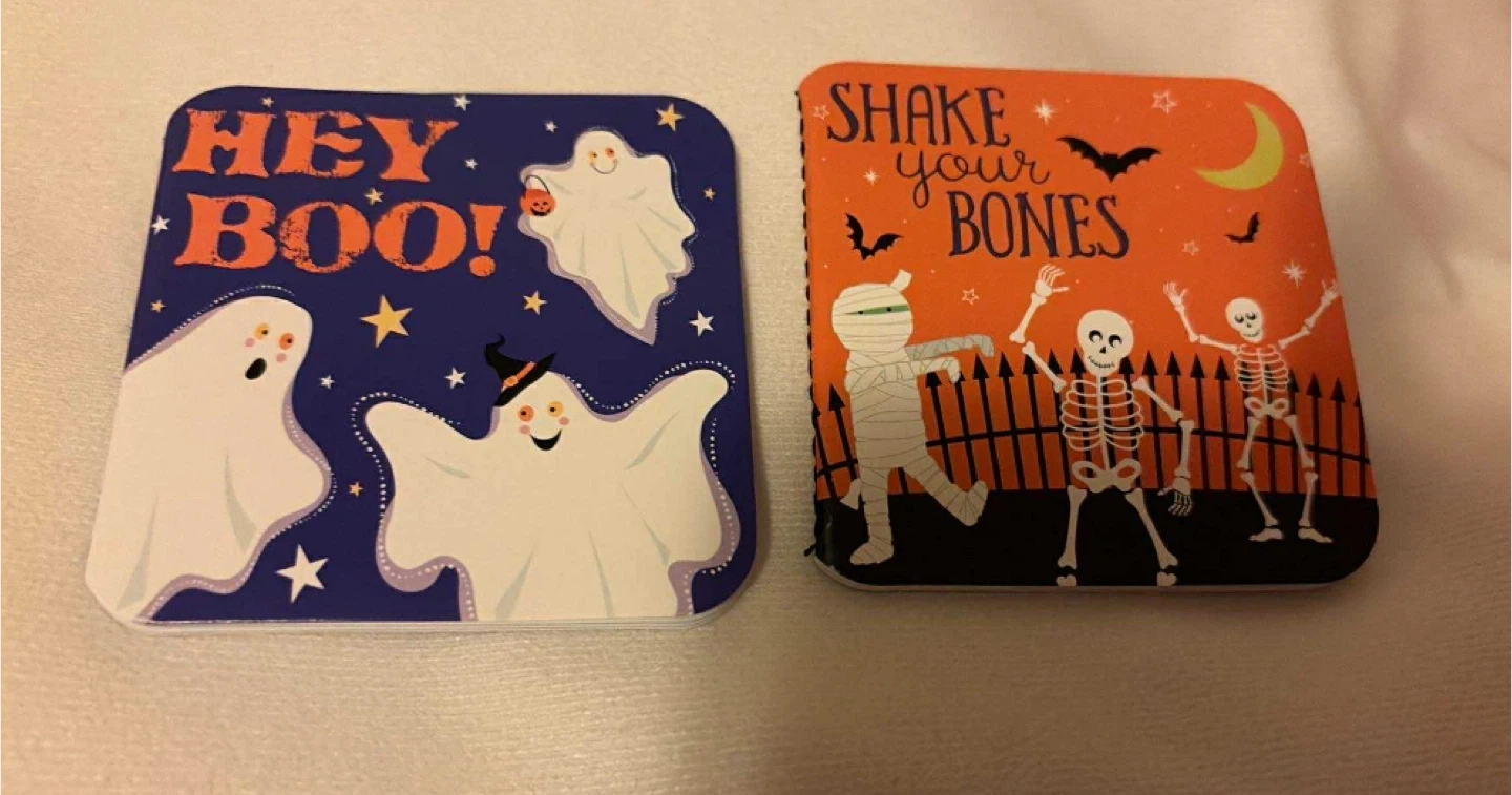 Set of two Halloween-themed mini notebooks! One has ghosts and says "Hey Boo!" and the other has skeletons and says "Shake Your Bones"