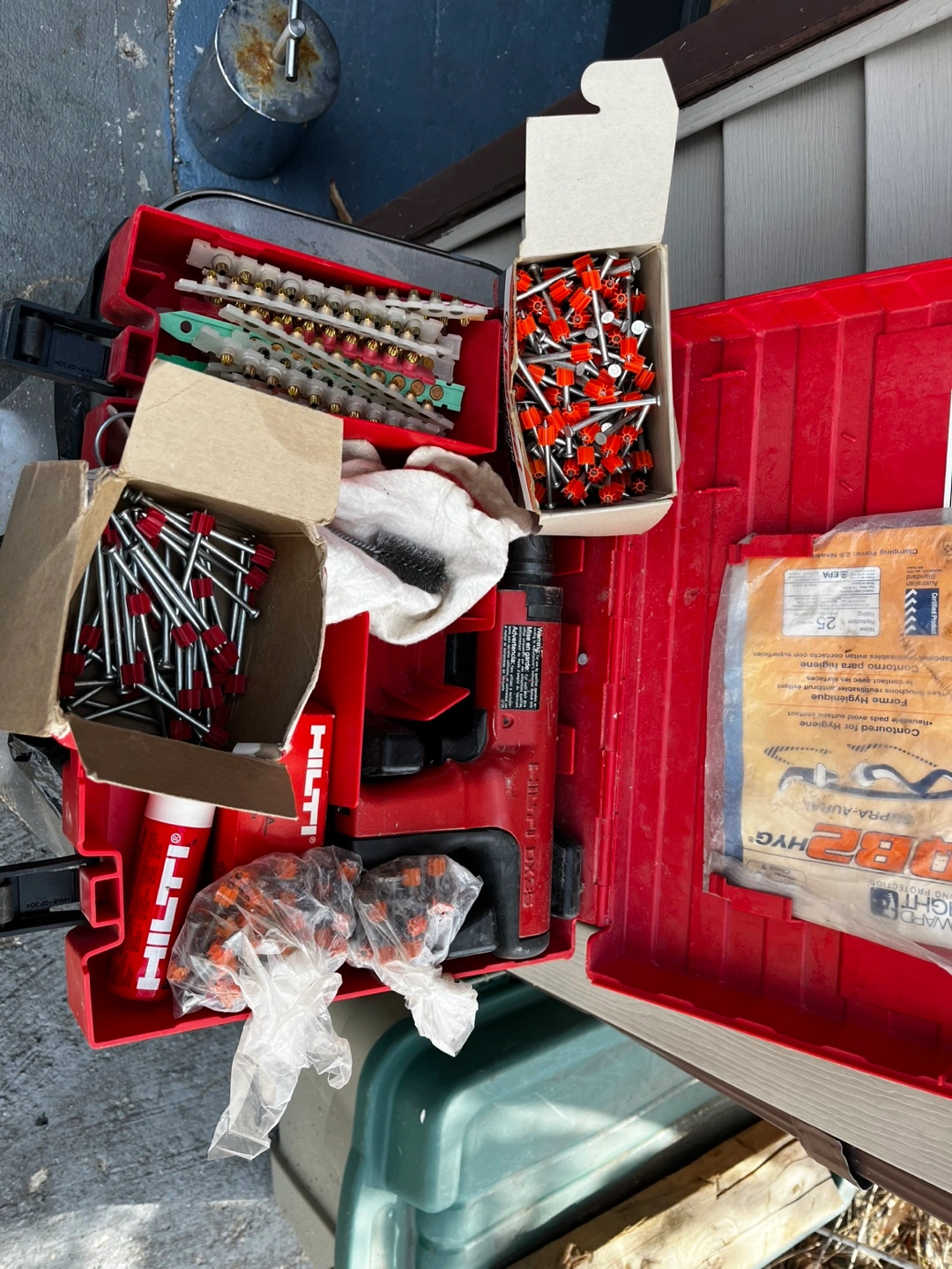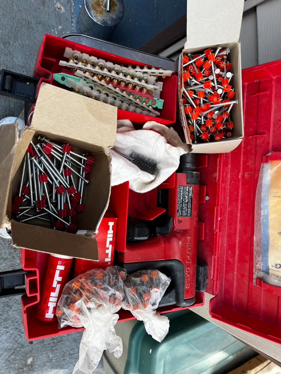 Red Hilti tool case. Includes Hilti power tool, various nails, and other fasteners. Additional supplies also included. Great for construction or DIY projects.