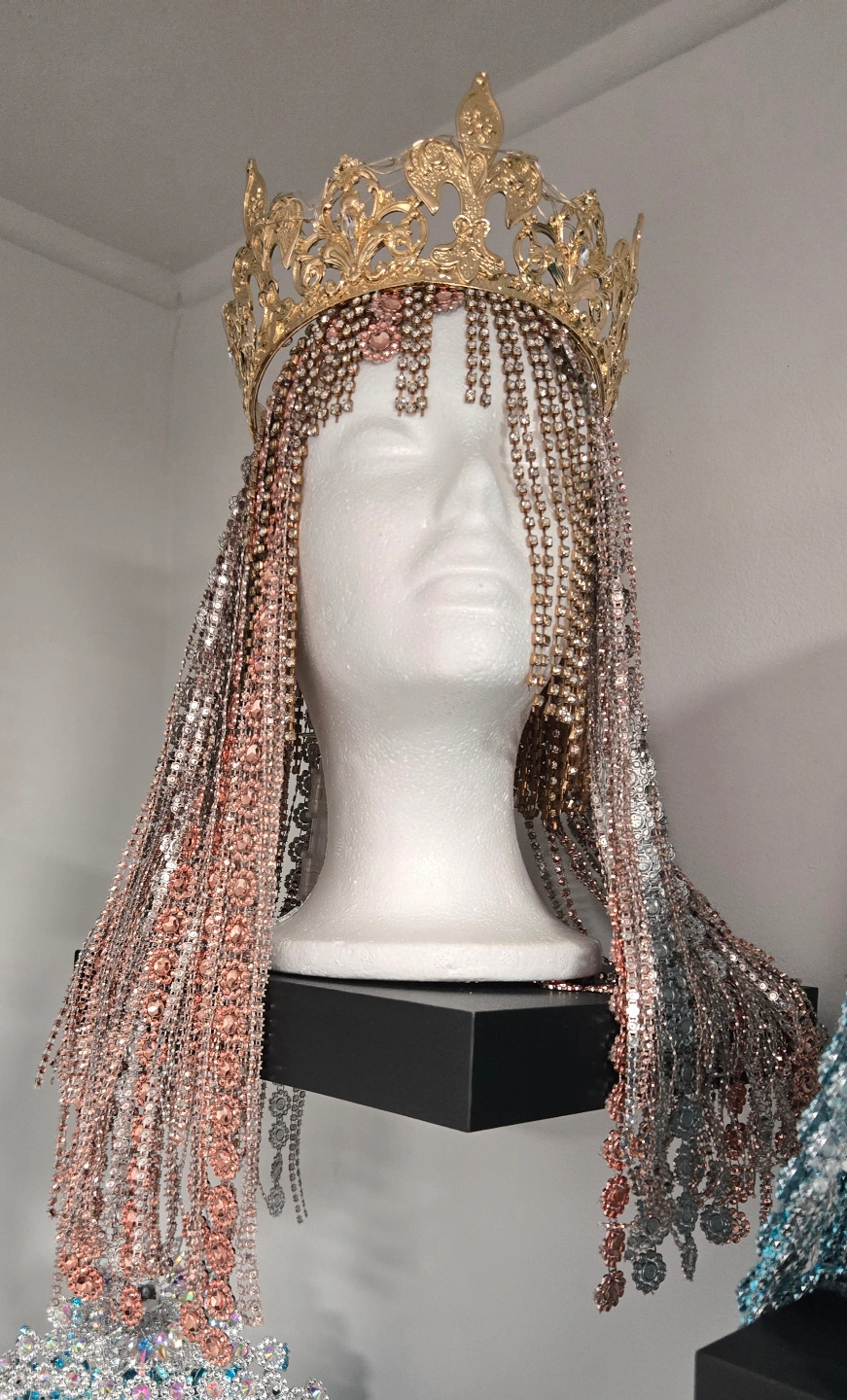 Gorgeous gold crown features long strands of rose gold and silver rhinestones. Perfect for pageants, drag, or special occasions. Headpiece only, mannequin not included. Costume Design by Natasha Berezhnaya ✨️