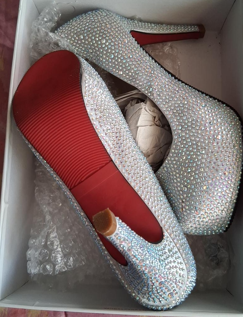 65These rhinestone heels are sure to make a statement! They feature a red sole and come with the original box