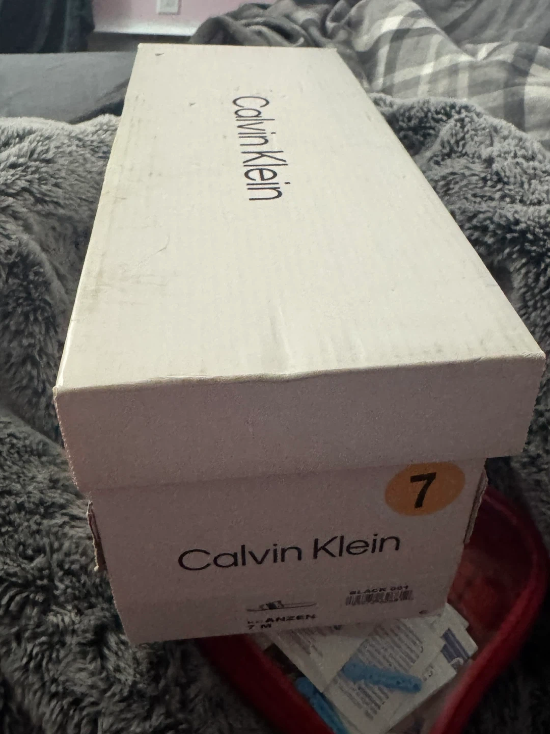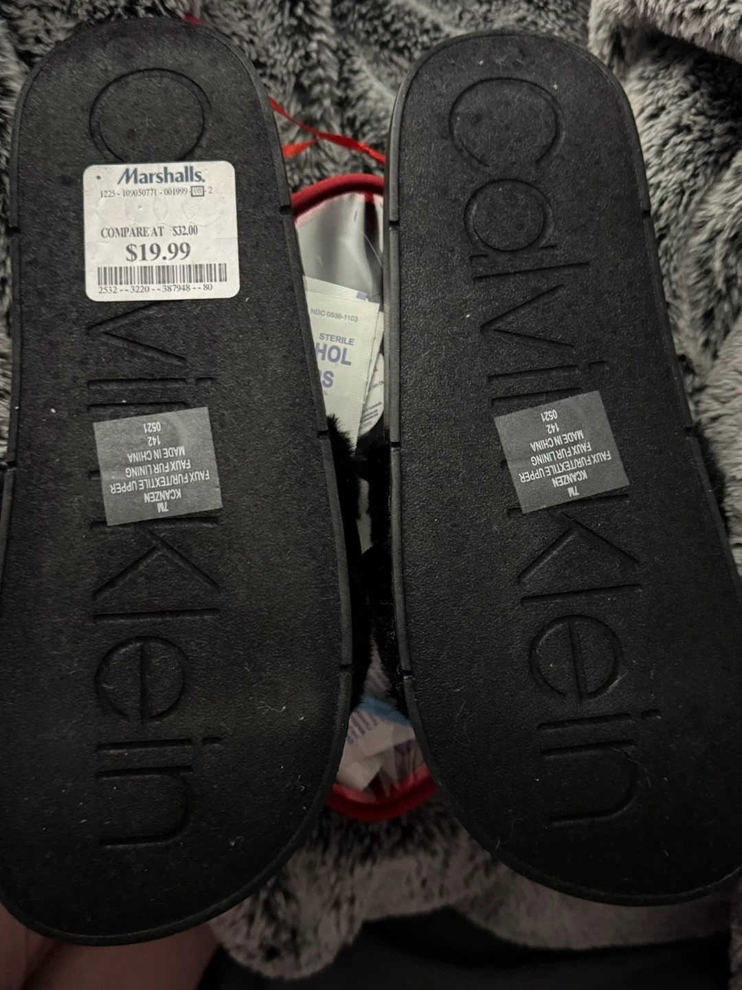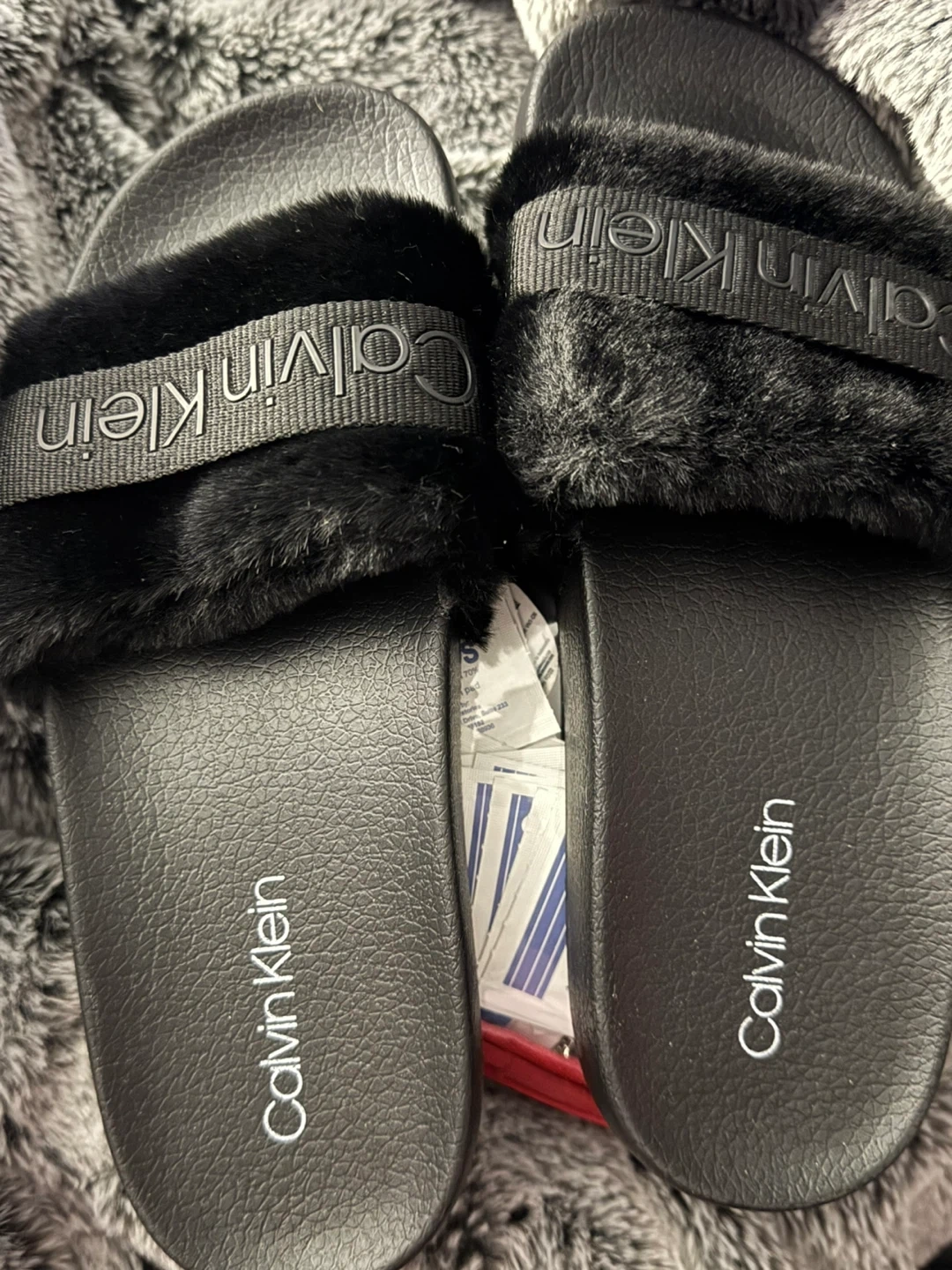 Selling a pair of Calvin Klein black fur slides in size 7. They come with the original box! The slides feature a faux fur upper and are in great condition.