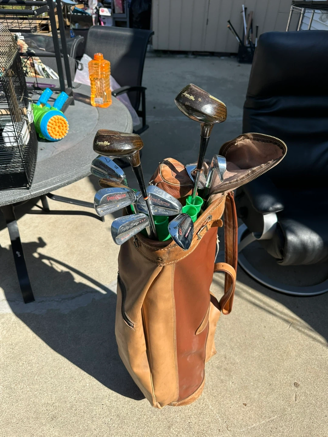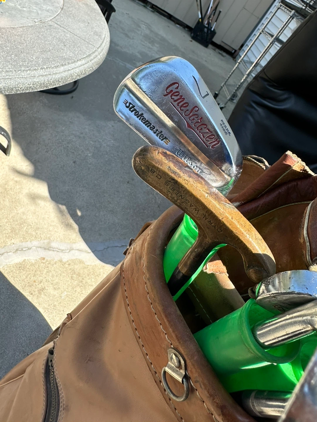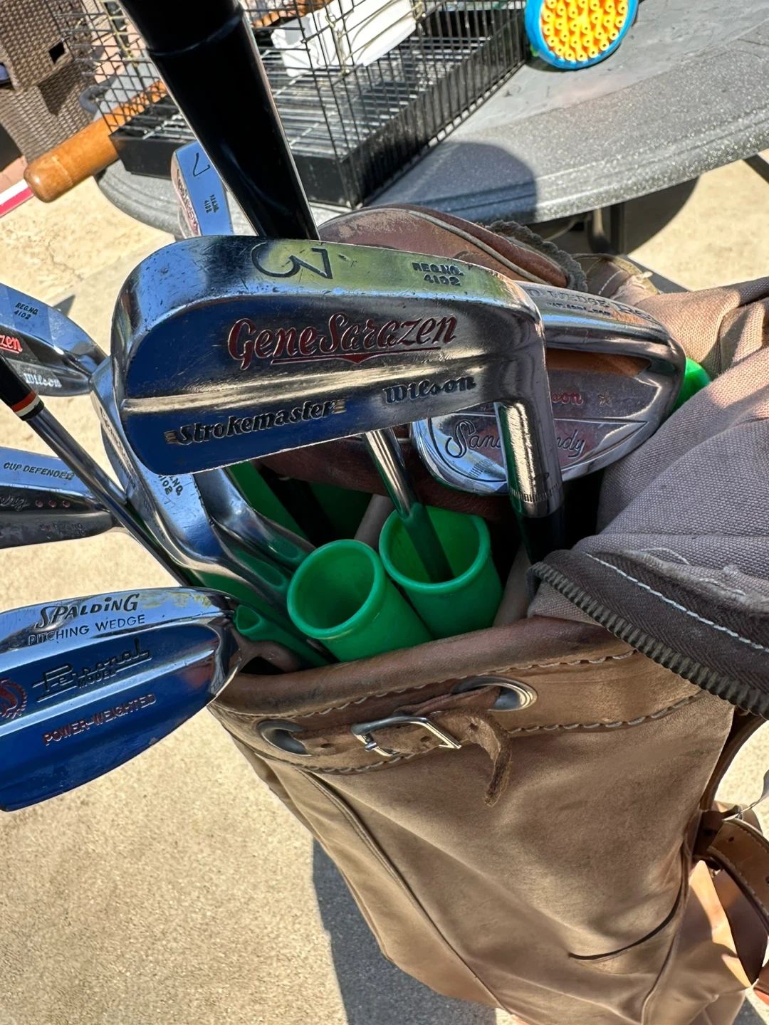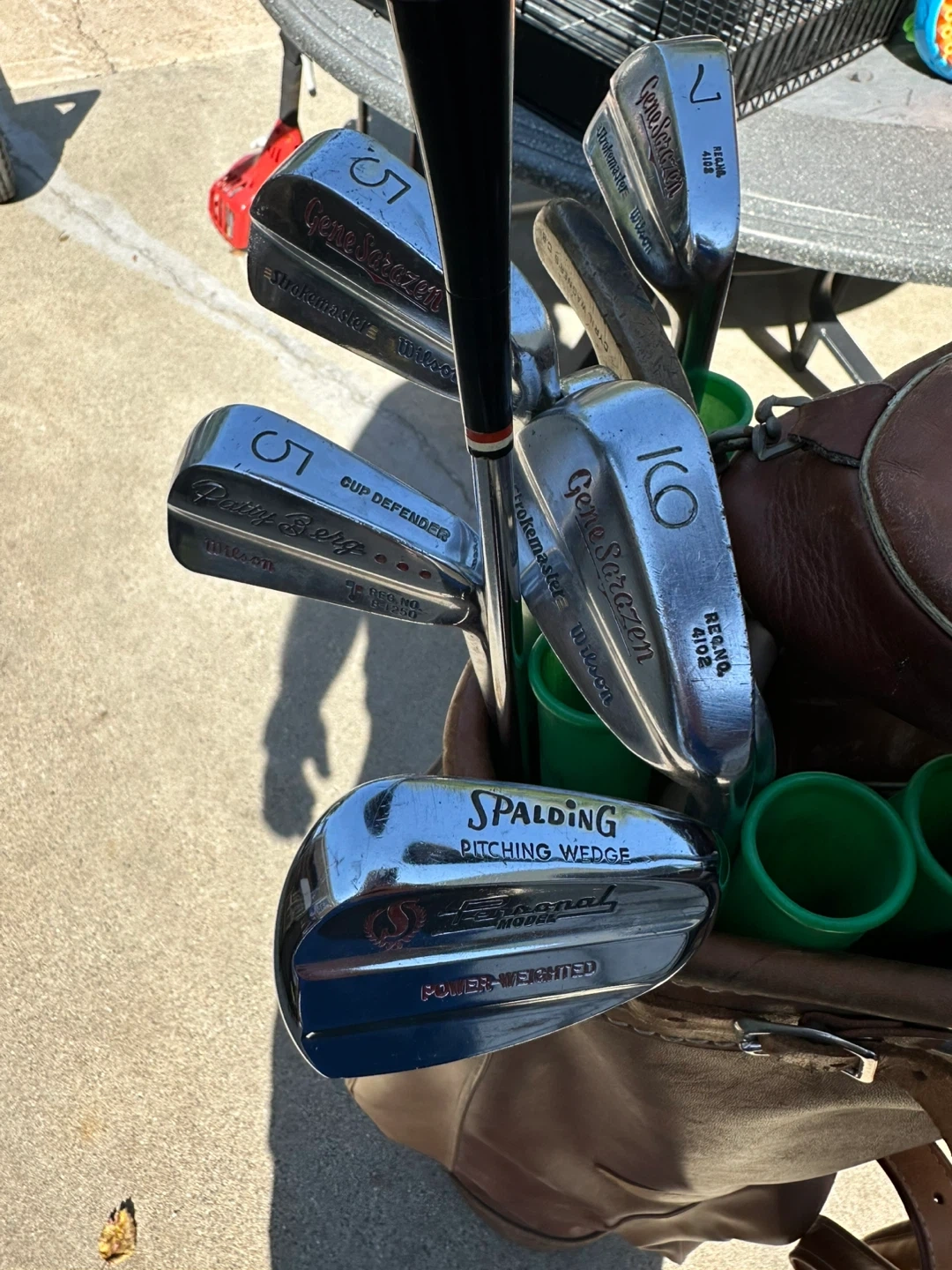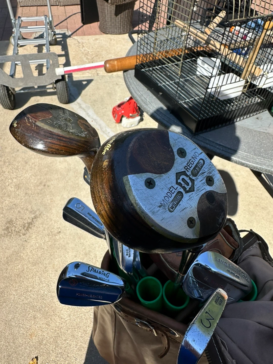Selling a set of used golf clubs, including Wilson and Spalding brands. The set includes a Wilson Model D Reg. No. driver, Spalding Pitching Wedge, and Gene Sarazen Stroke Master irons. Great for someone looking to get started with golf!