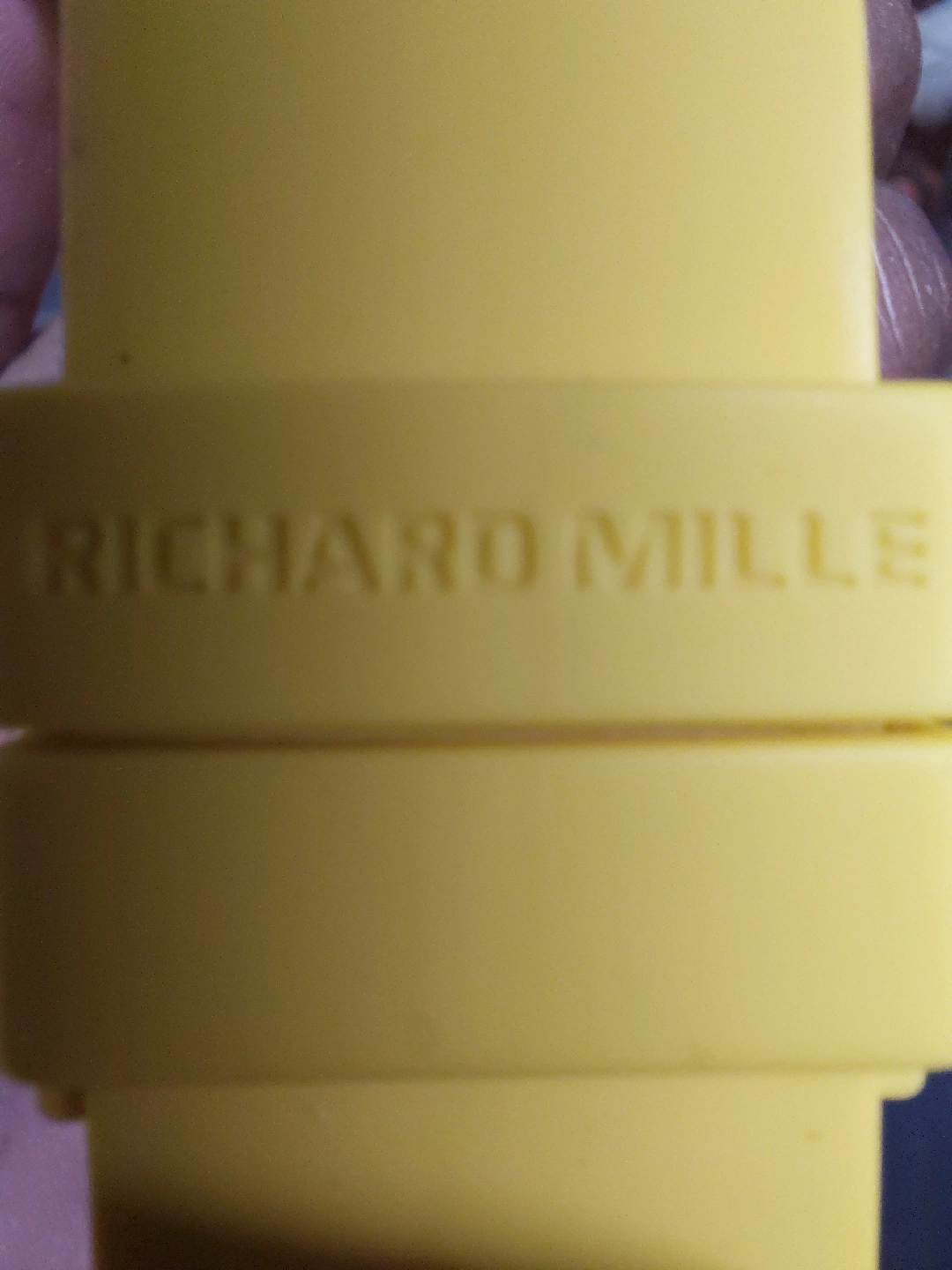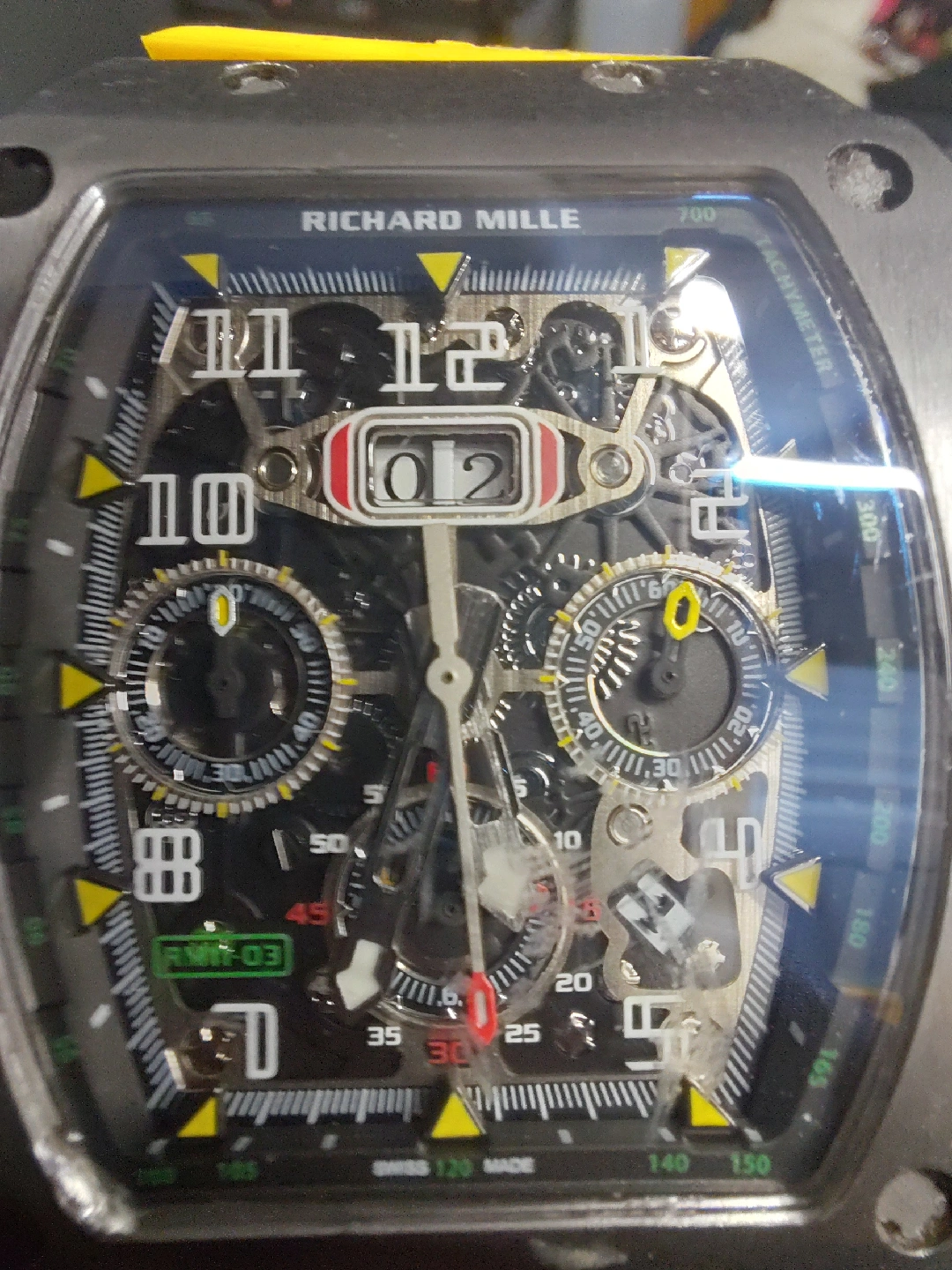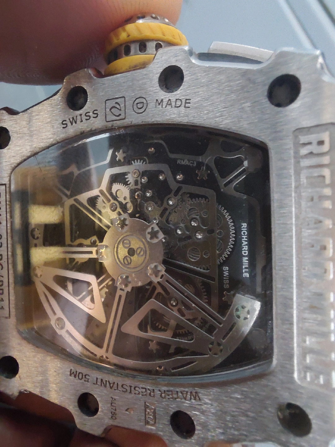 Selling a Richard Mille watch. The watch has a yellow band and a skeleton face. It is marked 'Swiss Made' and 'Water Resistant 50M'. minor scratch