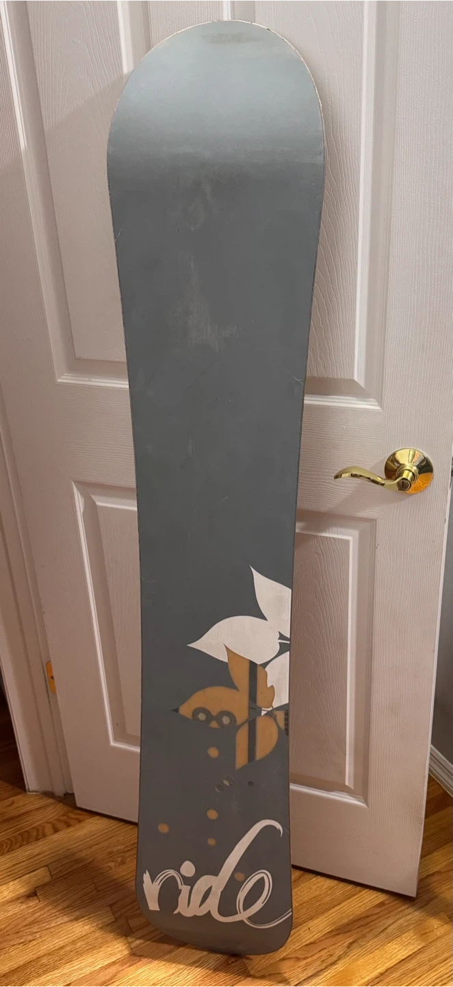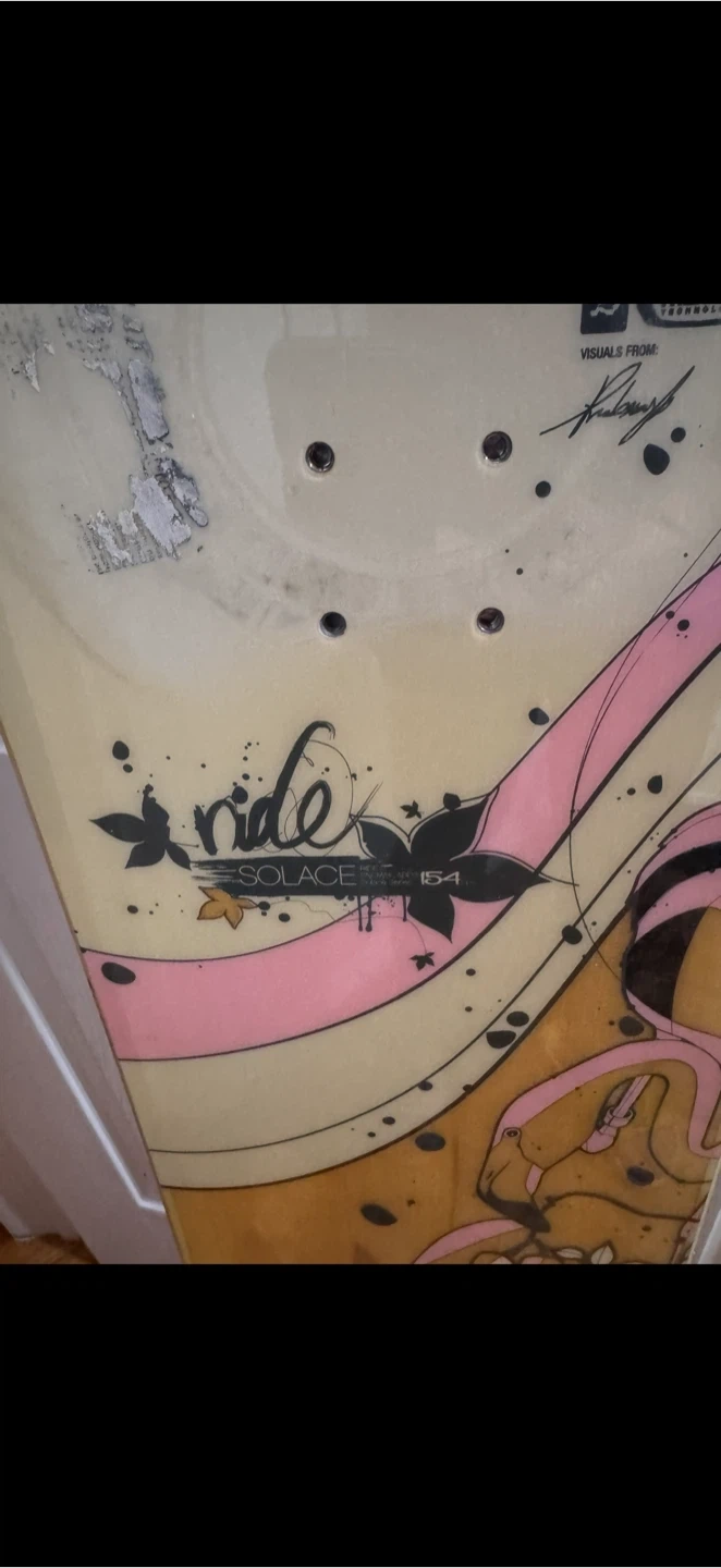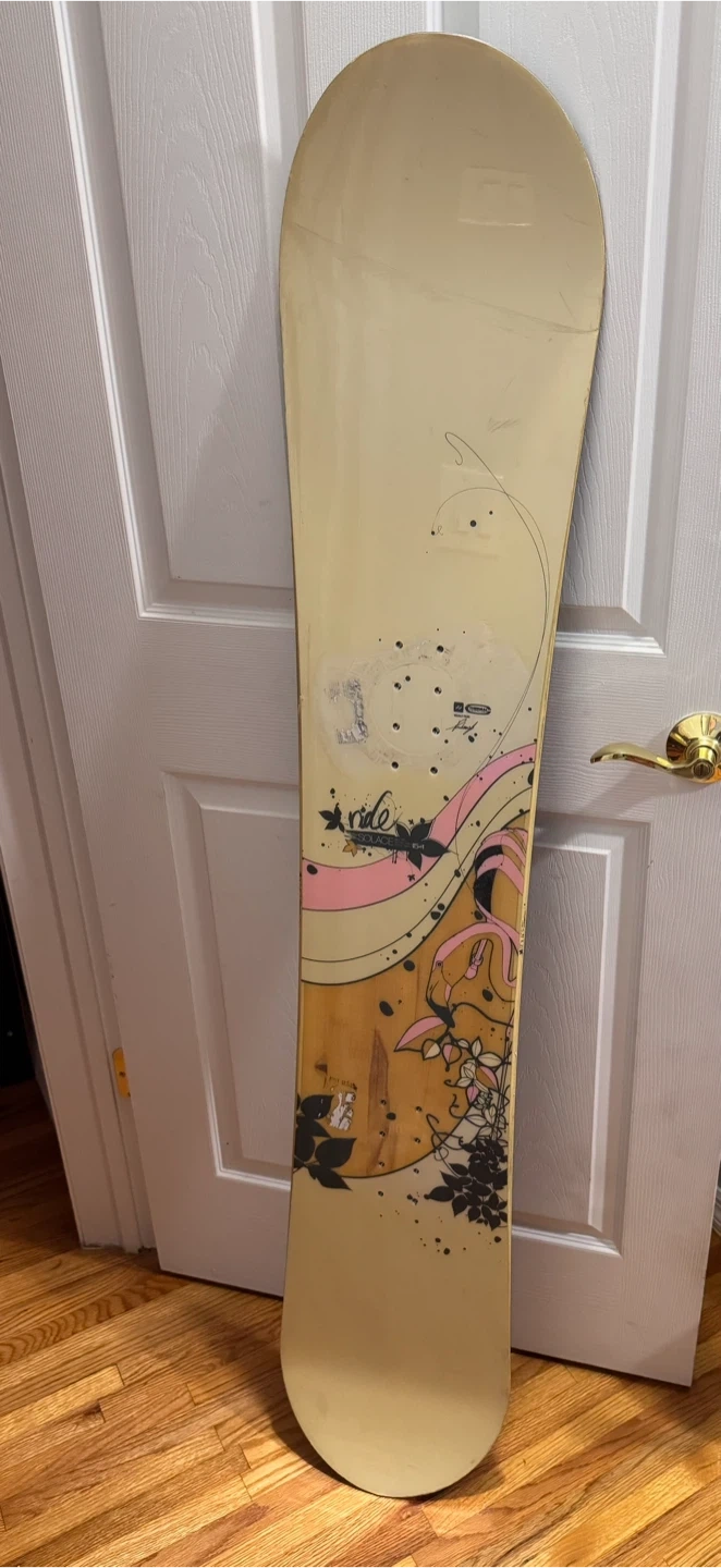 10Selling a Ride Solace 154 snowboard. It has a cream-colored top with a pink and black floral design and a gray bottom with a white floral design. Great for hitting the slopes!