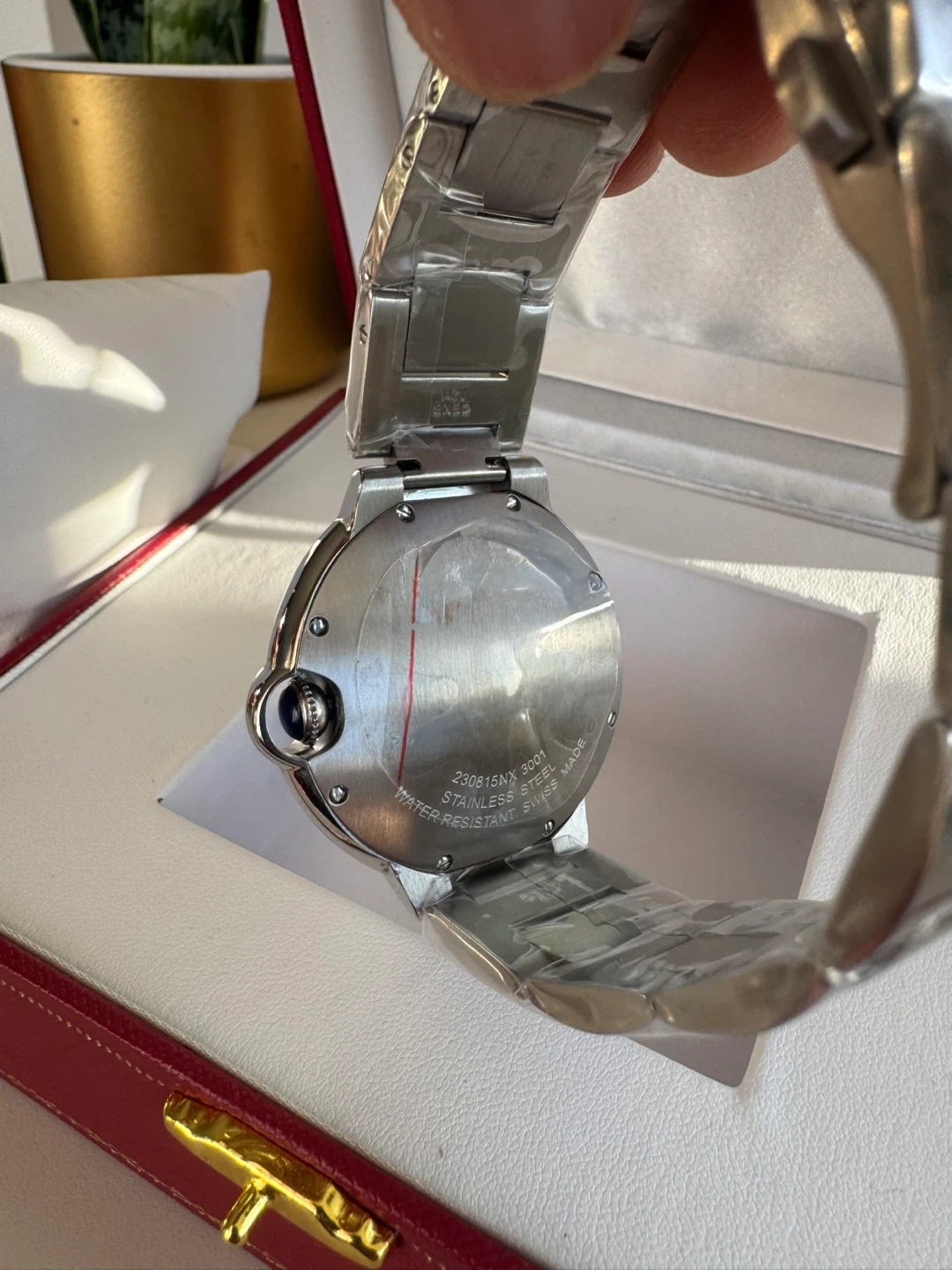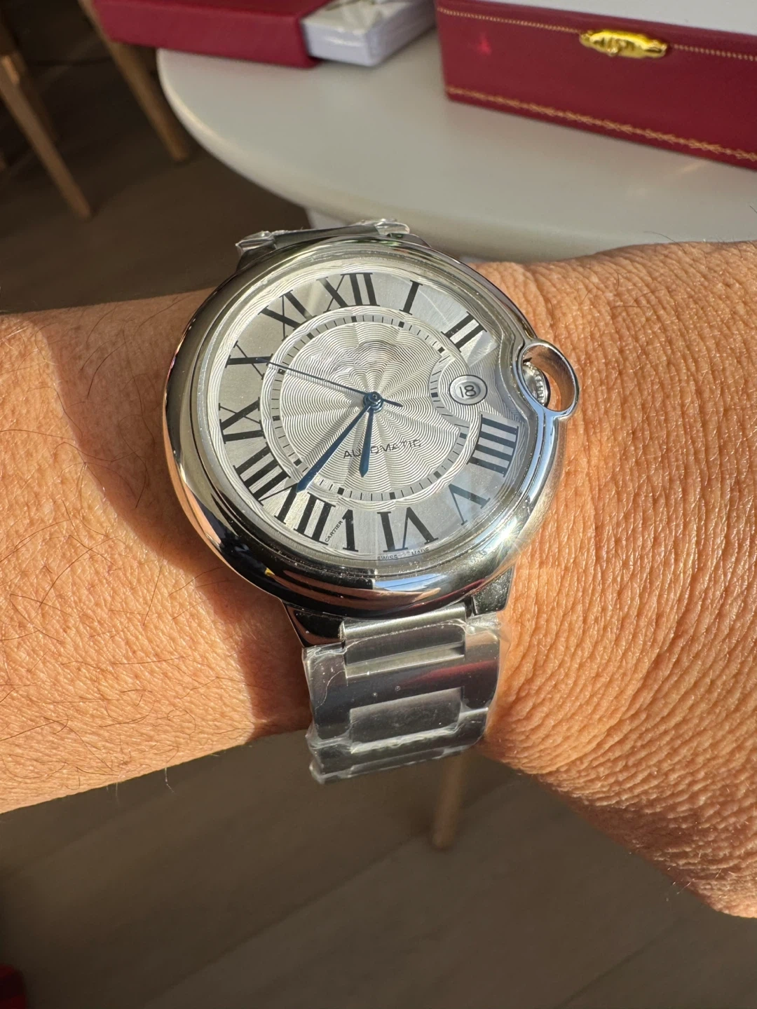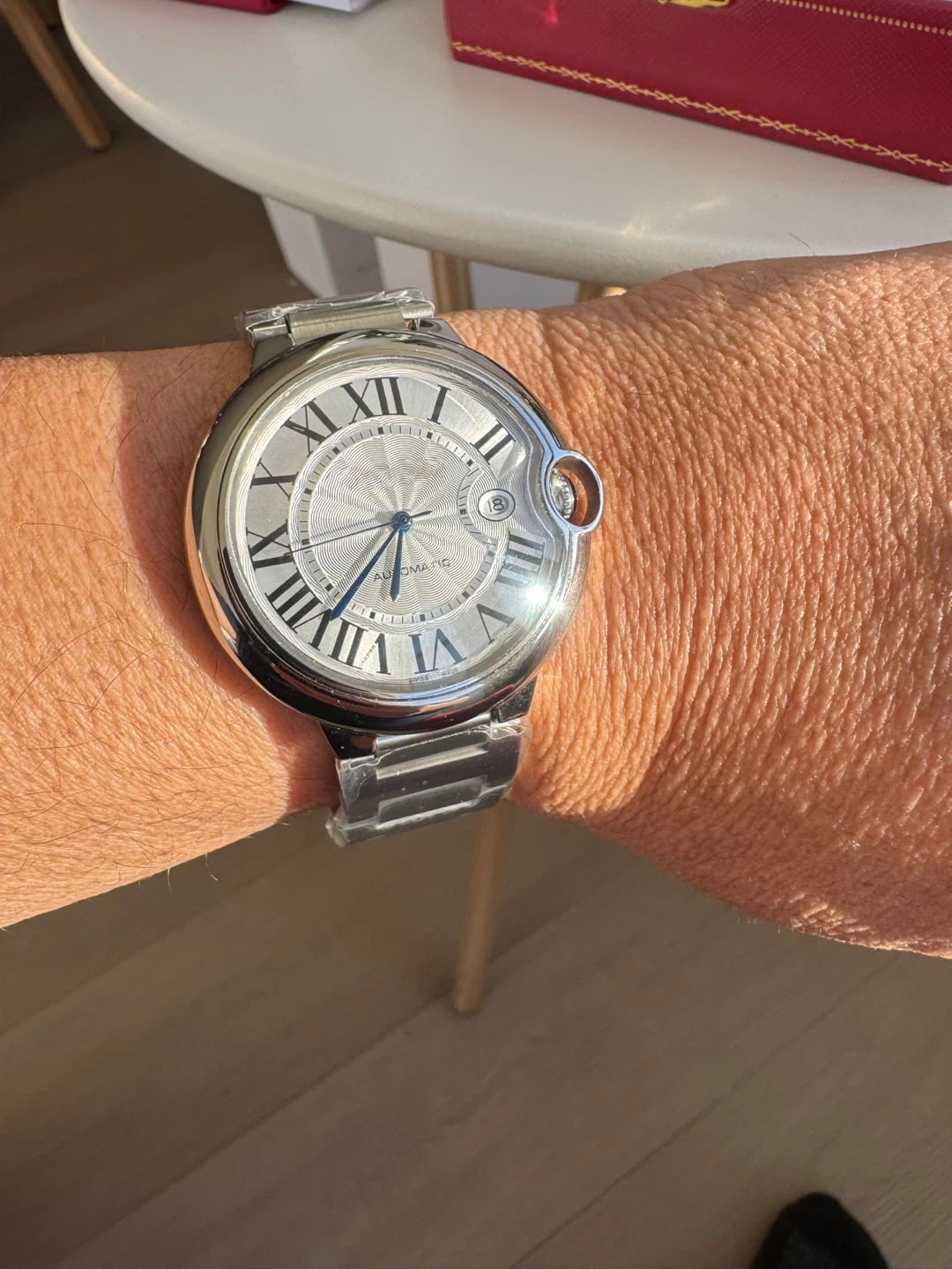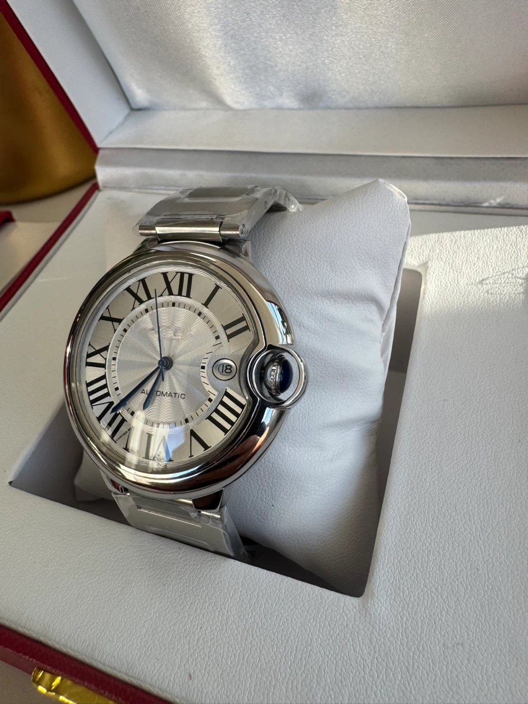 Elegant stainless steel automatic watch inspired by the iconic Ballon Bleu design. Features a silver guilloché dial with bold Roman numerals, blued hands, signature rounded crown, and date window at 3 o’clock. Smooth automatic movement, polished case, and metal bracelet. A timeless luxury look—perfect for everyday wear or special occasions.