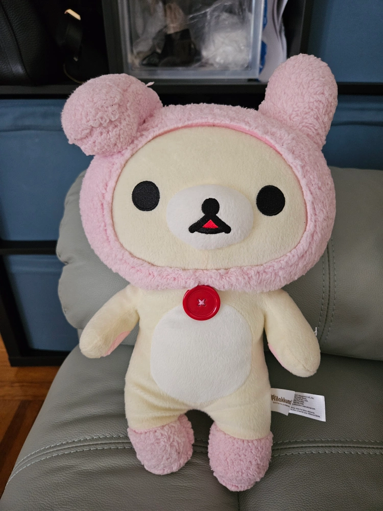 Selling a cute Rilakkuma plush! It's in great condition and features a pink bear costume. Perfect for any Rilakkuma fan!