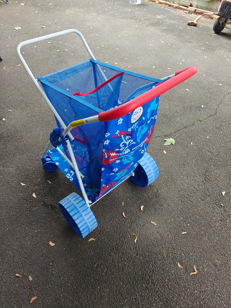 Get ready for the beach with this RIO Beach Wonder Wheeler! It's perfect for hauling all your gear, from chairs and umbrellas to coolers and toys. The sturdy construction and large wheels make it easy to navigate sand and other terrains. It's blue with a floral pattern