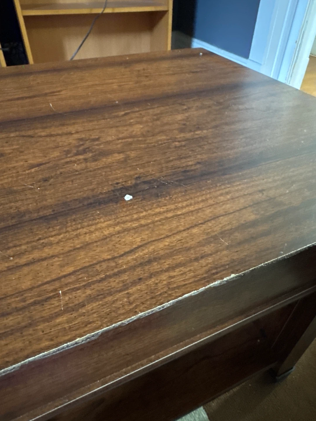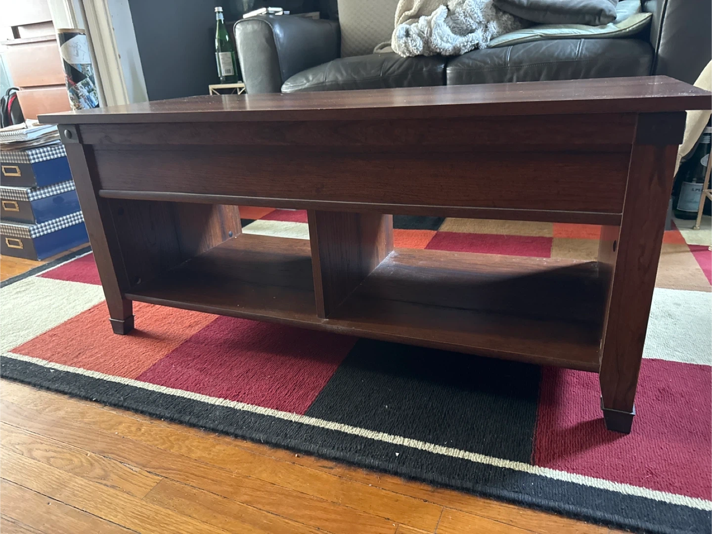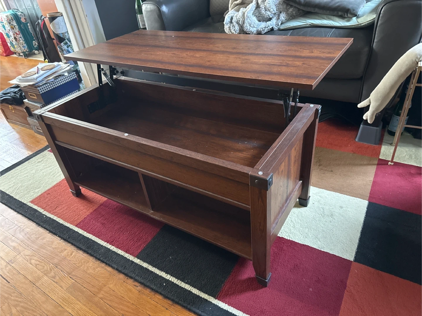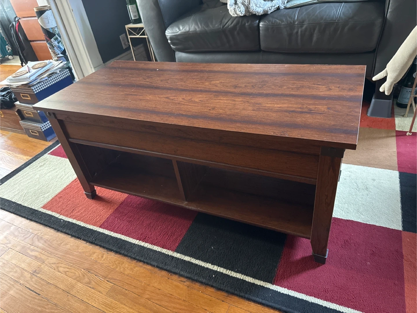 This dark wood coffee table features a lift-top design for convenient access to storage. It has two open shelves on the bottom for additional space. The tabletop has a few minor scuffs, but it's in good overall condition. It's great for organizing living room essentials!
