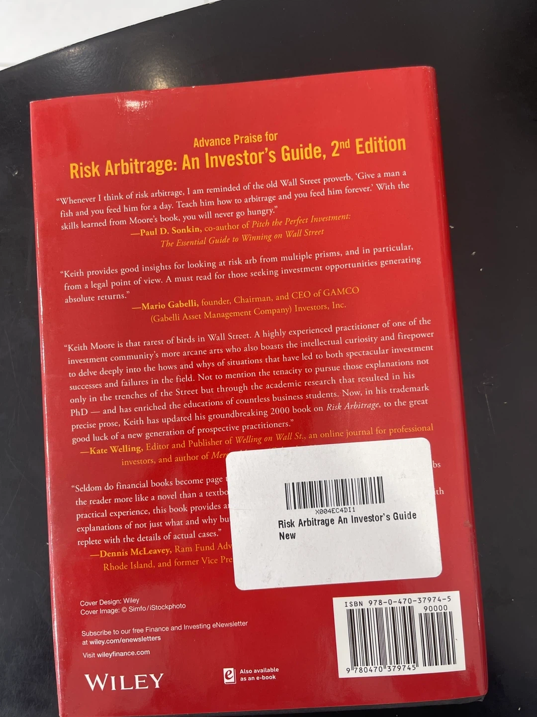96Selling a copy of "Risk Arbitrage, Second Edition" by Keith M. Moore. It's part of the Wiley Finance Series and is an investor's guide. Great for anyone interested in finance and investment strategies