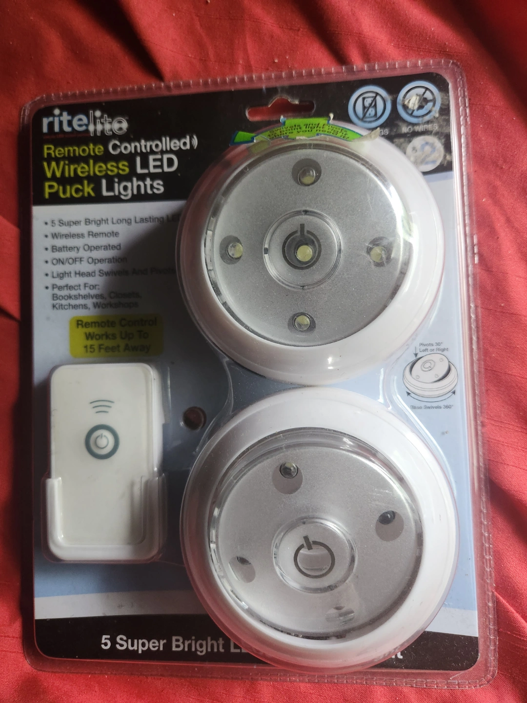 880Two 5 super bright LED puck lights. Wireless remote control. Battery operated. Light heads swivel and pivot. Perfect for bookshelves, closets, kitchens, and workshops. I prefer USB recharging than AAA batteries.