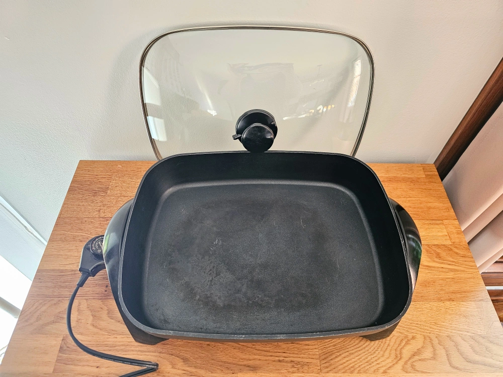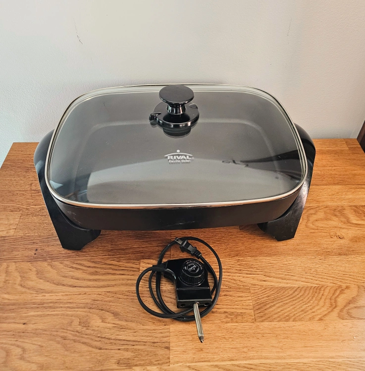 Gently used Rival electric skillet, 16-inch size. Great for making family meals, dorm cooking, stir-fries, pancakes, or keeping food warm at gatherings. Heats evenly and works perfectly. Easy to clean with a nonstick surface. Can cook food up to 400° F. Comes from a Smoke-free home. Please feel free to reach out with any questions! Pickup in Old Town Chicago.