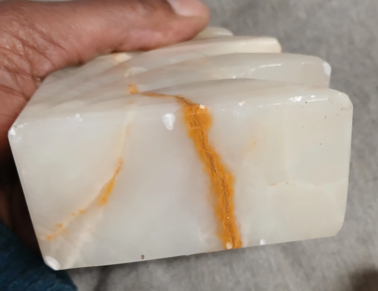 Decorative bookends carved from natural onyx stone. White and tan veining throughout the material. Approximately 2 inches wide 5 inches tall. Adds a unique touch to any bookshelf!