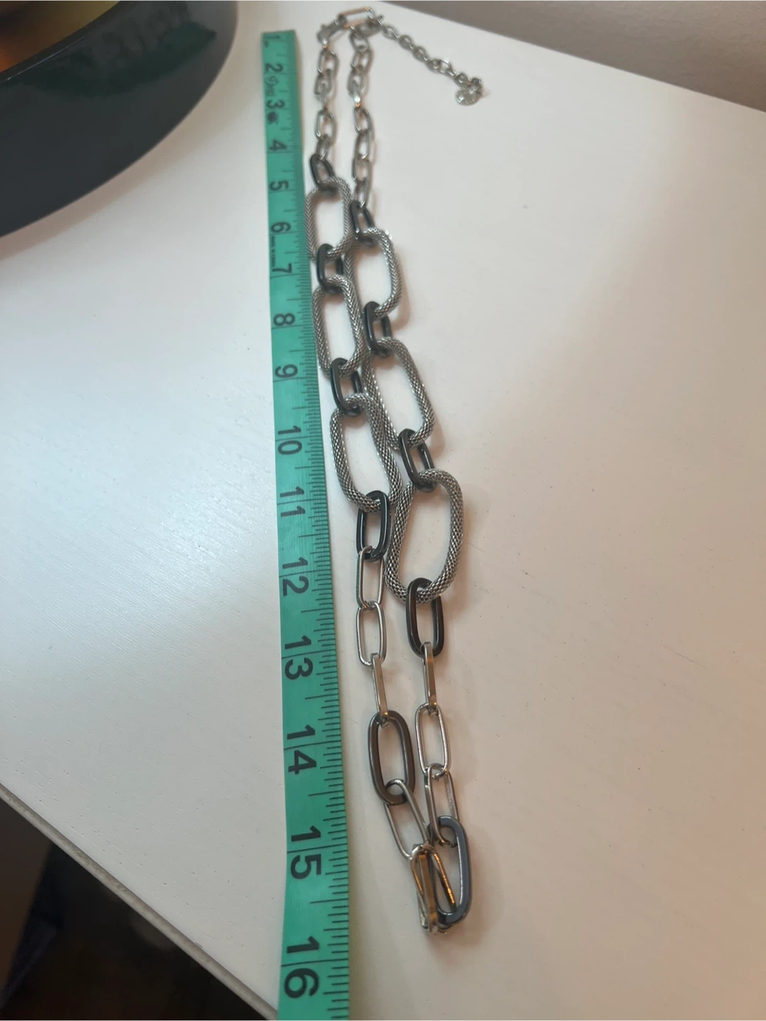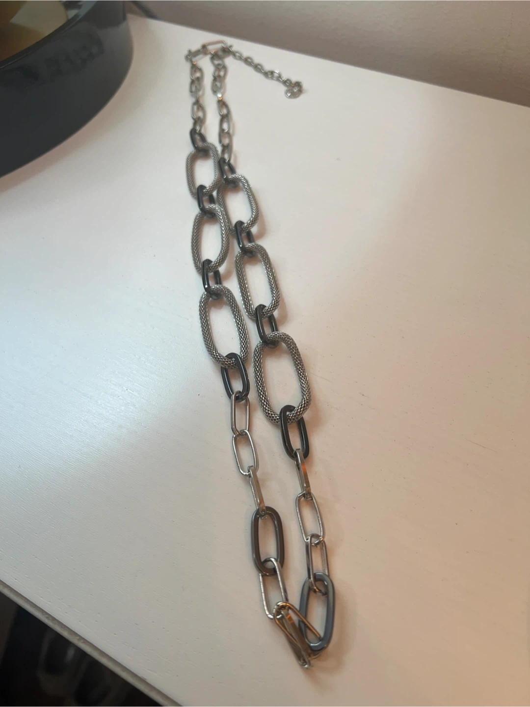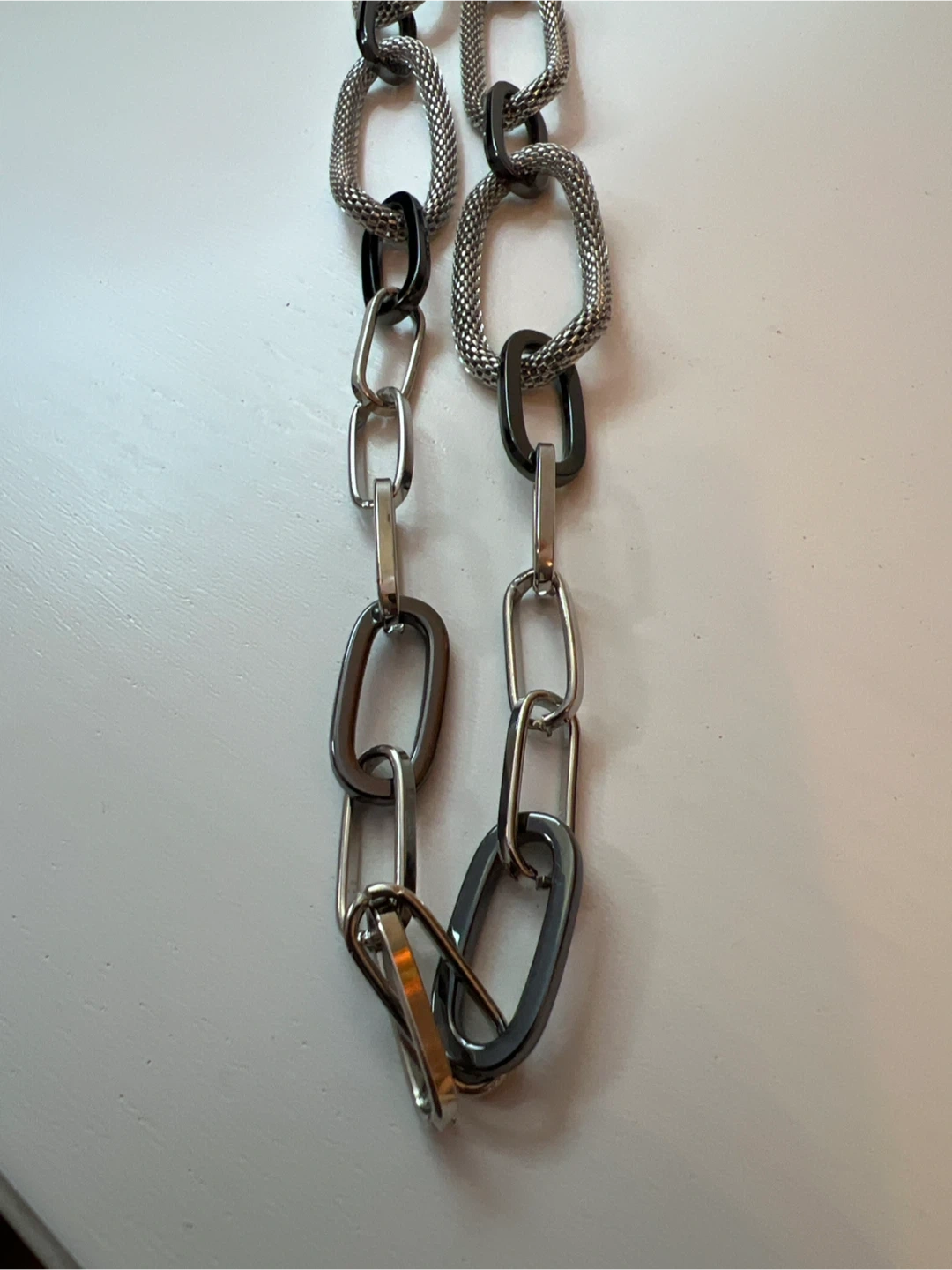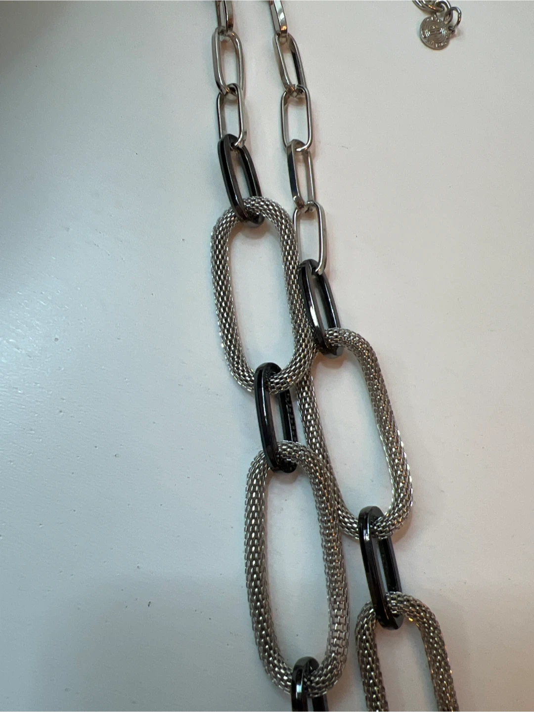 23Multi Link Mixed Metal Chain necklace in silver and black. It measures approximately 32 inches in length. It's in great condition and ready to wear!t