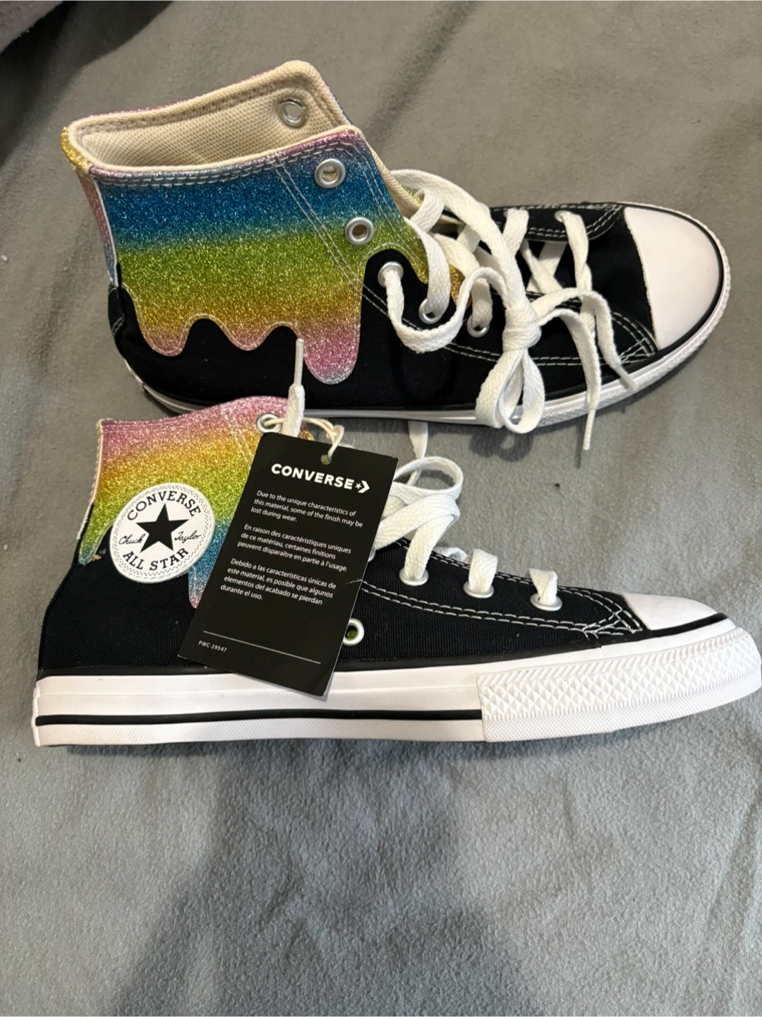 Converse Chuck Taylor All Star high top sneakers Kids size 3. They feature a black canvas with a rainbow glitter drip design on the heel. Never worn, original box and tag