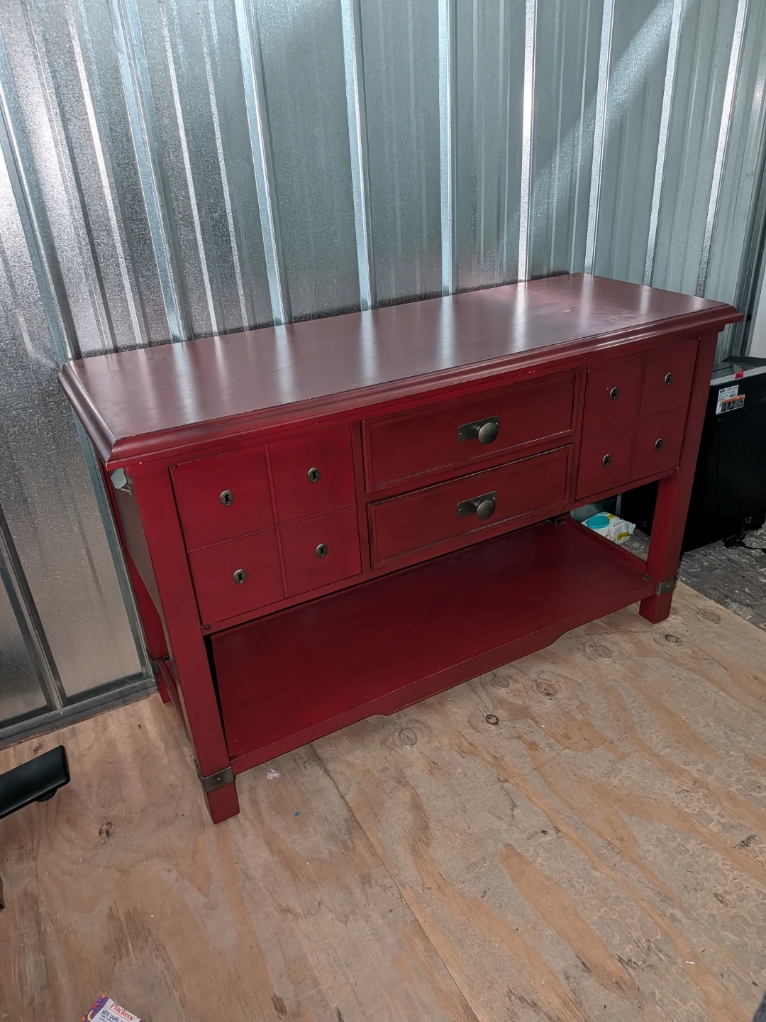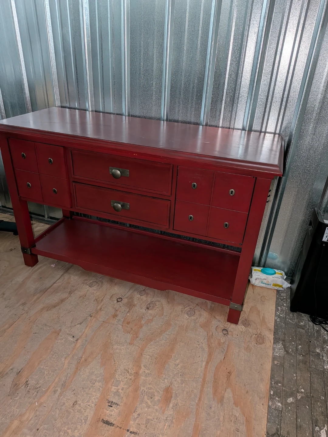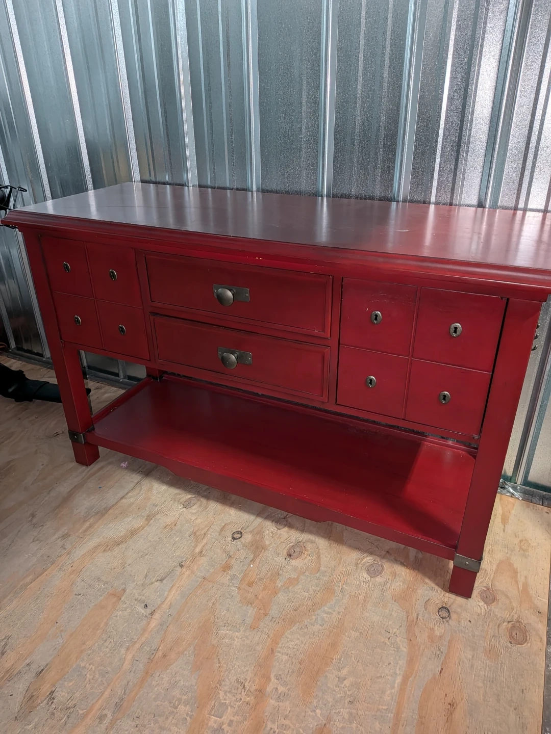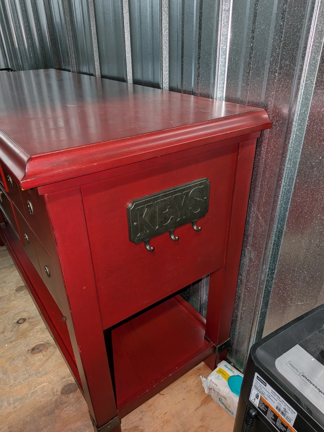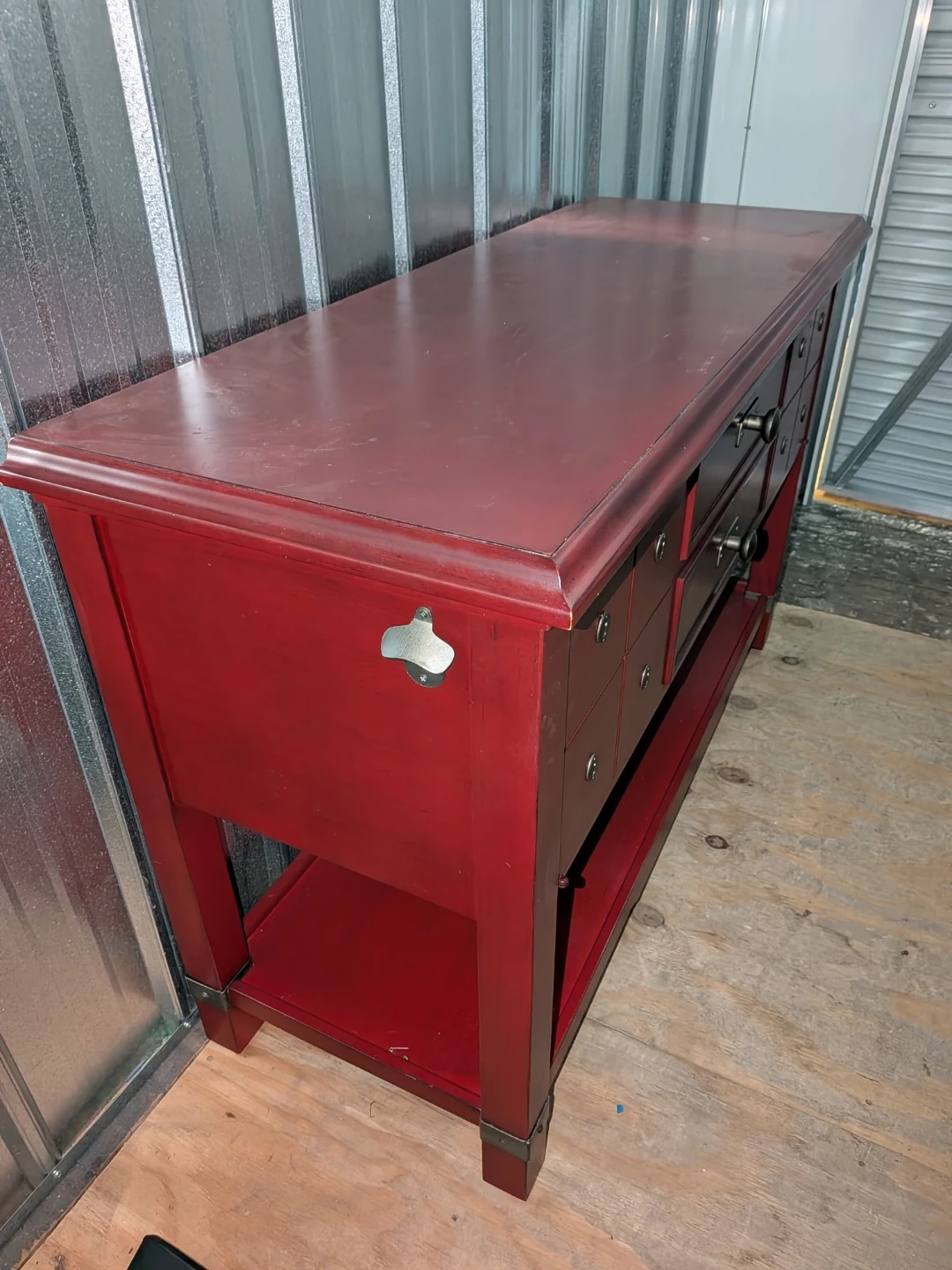 This is a red buffet table. It has a key holder on the side and a bottle opener on the other. It has two drawers and a shelf on the bottom.