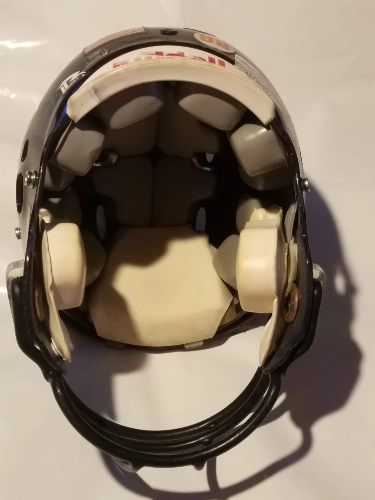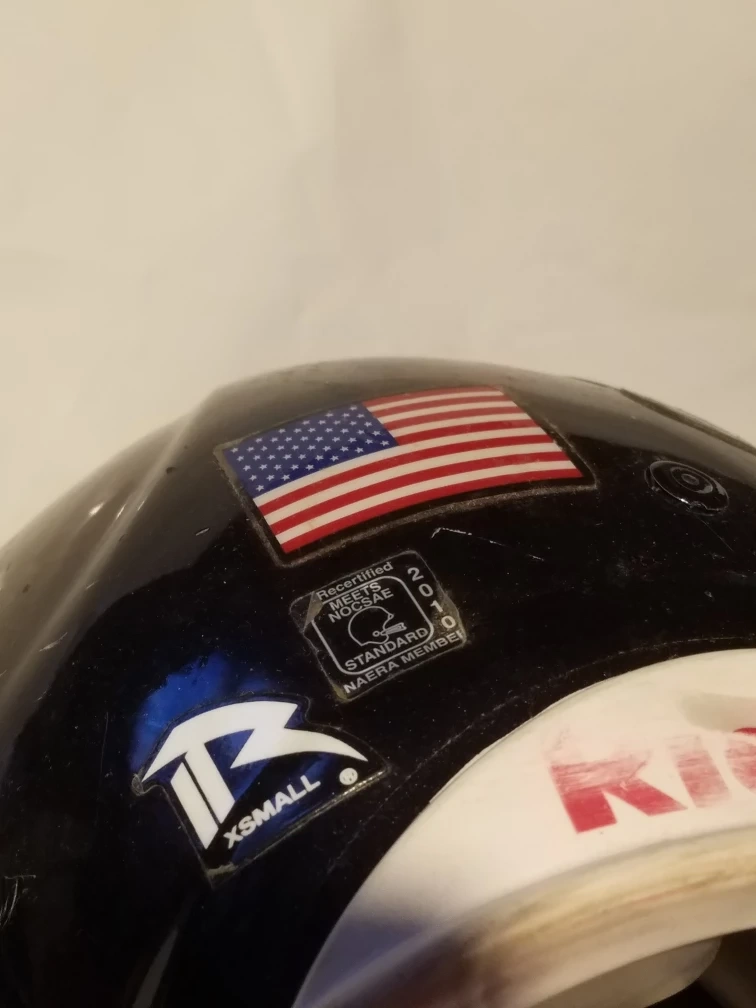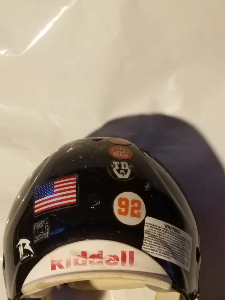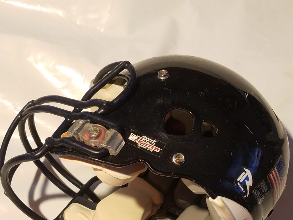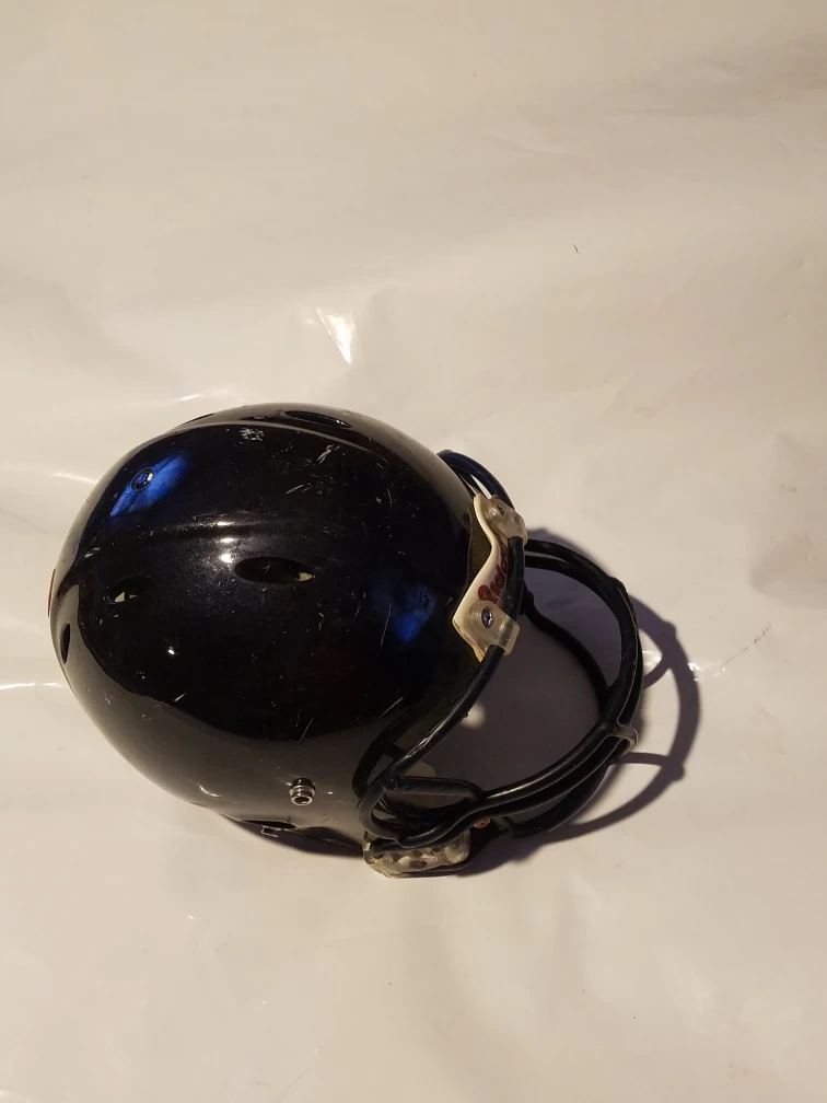 This is a Riddell black football helmet. It's a size X-Small and features a black shell with a face mask. The helmet has some scuffs and scratches from normal use.