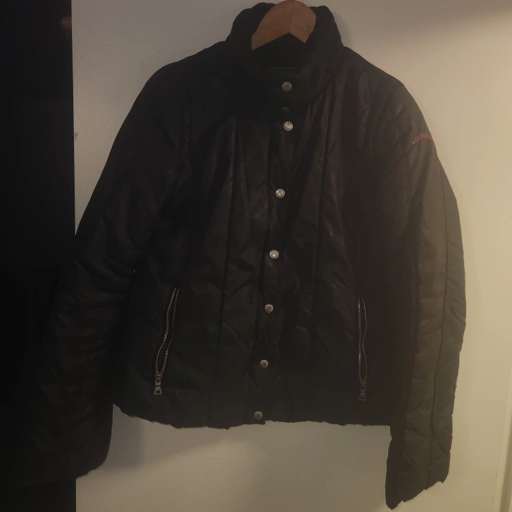 Women's black puffer jacket. Features snap button closures,zipper need to be changed. I was using with the buttons always. Lightly quilted design. Long sleeves. # freecycle 🥕