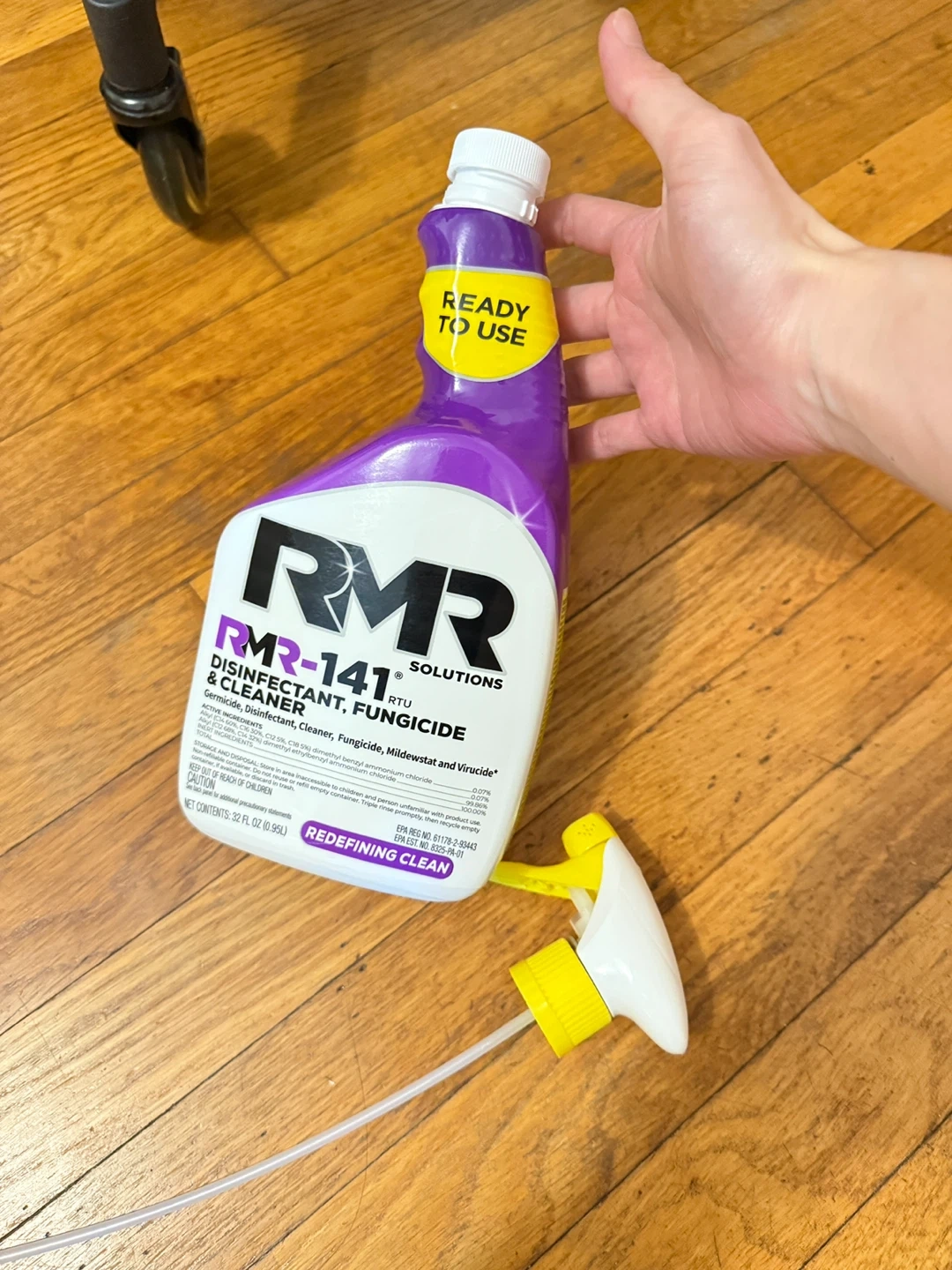 Selling a bottle of RMR-141 RTU Disinfectant, Fungicide & Cleaner. It's a germicide, disinfectant, cleaner, fungicide, mildewstat, and virucide. The net contents are 32 fl oz (0.95L). It's ready to use!