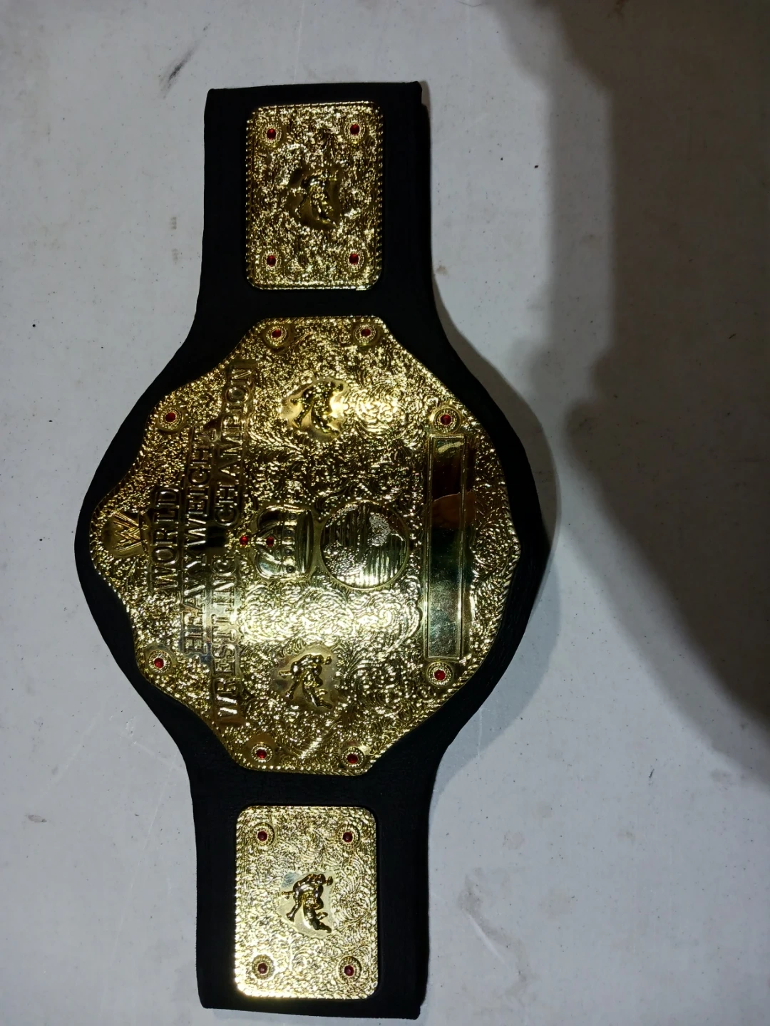 Selling a WWE World Heavyweight Championship replica belt. It features intricate gold detailing and red accents on a black strap. Perfect for any wrestling fan or collector!not real for kids