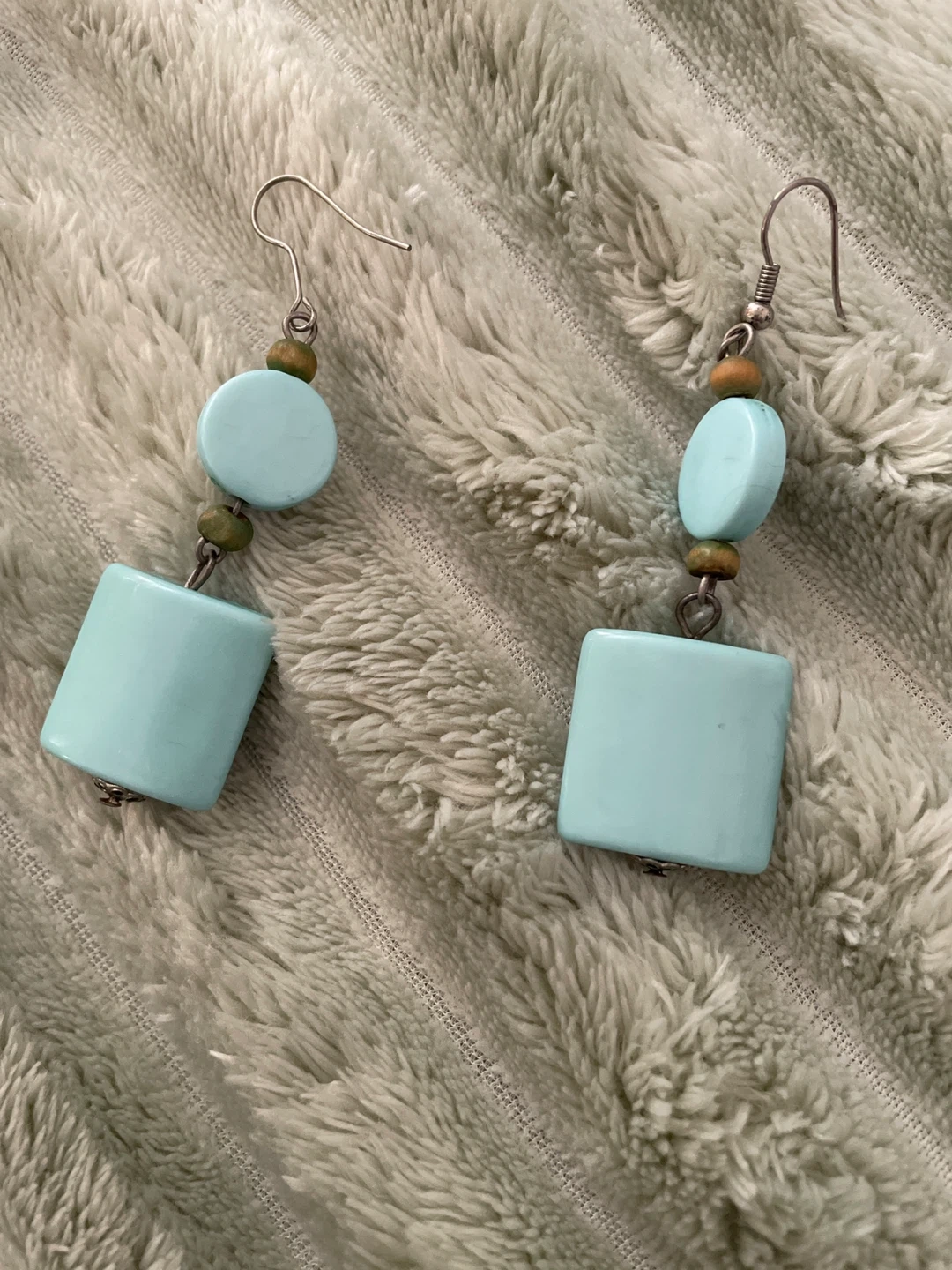 These earrings feature light blue beads in round and square shapes. They're accented with small wooden beads. Silver-tone fishhook closures.