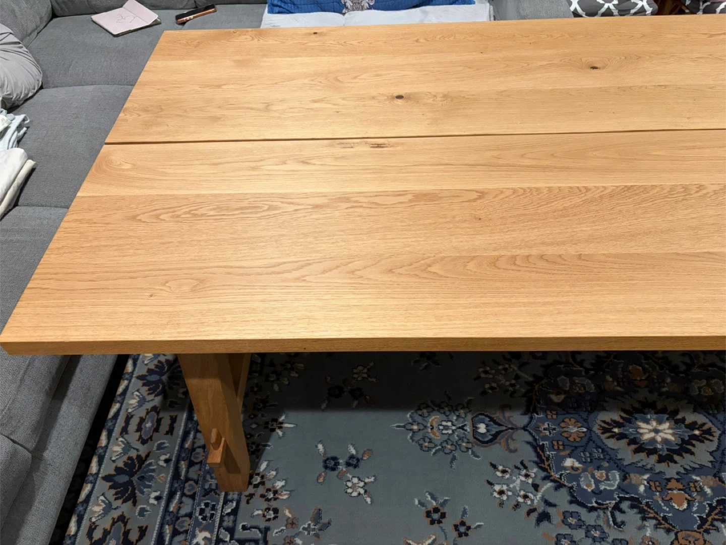 This is a solid oak dining table. It's made of natural wood with a simple, sturdy design. The tabletop consists of two planks. It's a great size for family meals!