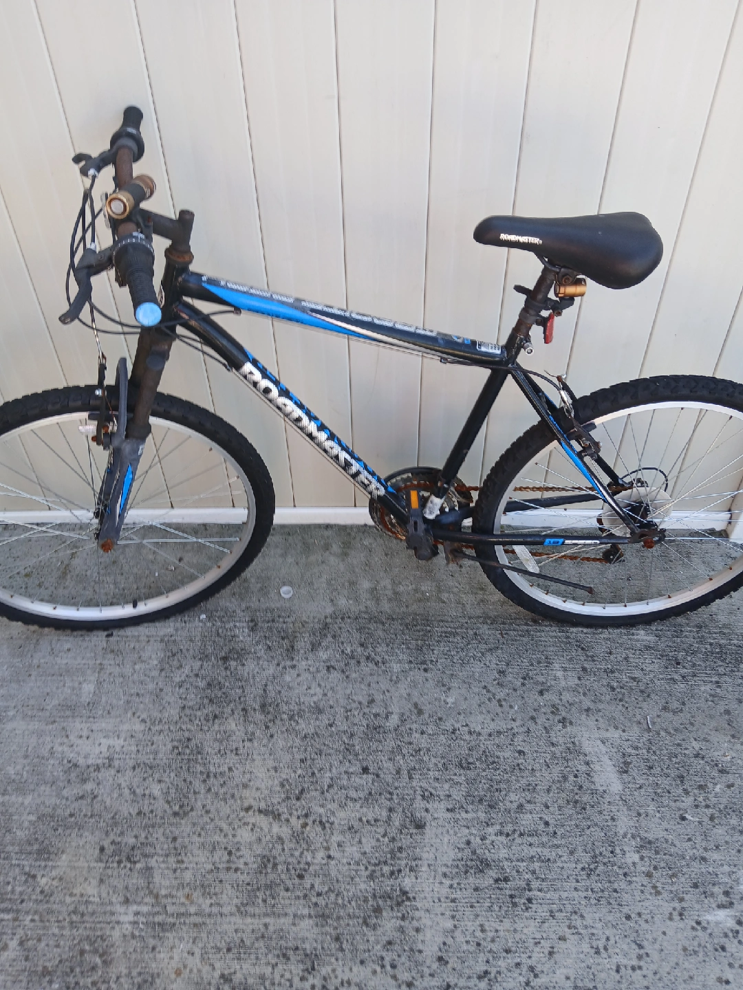 10Roadmaster mountain bike in used condition. It has a black frame with blue accents. The tires are in good shape.