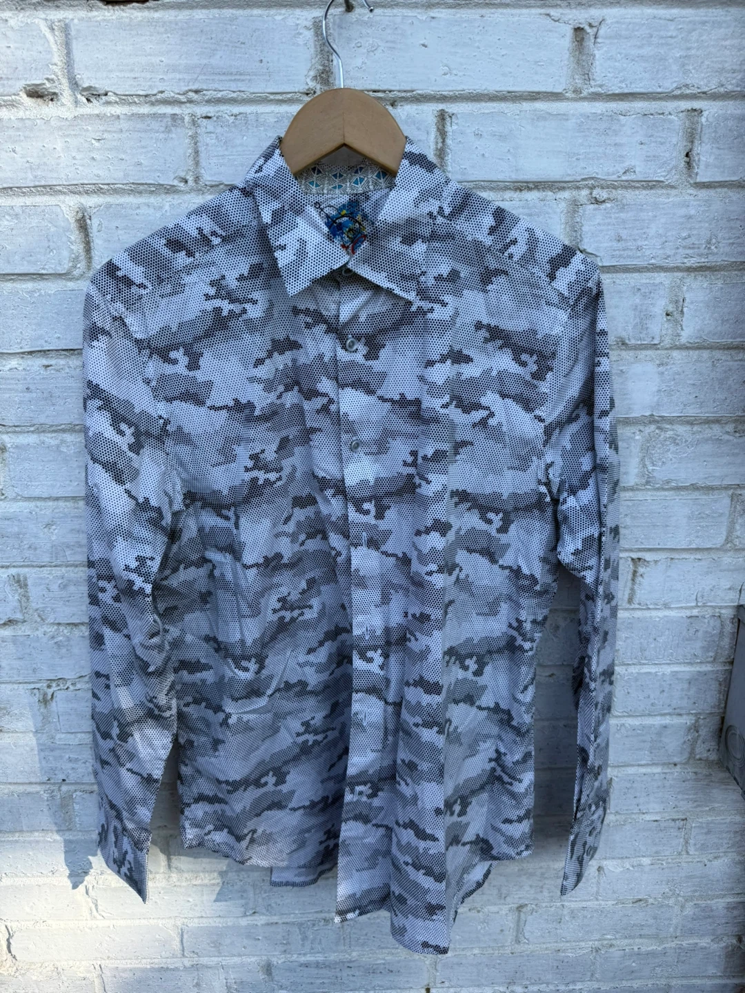 Here's a Robert Graham button-down shirt in size M! It features a classic fit and a unique camo-like pattern. The shirt is made in India and has a cool design on the inner collar.