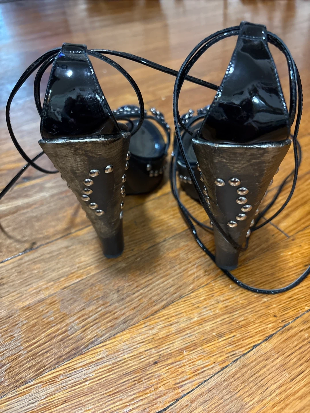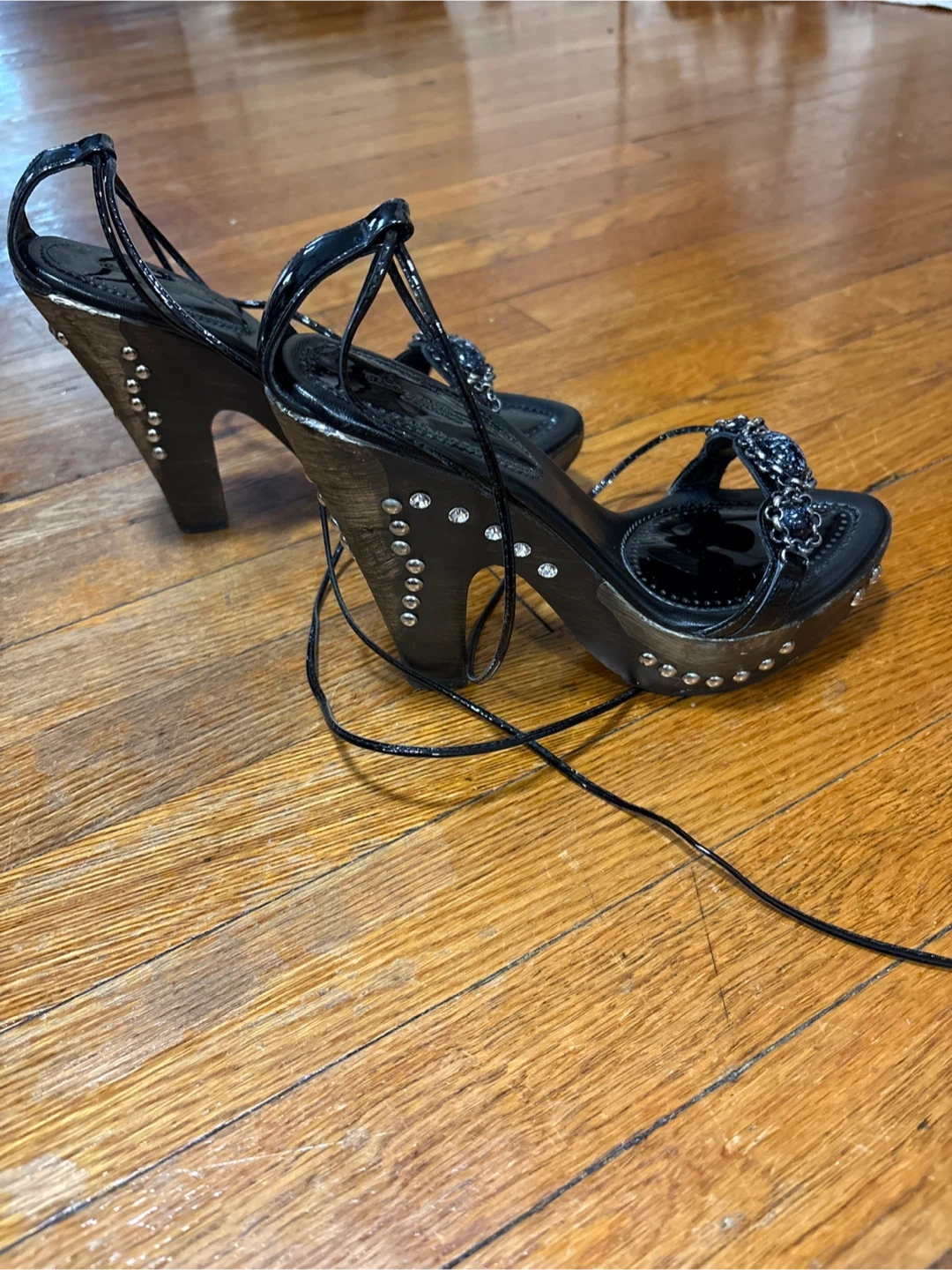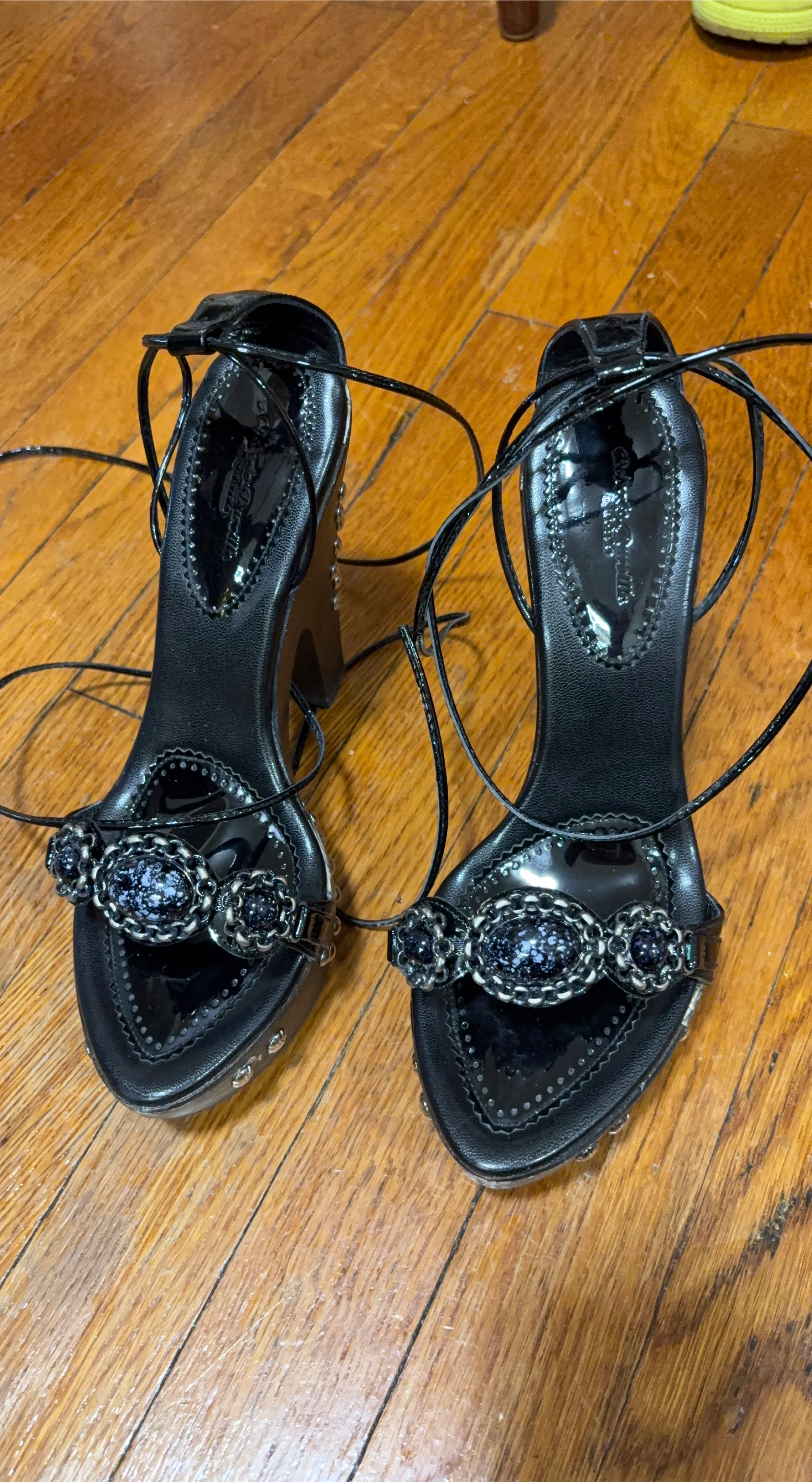 Roberto Durville patent leather heels. They feature a unique design with studded heels and embellished straps. Chunky wooden heel and platform. These heels are perfect for adding a touch of elegance to any outfit!