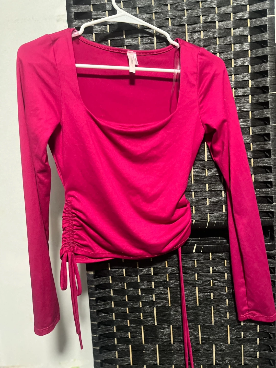 This is a hot pink long sleeve top with a square neckline. It features ruched detailing on the sides with adjustable drawstrings for a customizable fit. The fabric is stretchy and comfortable.