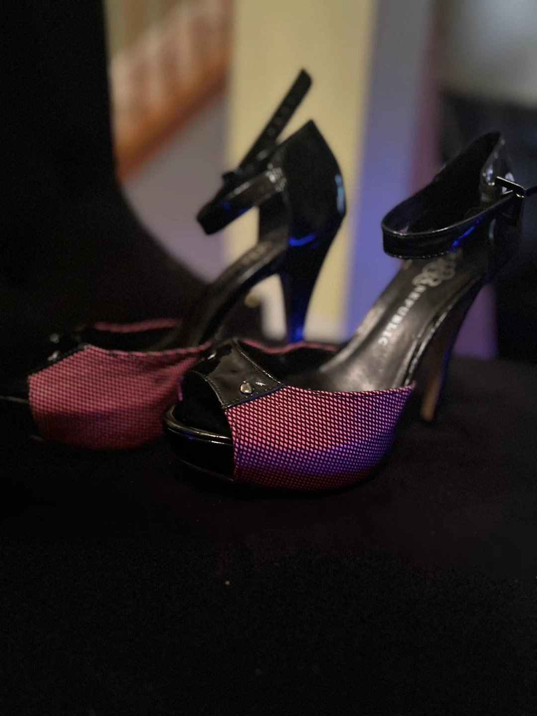 10Rock & Republic heels in black and pink. They have a peep toe and ankle strap. Great for a night out