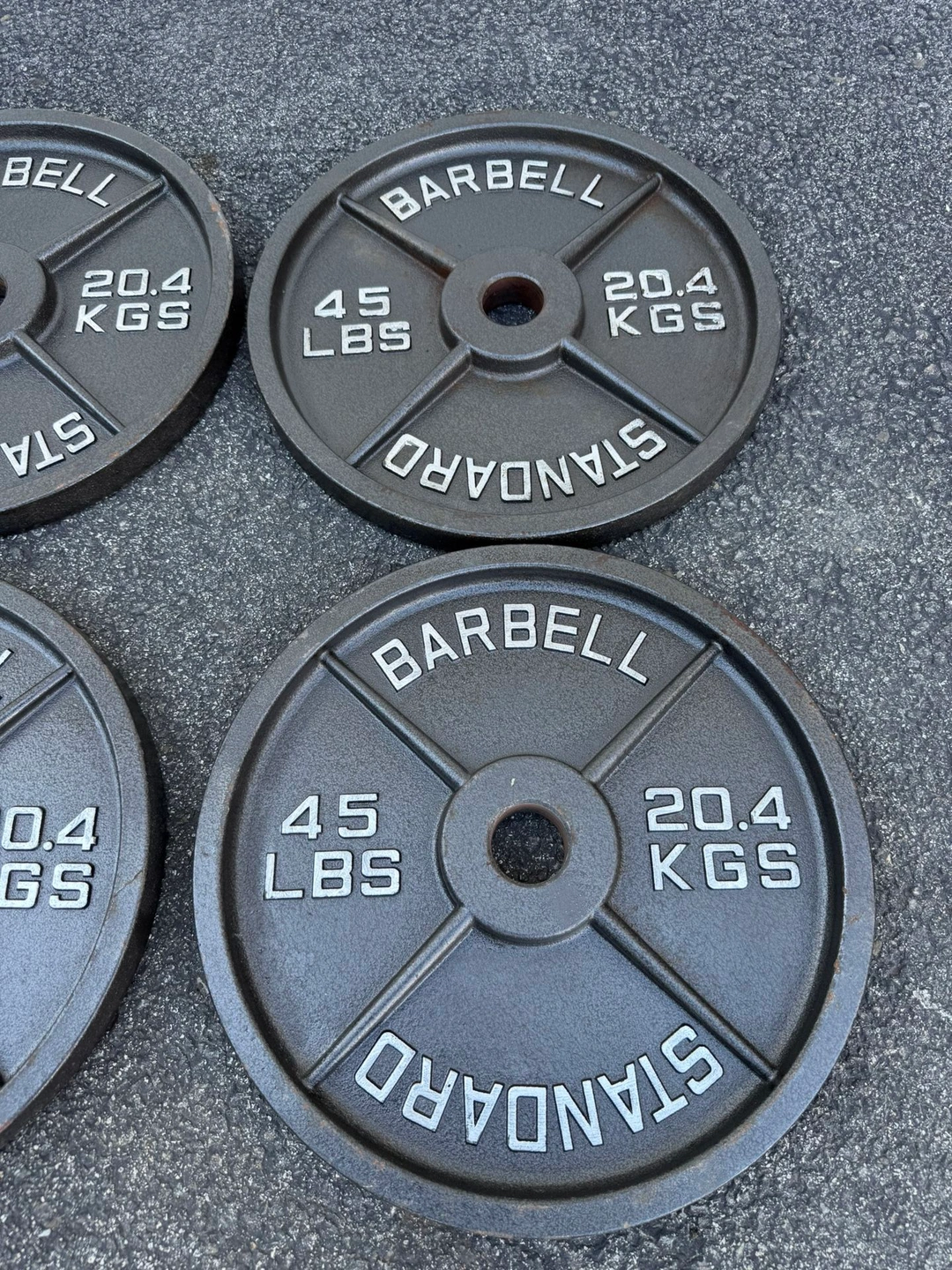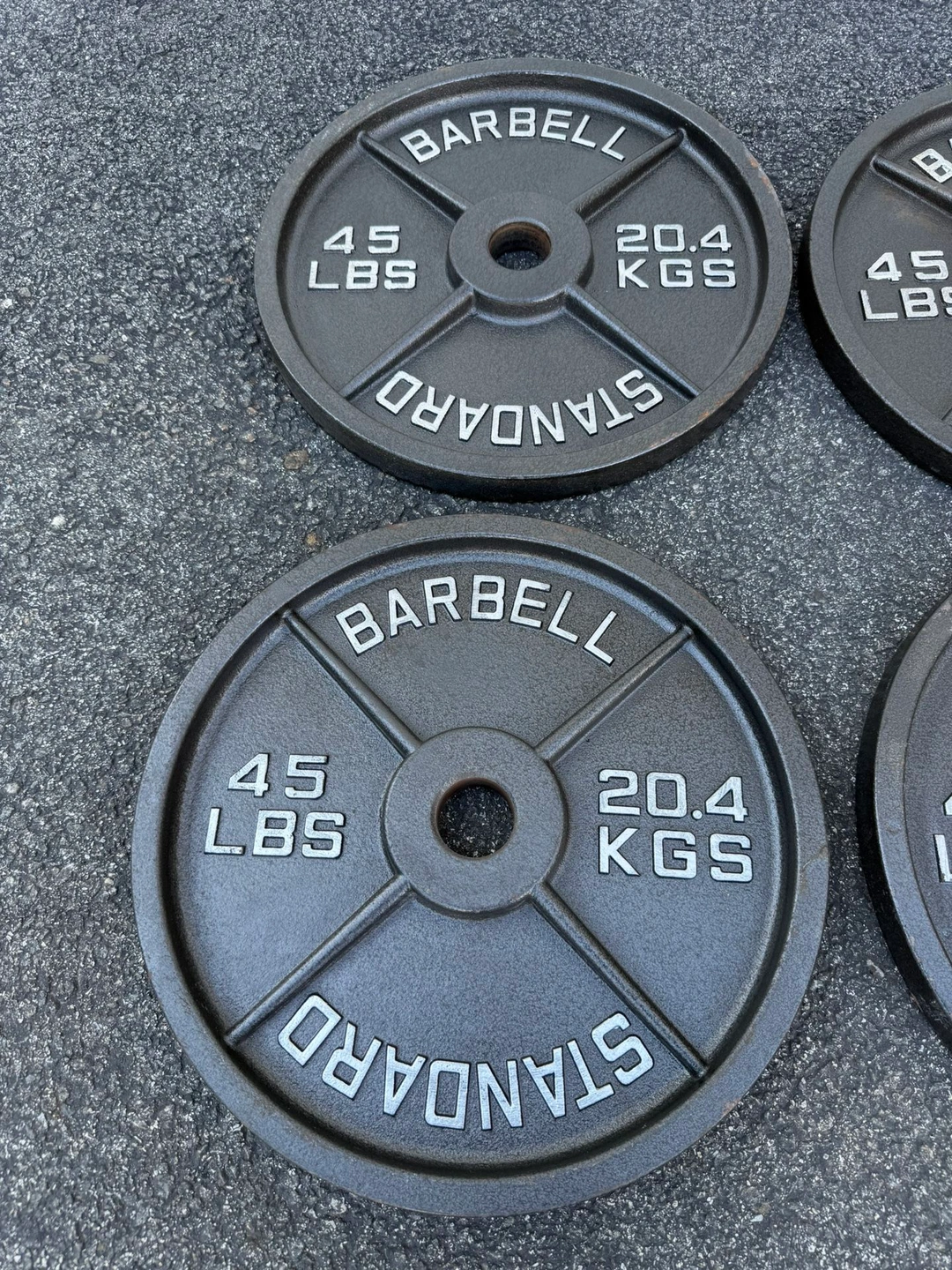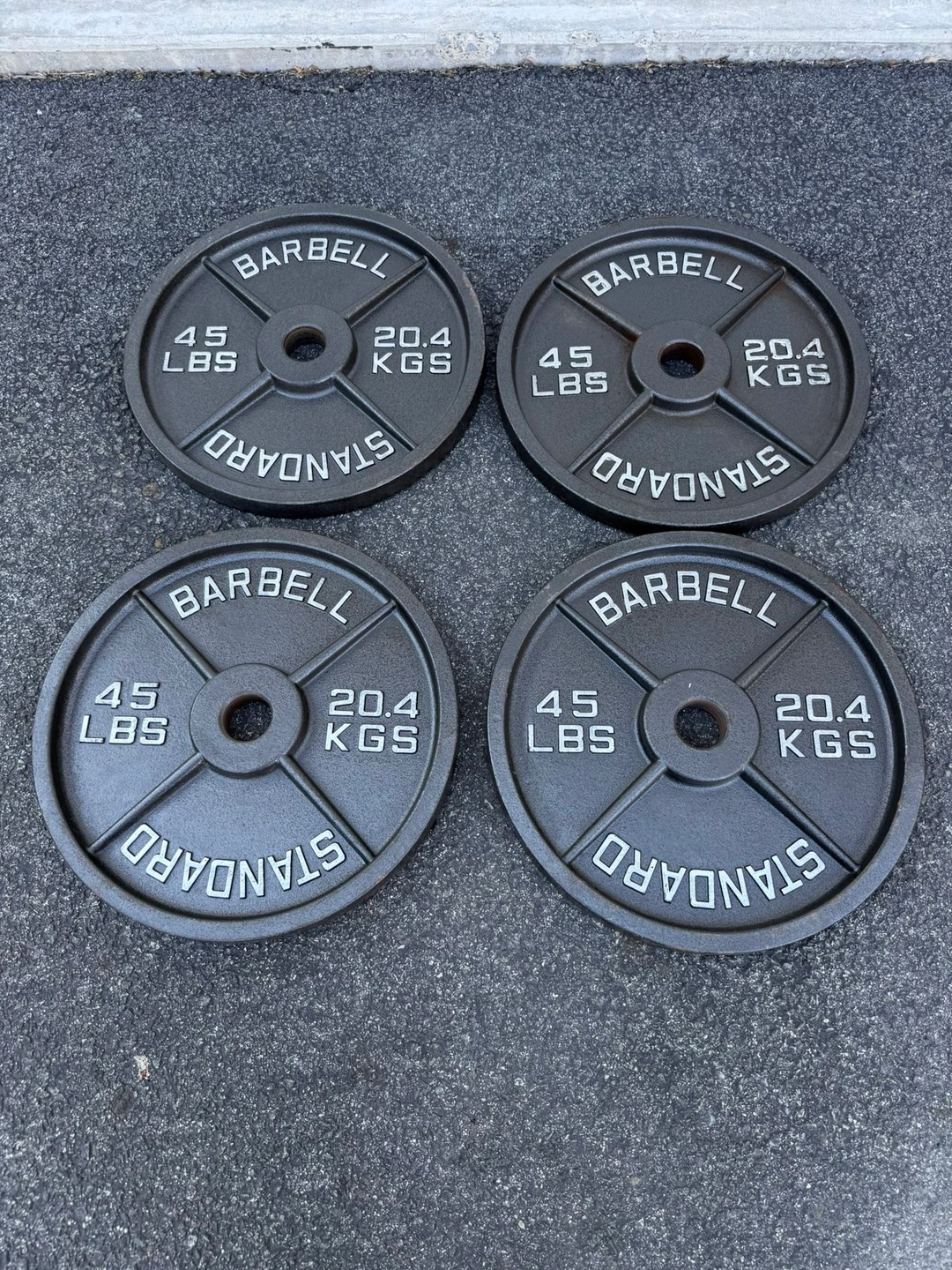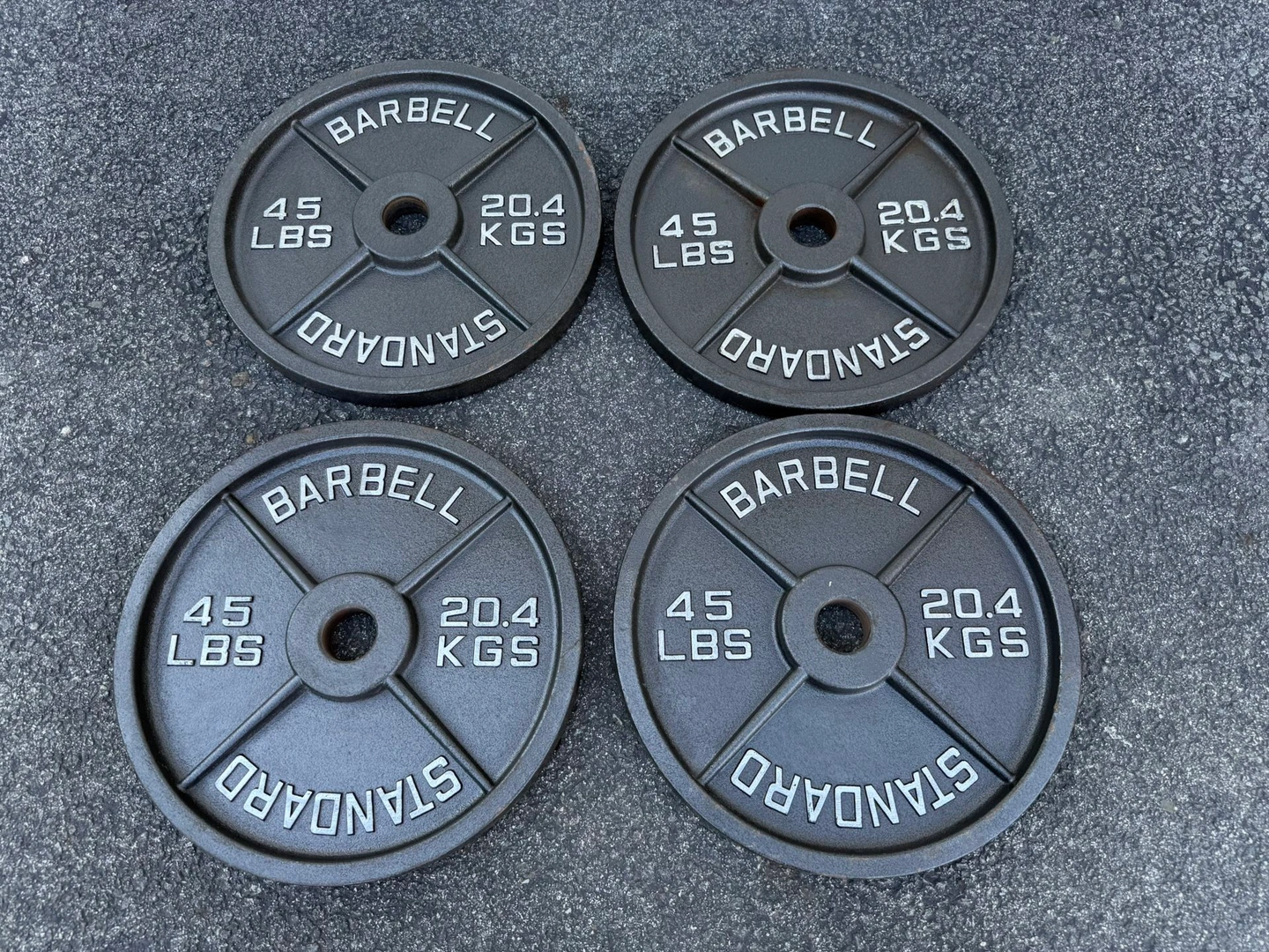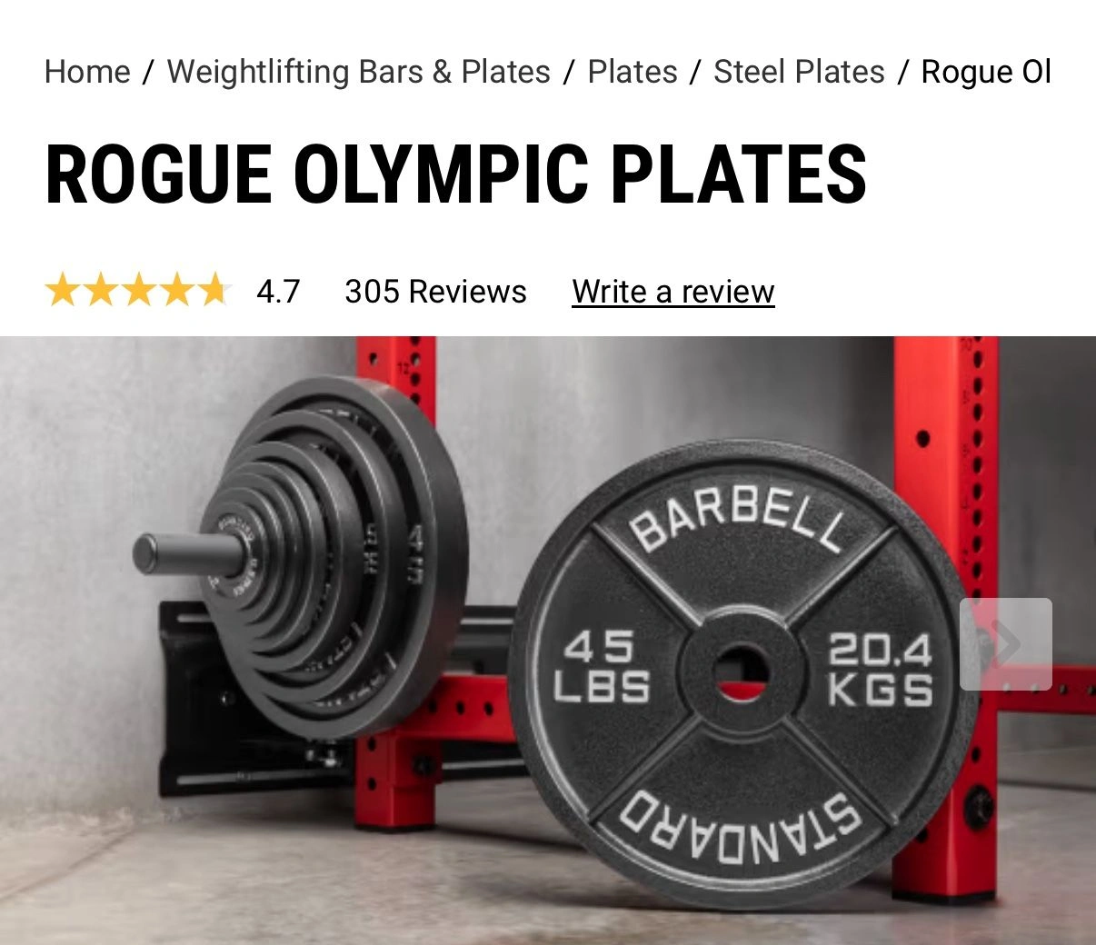 15Two pairs of 45s Rogue Fitness steel Olympic weight plates Classic BARBELL STANDARD design Type: Olympic Brand: Rogue