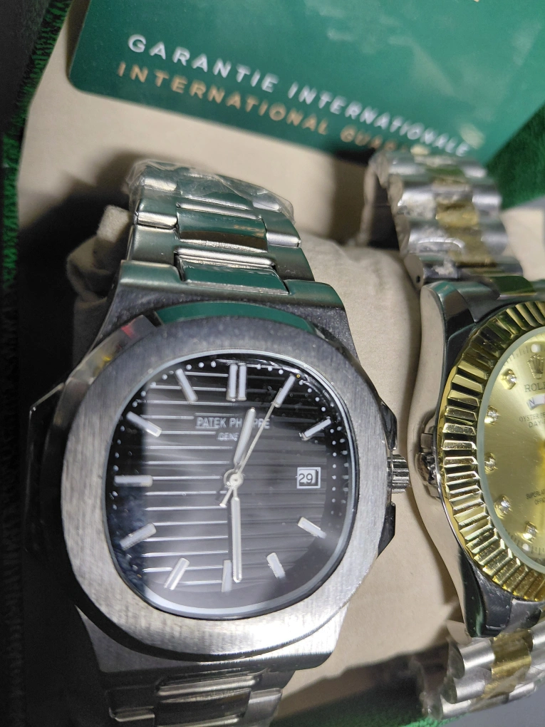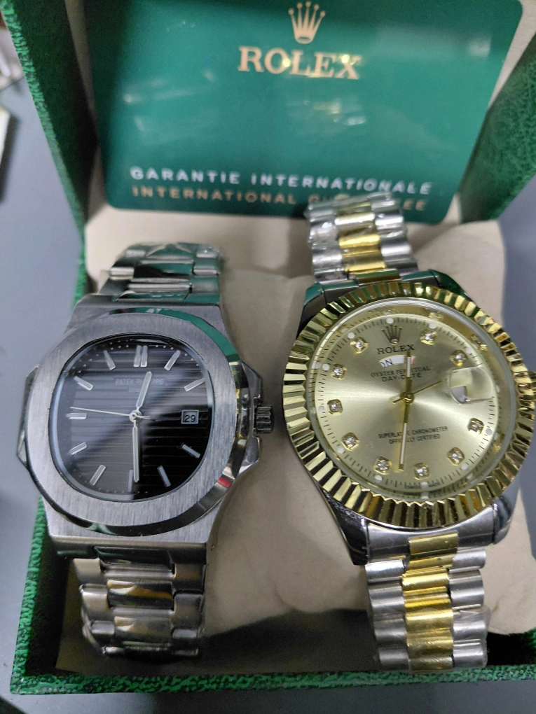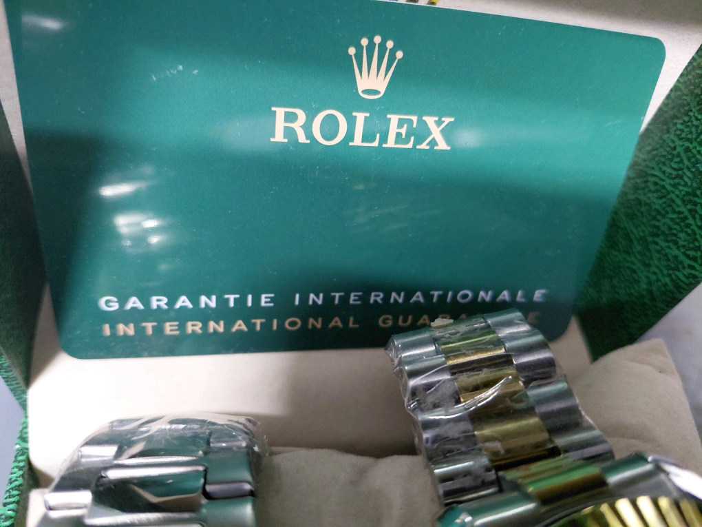 Selling a Rolex Oyster Perpetual Day-Date watch. It features a gold dial with diamond hour markers and a two-tone stainless steel and gold bracelet. Comes with its box