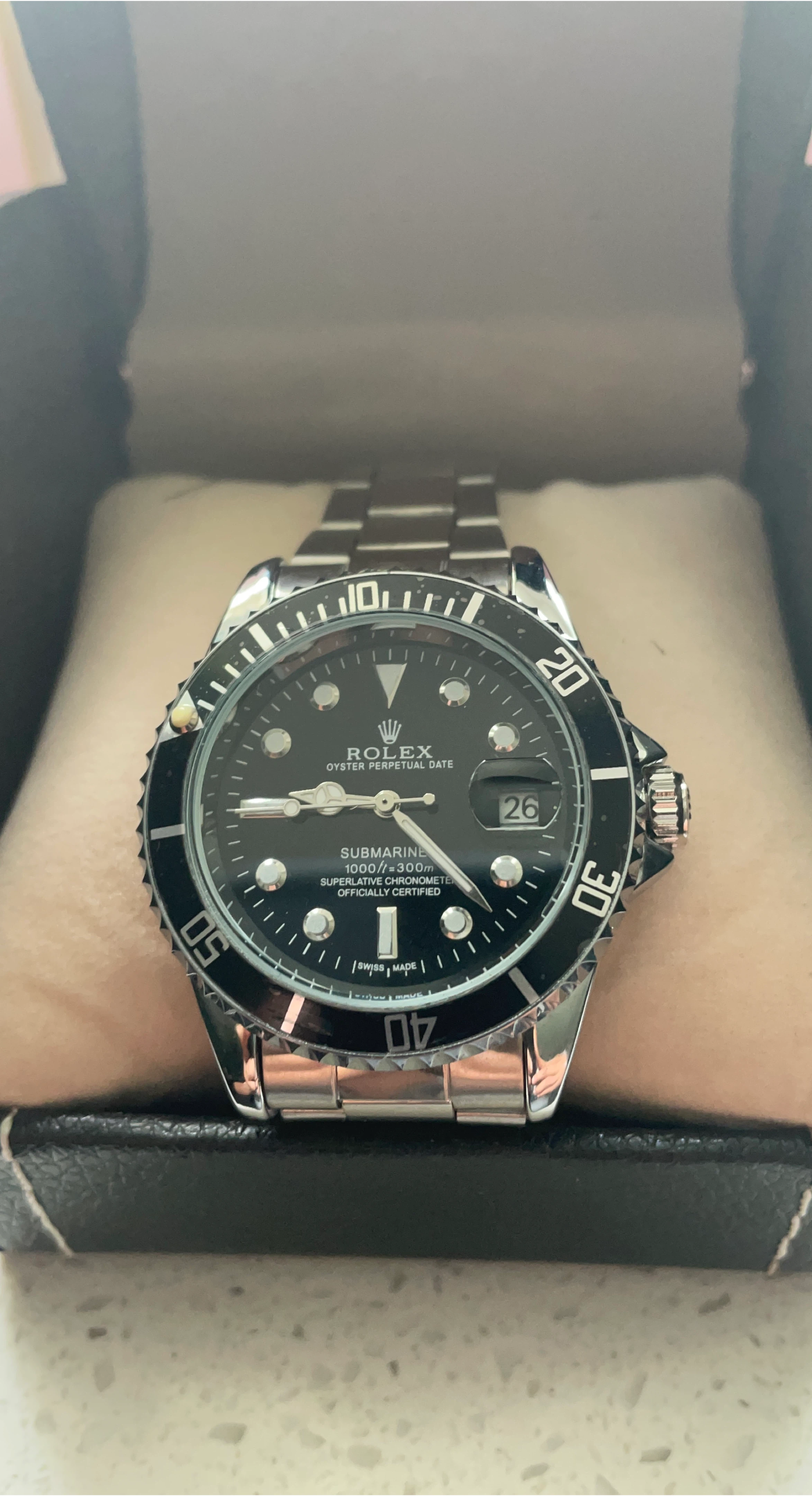 Selling a Rolex Submariner Oyster Perpetual Date watch. It's in good condition and comes with its box. A classic timepiece!
