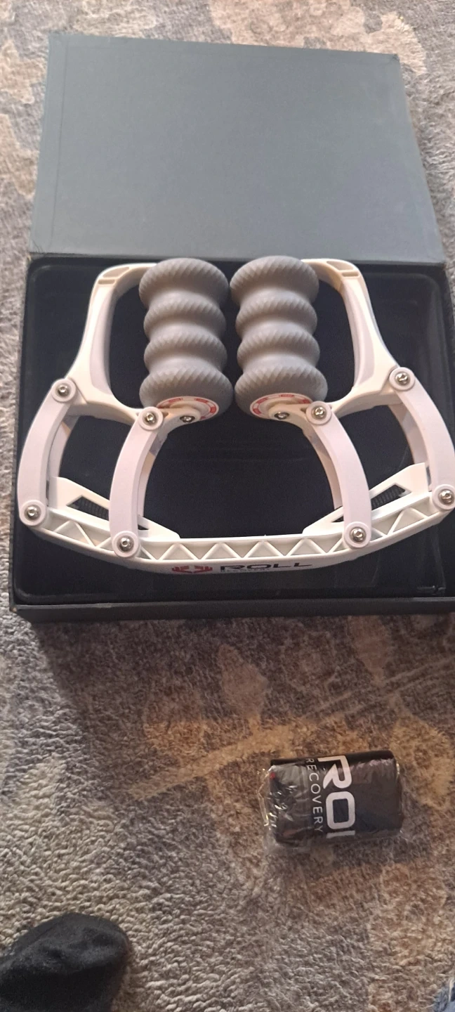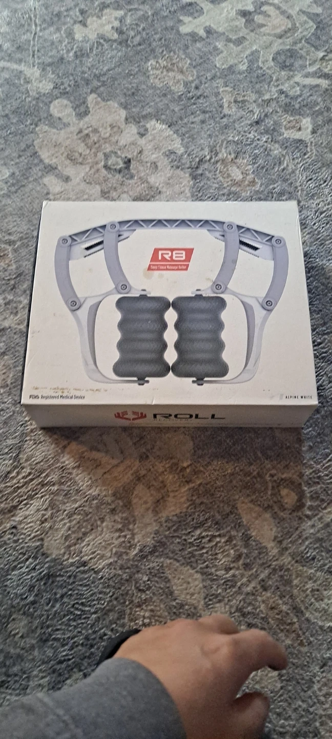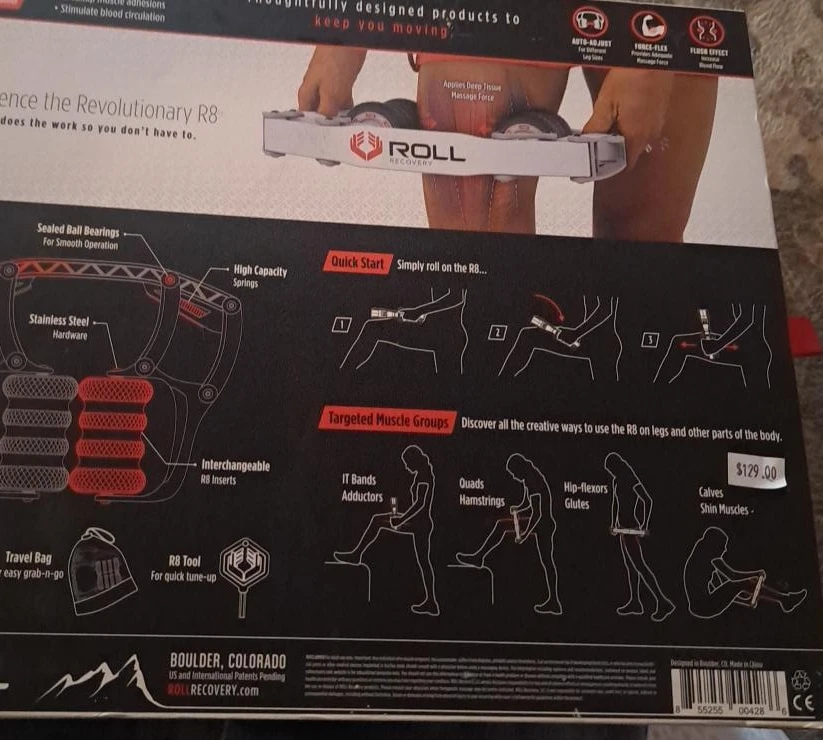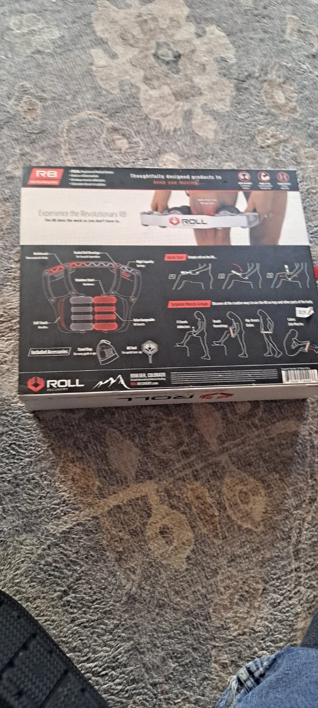 10Selling a ROLL RECOVERY R8 deep tissue massage roller. It's designed to stimulate blood circulation and release muscle adhesions. It has sealed ball bearings for smooth operation and high-capacity springs. The box includes a travel bag and R8 tool for quick tune-ups. Originally priced at $129