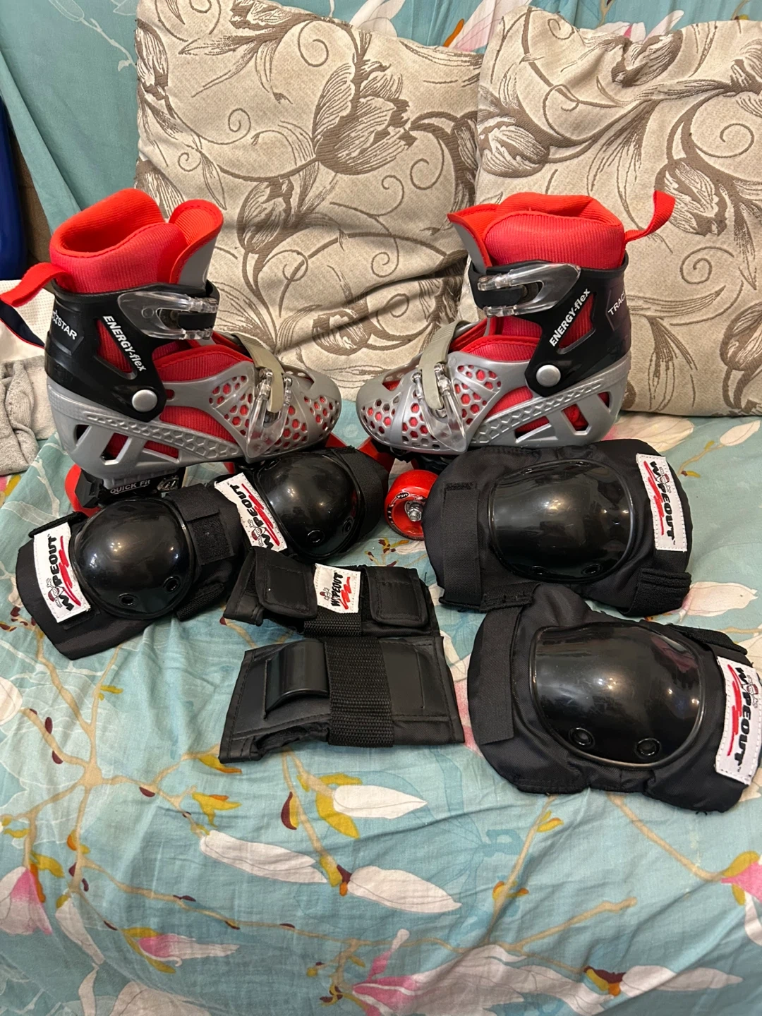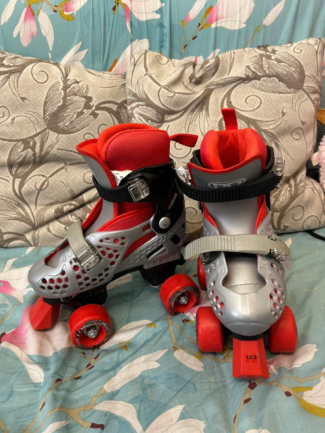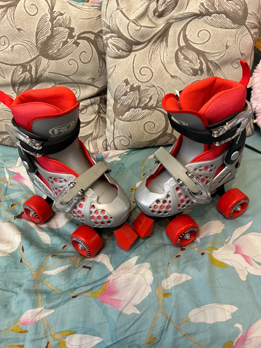 Selling a pair of Roller Derby Tracer adjustable roller skates in red and silver! They come with a set of pads, including knee pads, elbow pads, and wrist guards. Great for beginners or anyone looking to enjoy some skating fun. Size 12-2 young kids