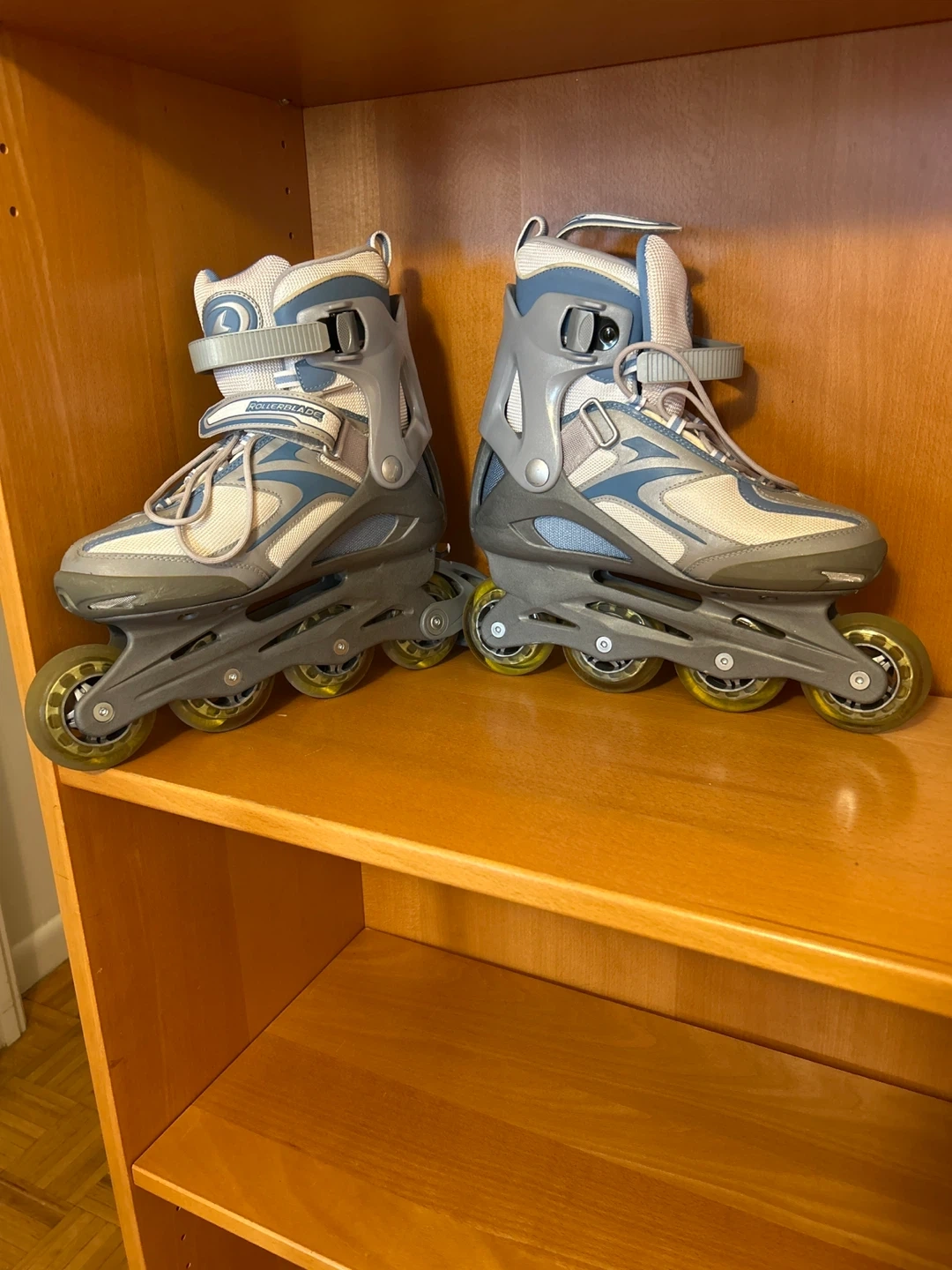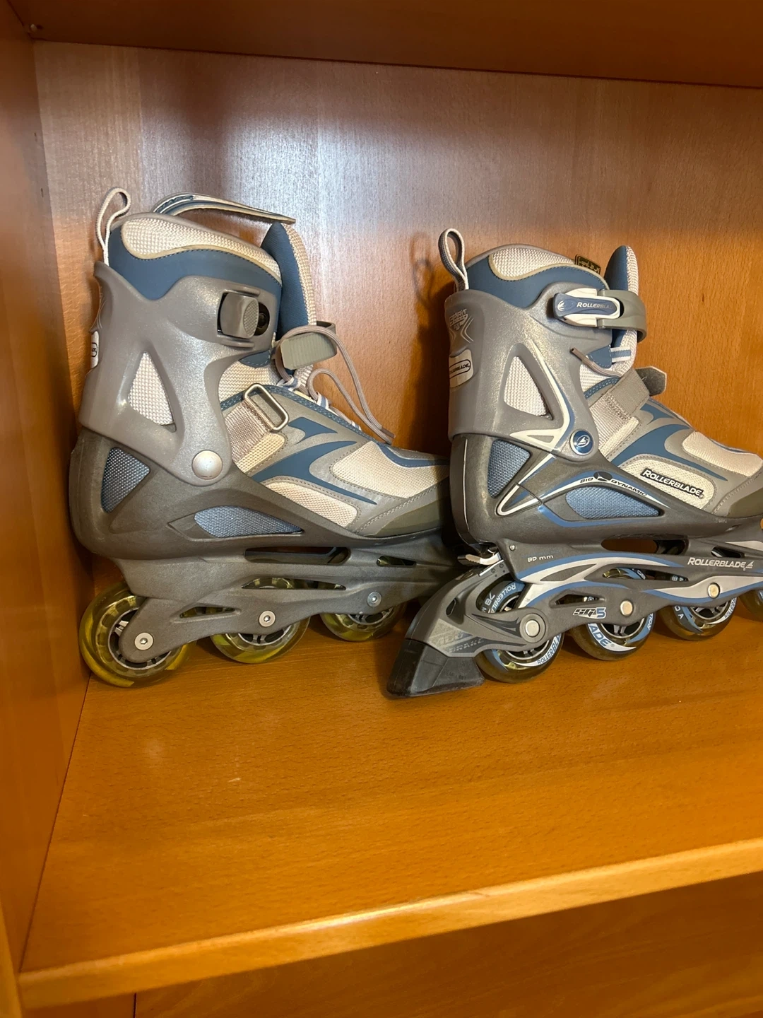 60Selling a pair of Rollerblade inline skates in good condition. They feature a gray, white, and blue color scheme. Perfect for recreational skating! US side 8