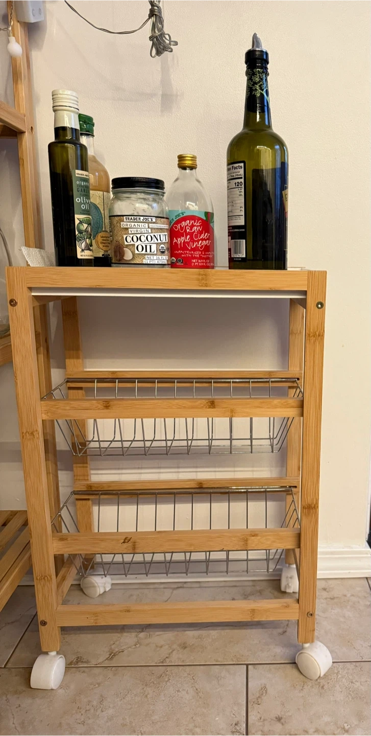 I'm selling a rolling cart with three wire baskets. It's perfect for adding extra storage to your kitchen, bathroom, or any room in your home. The cart is in great condition and ready for a new home