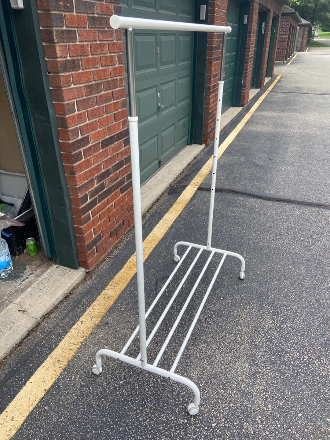 White metal frame. Includes a bar for hanging items. Features a bottom shelf for storing shoes. Using this item can greatly help you organize your closet space, which will bring a feeling of peace. Have two. Each $8.
