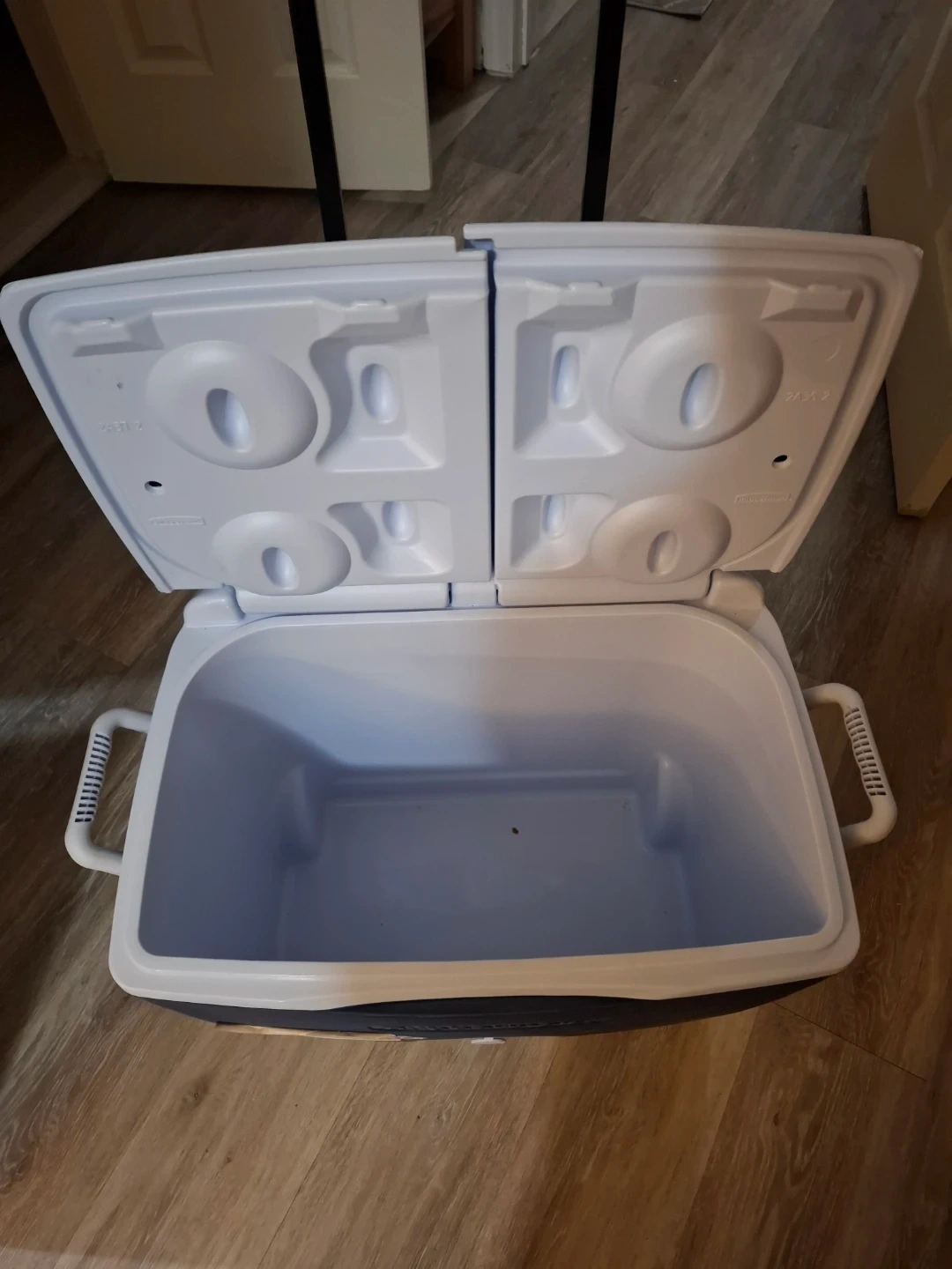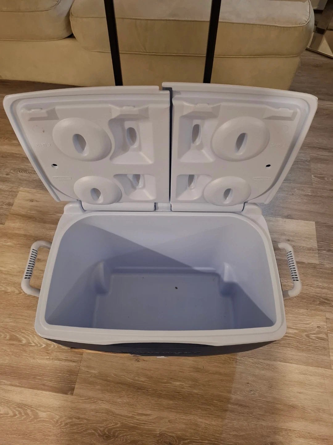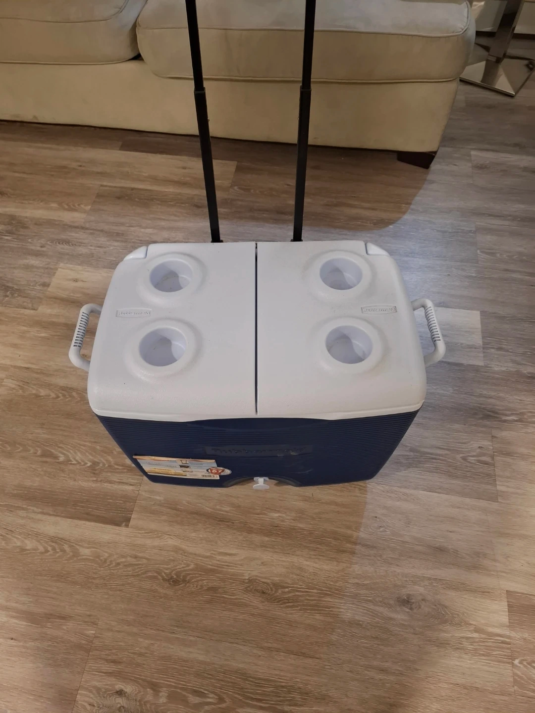 86I'm selling a rolling cooler that's perfect for outdoor events, picnics, or just keeping your drinks cold on a hot day! It features convenient cup holders on top and a retractable handle for easy transport. It's in great condition and ready to use! Brand new never used!!