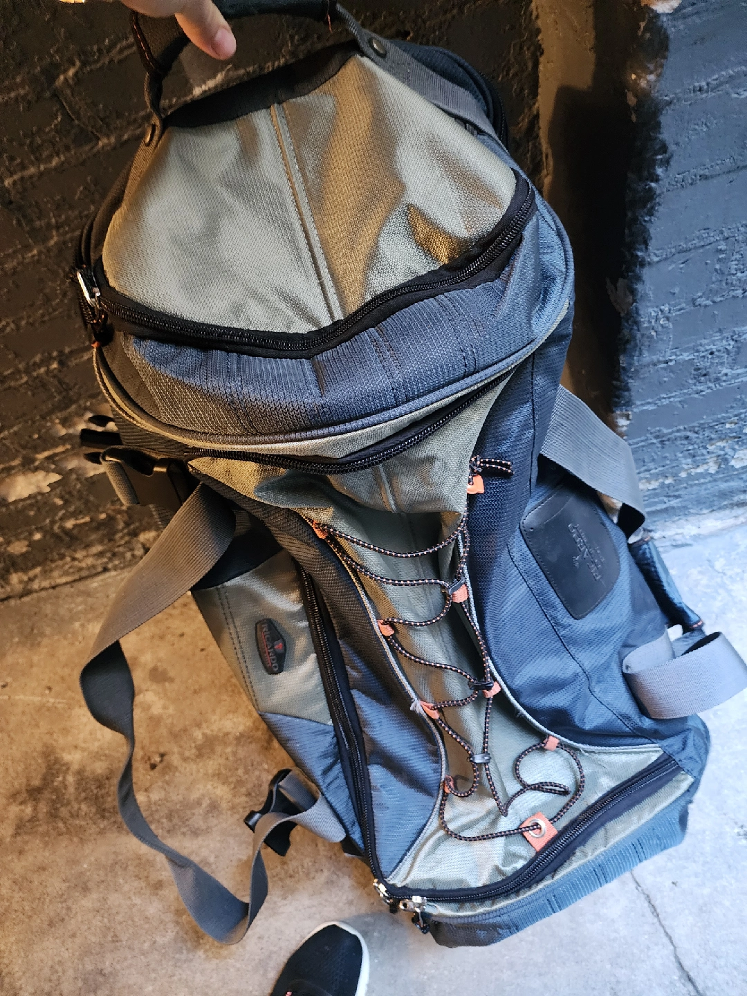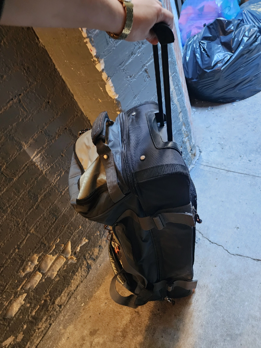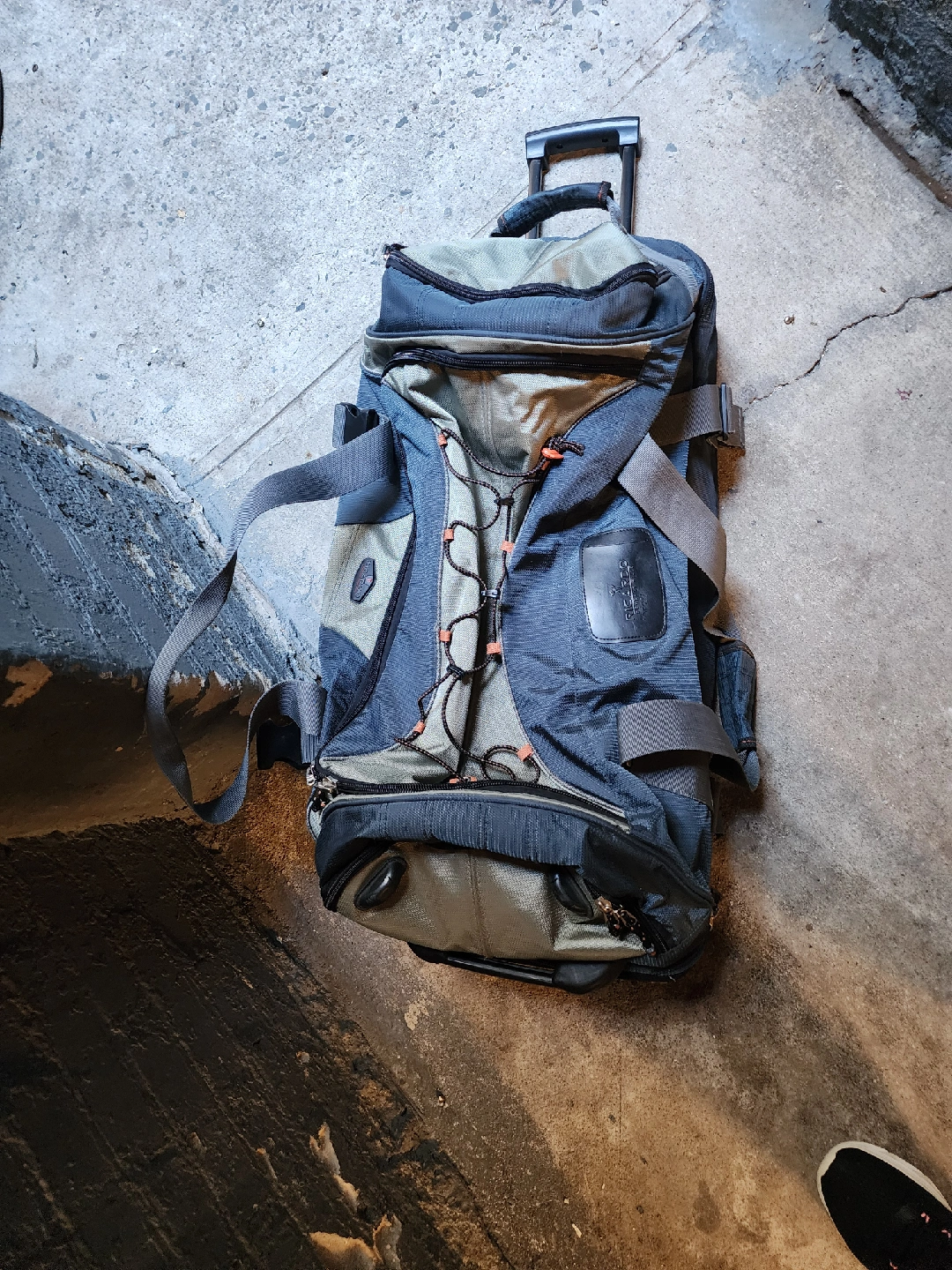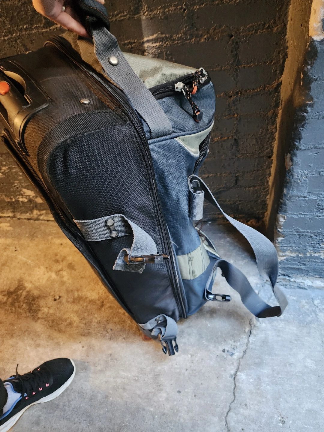 Selling a rolling duffel bag that's ready for your next adventure! It's a mix of gray and blue, with a convenient pull handle and sturdy wheels. Perfect for travel or storage!