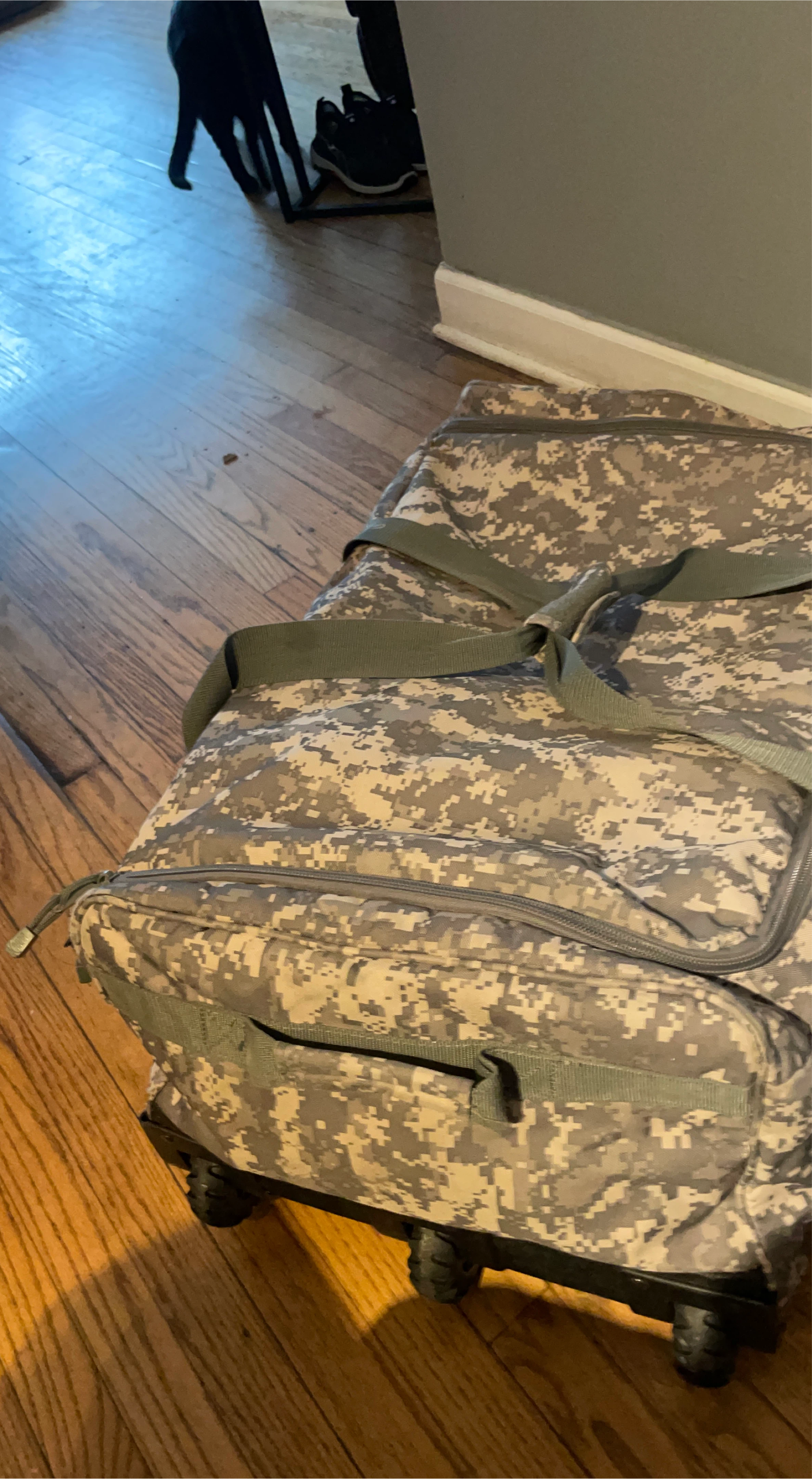 152Selling a rolling duffle bag with a camo pattern. It has wheels and a handle for easy transport. Perfect for travel or storage!