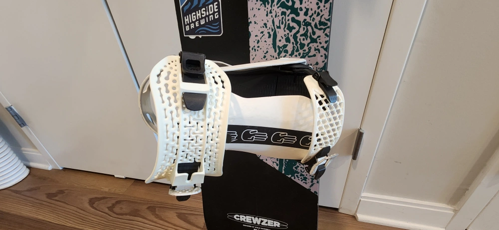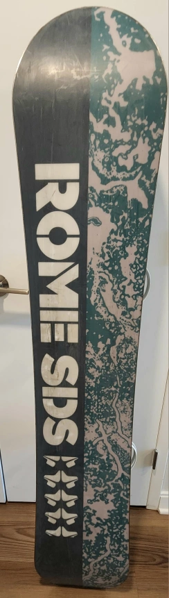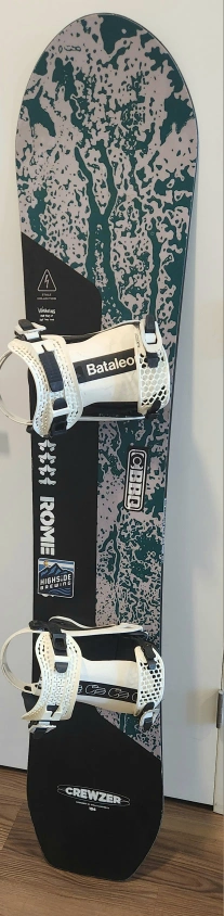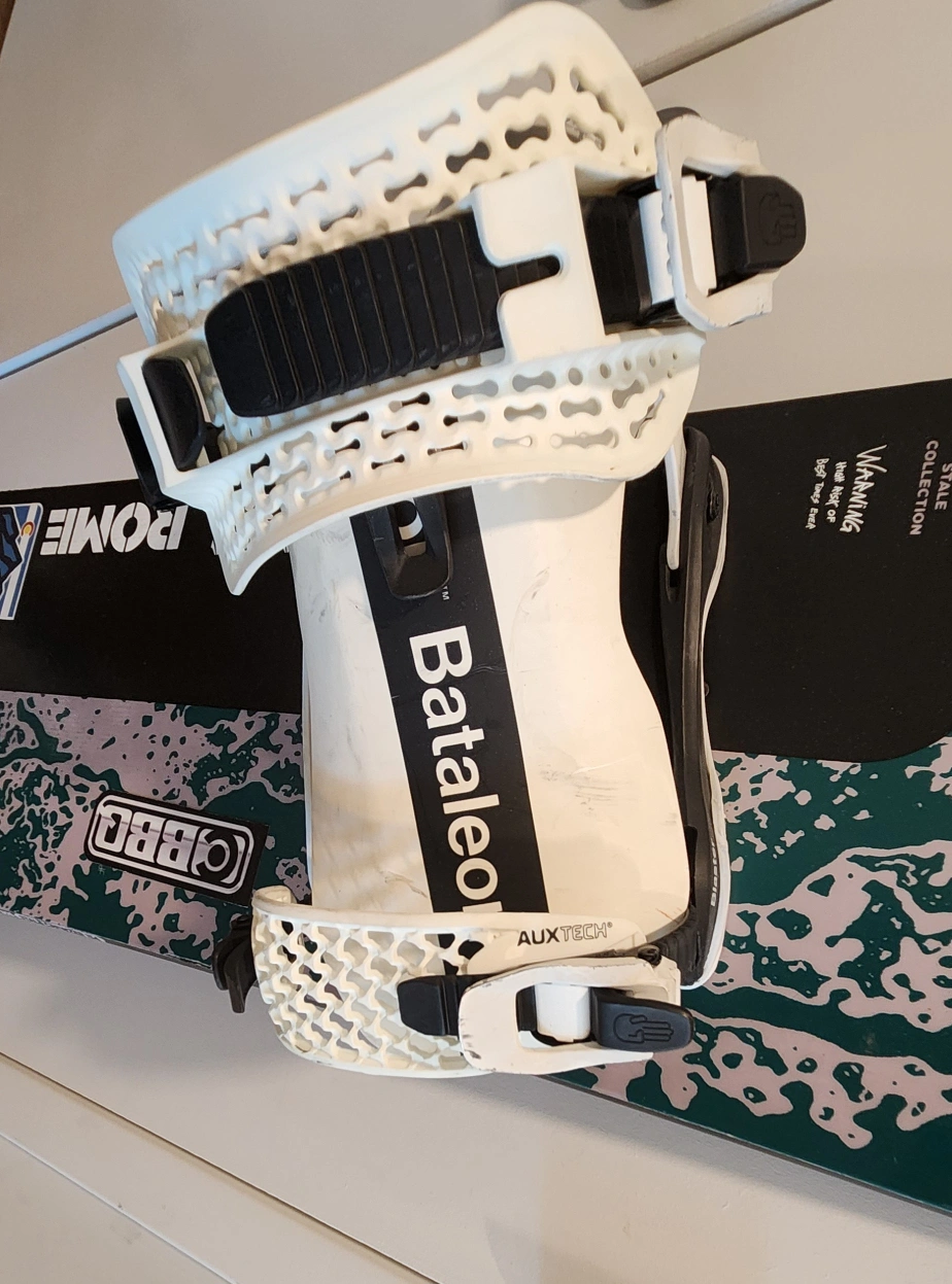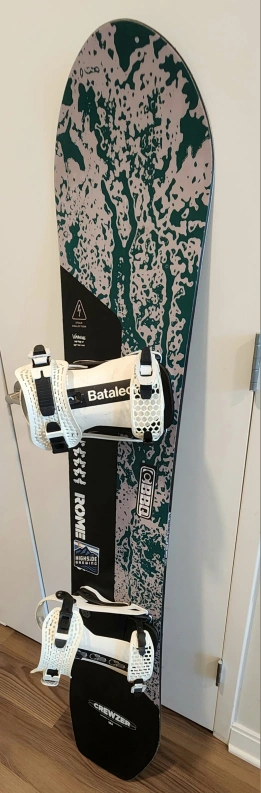 Selling a Rome SDS snowboard paired with Bataleon bindings! The bindings are white and feature AuxTech technology. The board has a unique design with green and black accents. Perfect for hitting the slopes!