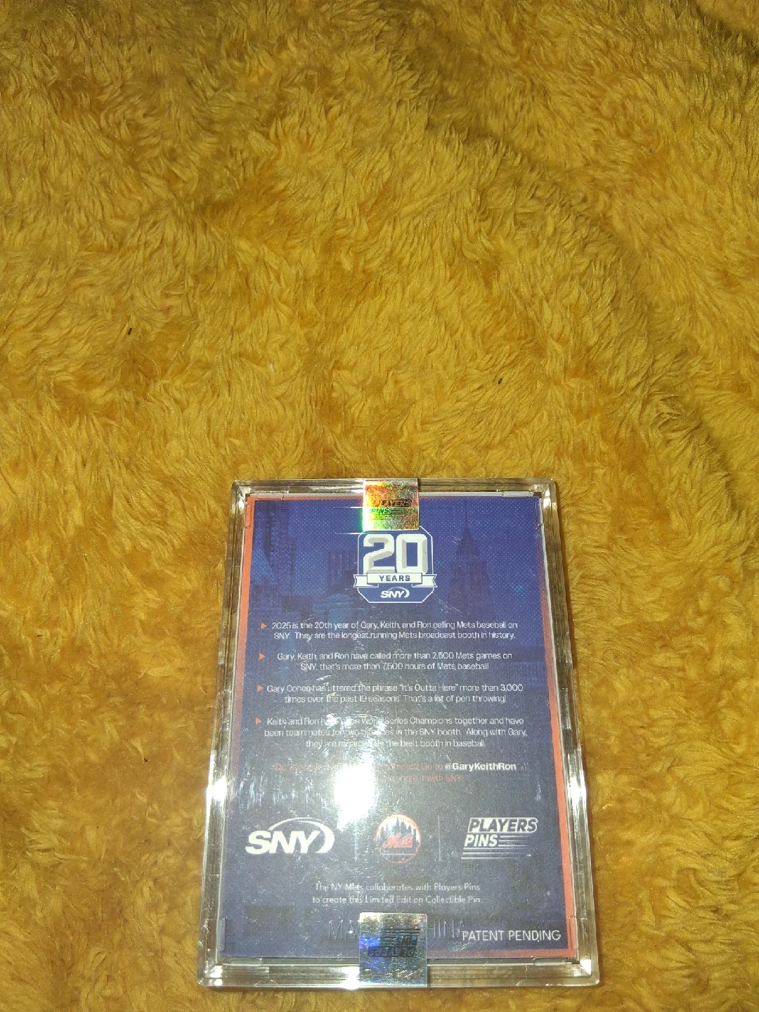 15Selling a limited edition collectible pin featuring Ron Darling! The pin commemorates the 20th year of Keith, Ron, and Ron calling Mets baseball on SNY. It's a great item for any Mets fan or collector
