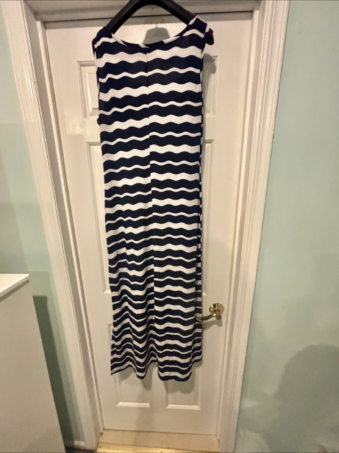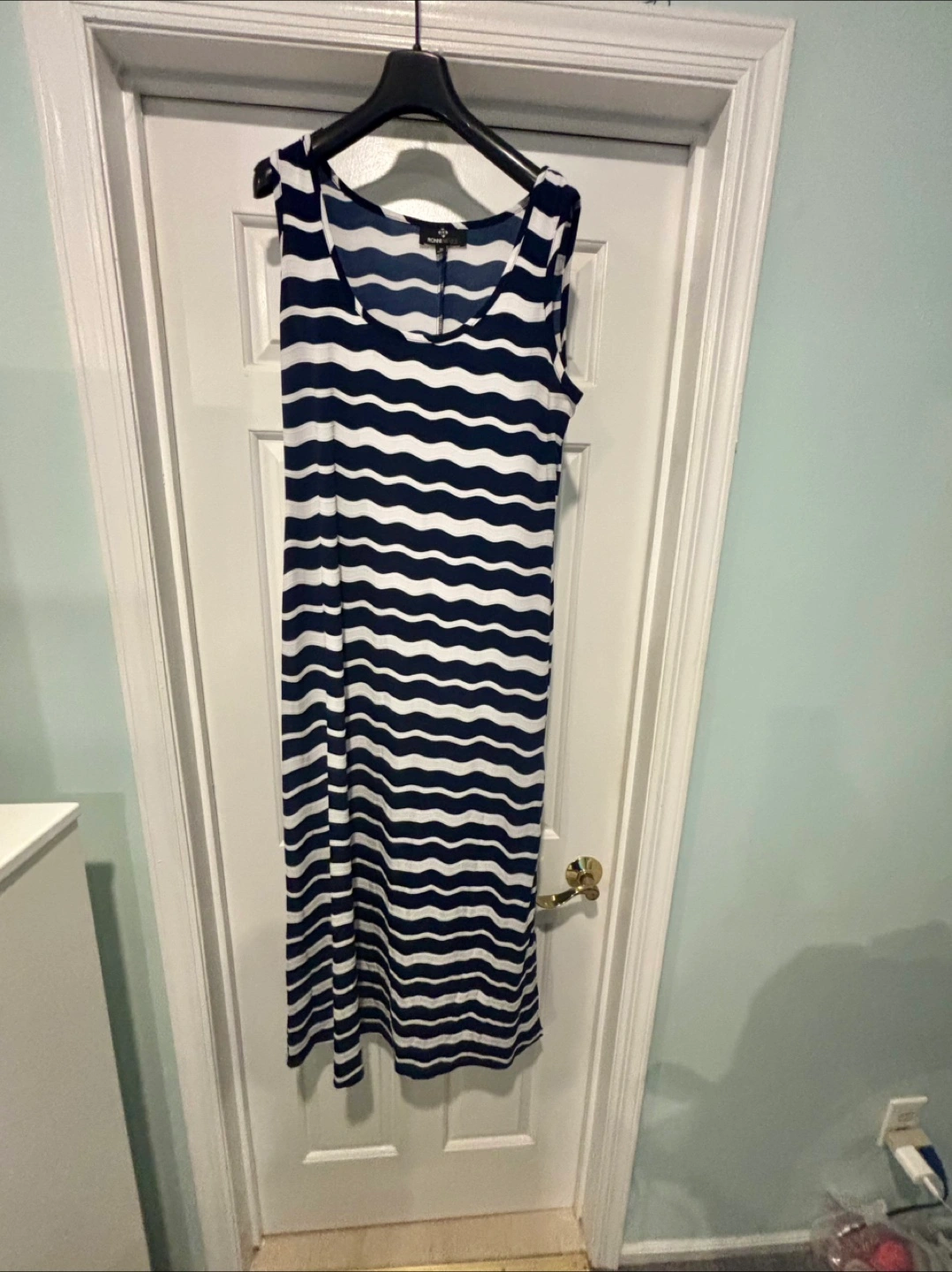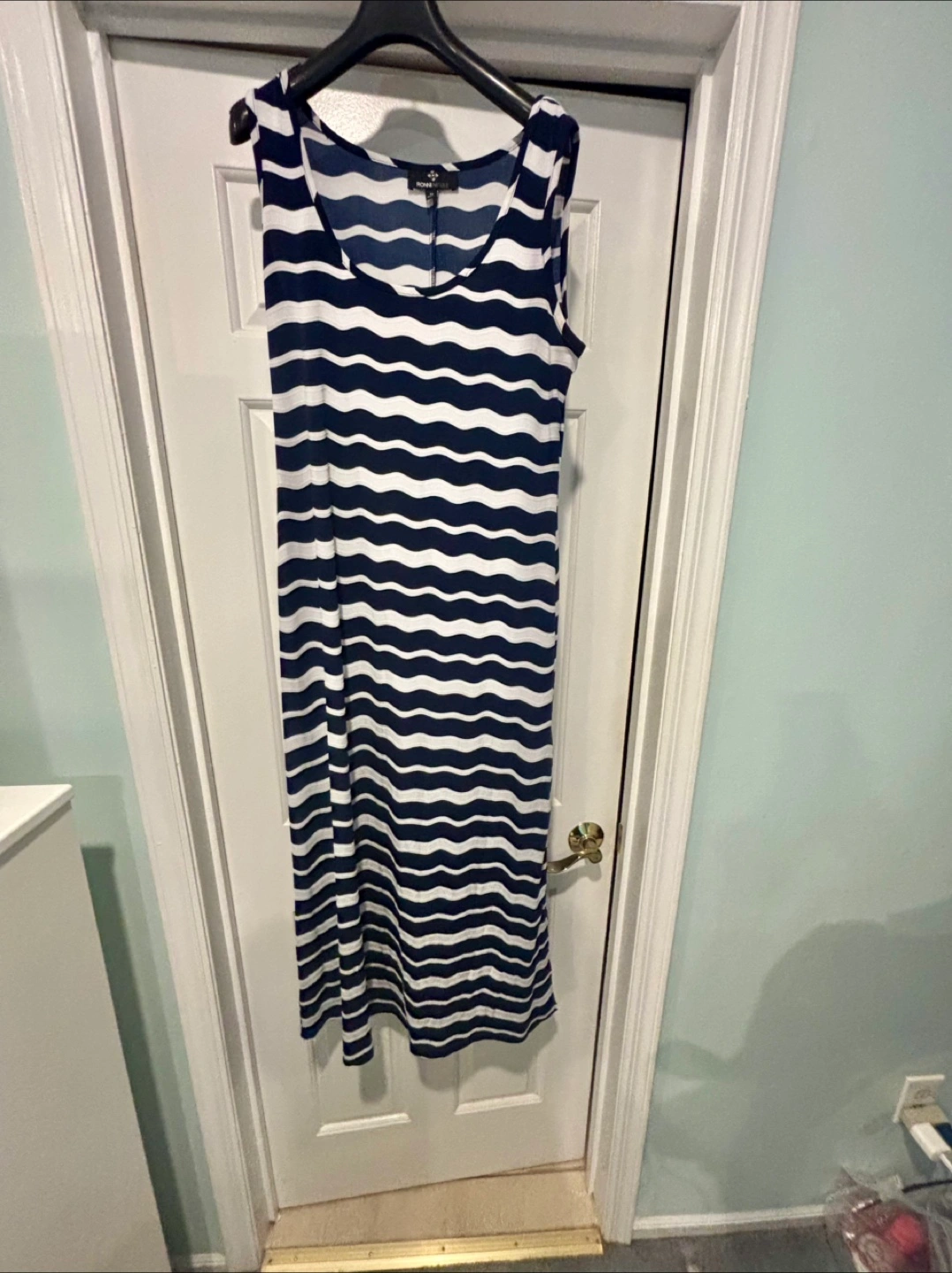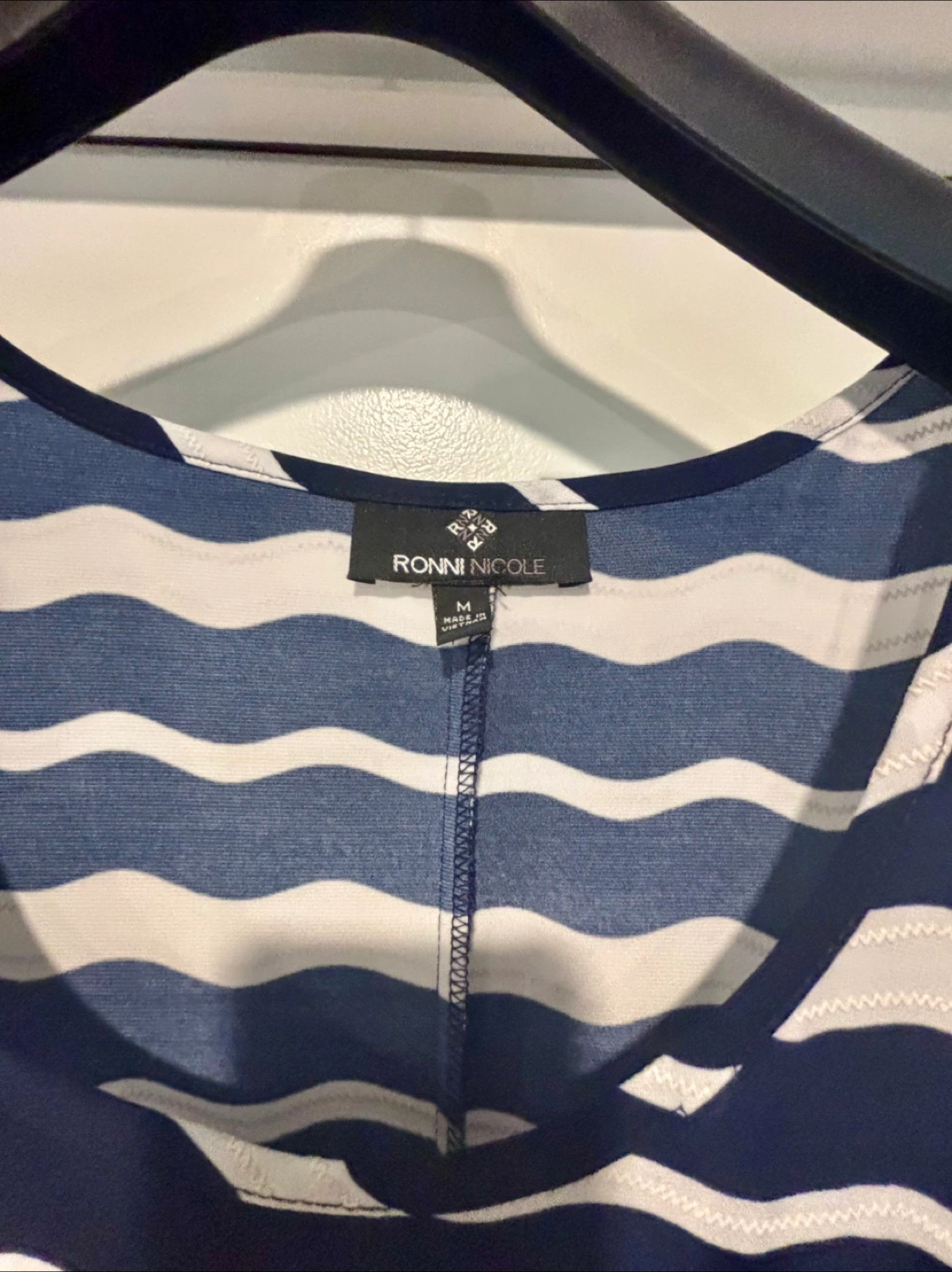 This is a Ronni Nicole dress in a size medium. It features a stylish blue and white striped pattern. Perfect for a casual day out!